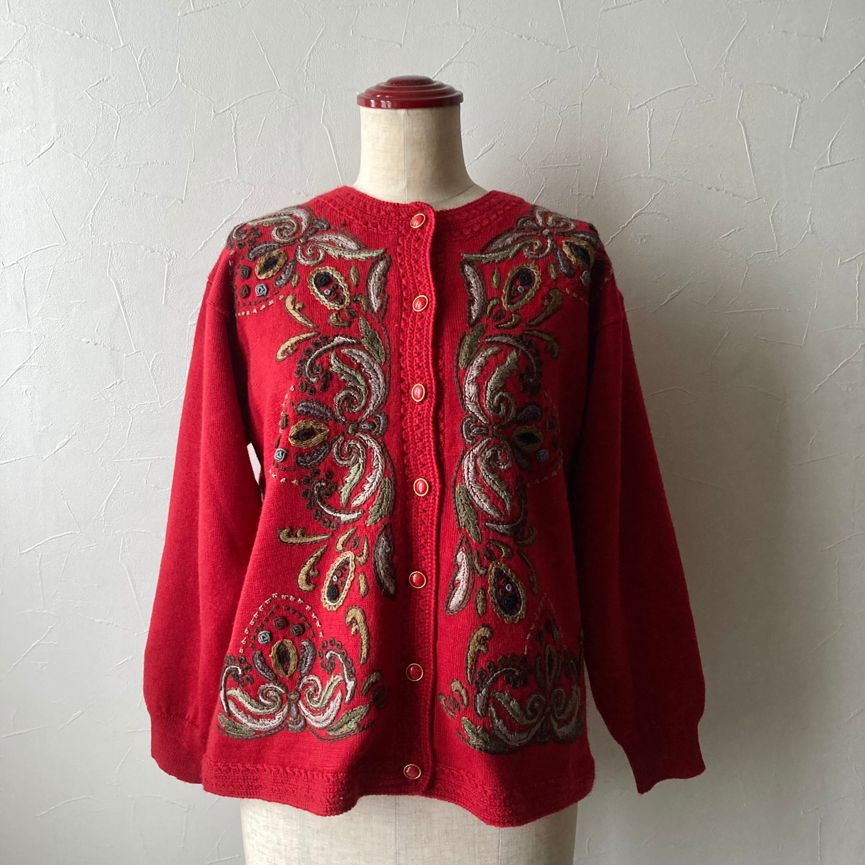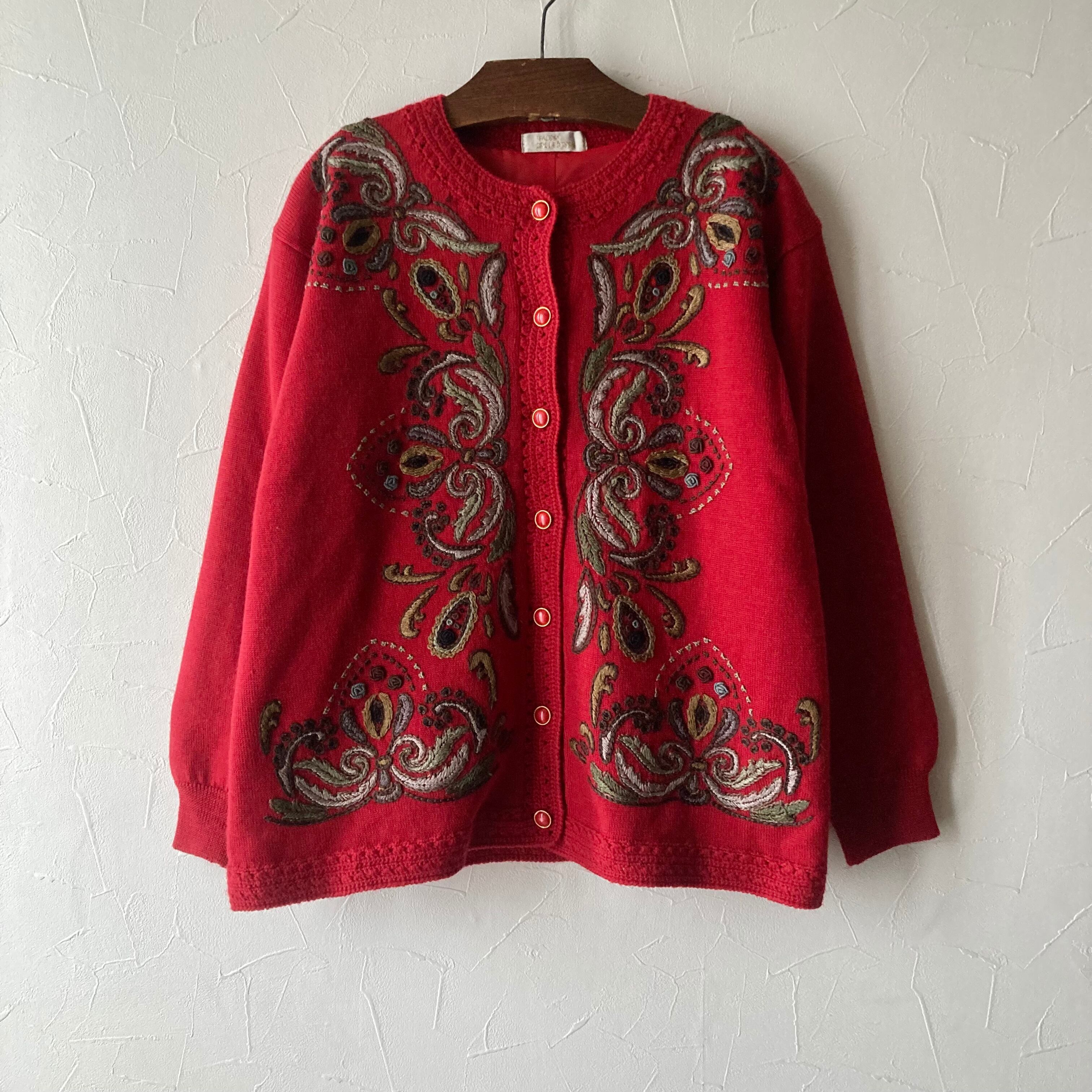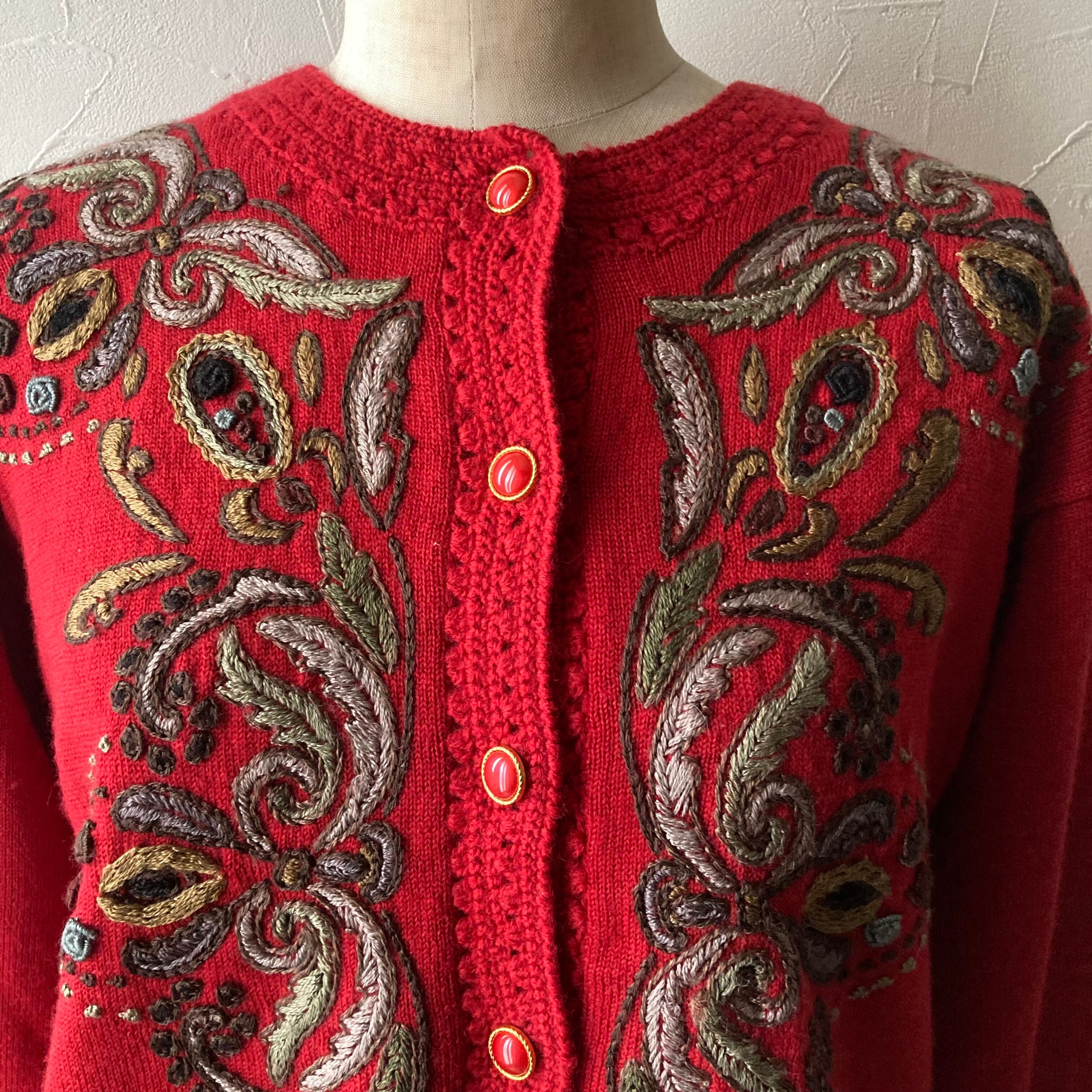 赤色刺繍裏地付きカーディガン 古着 used vintage レトロ