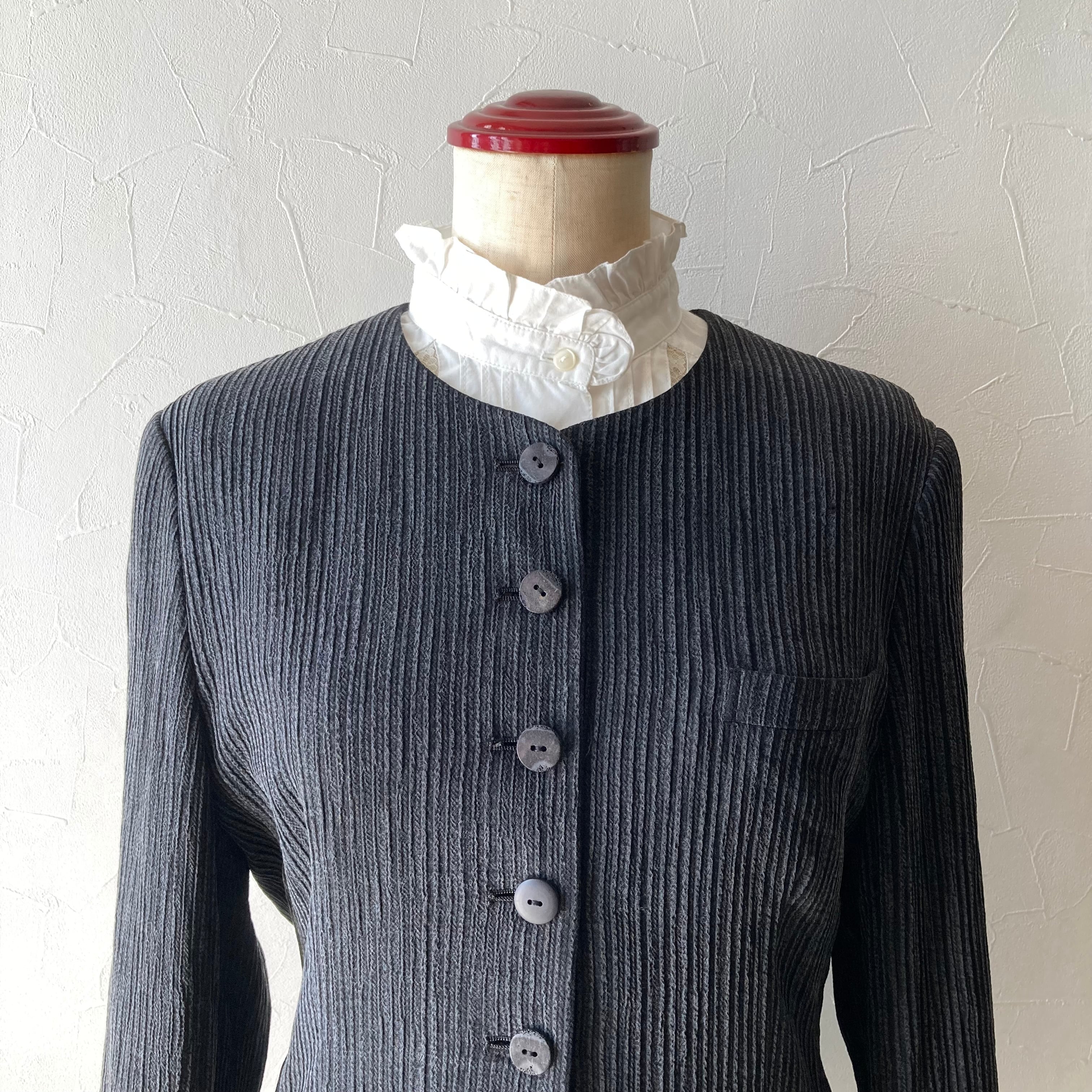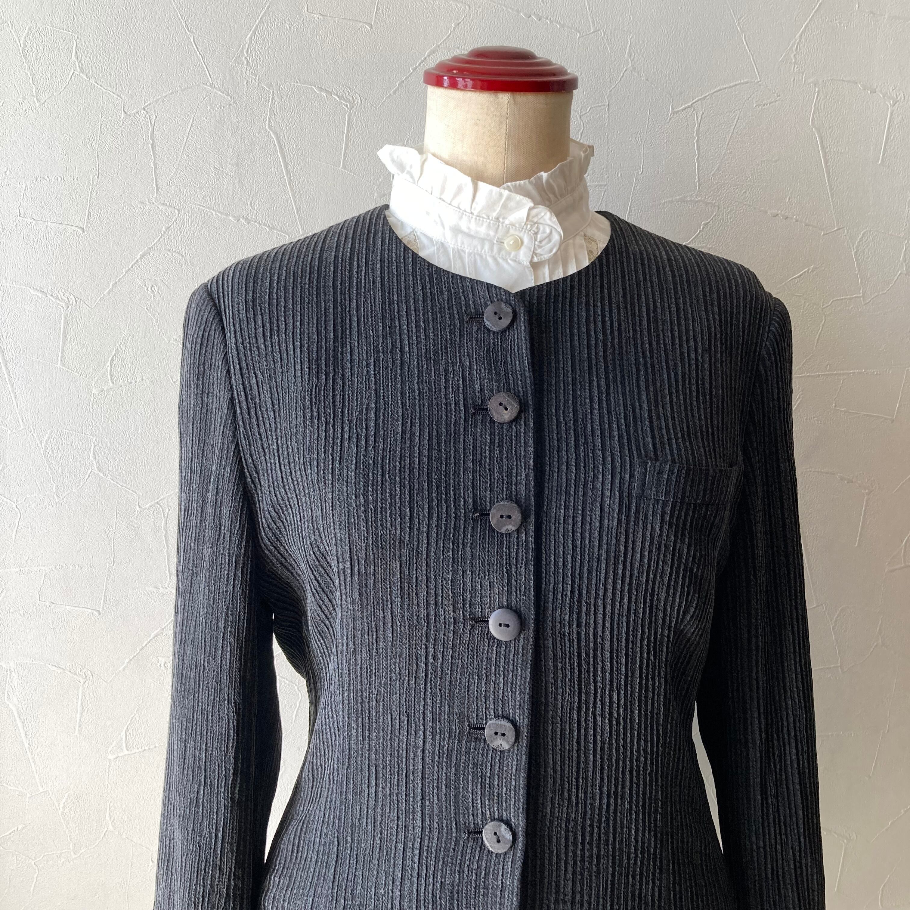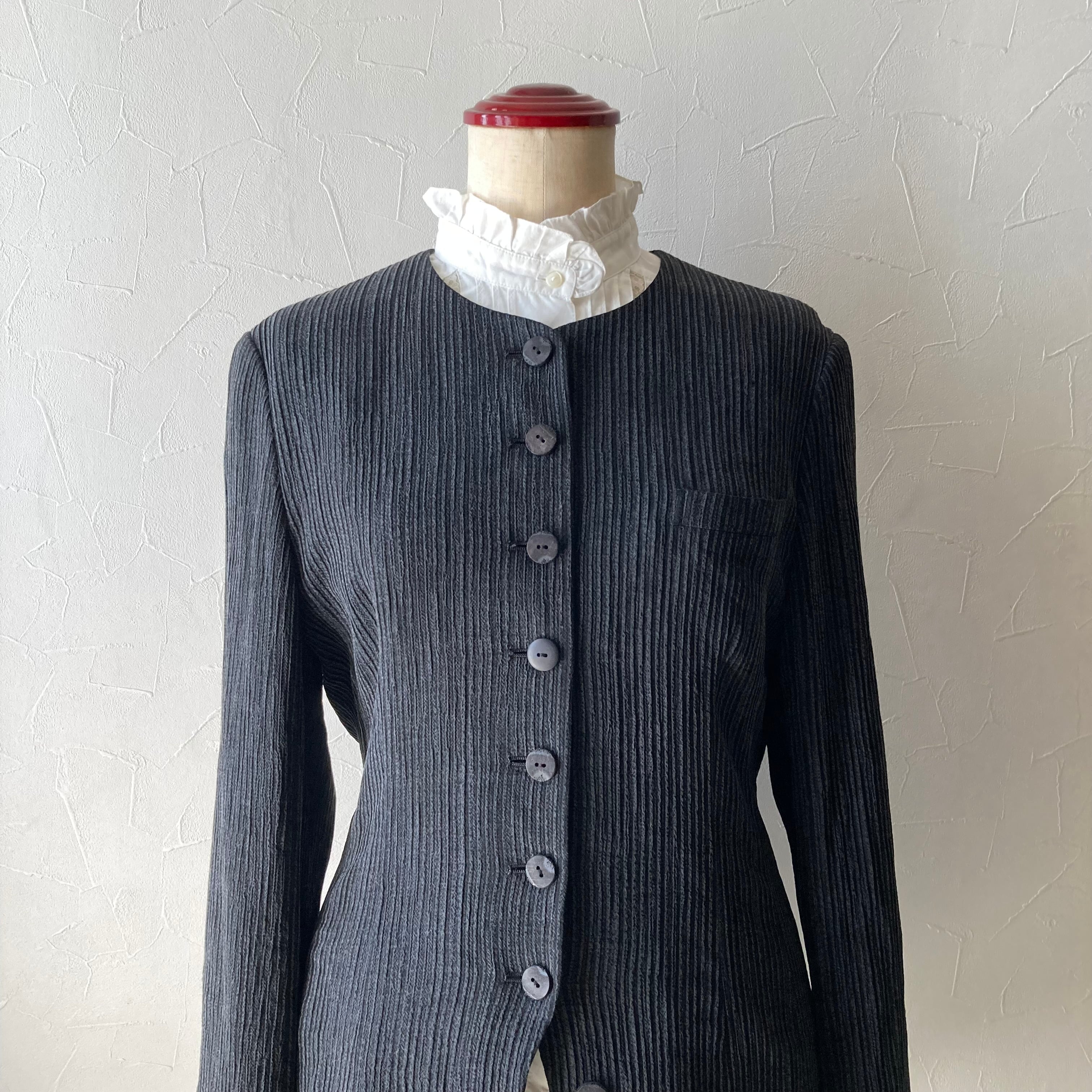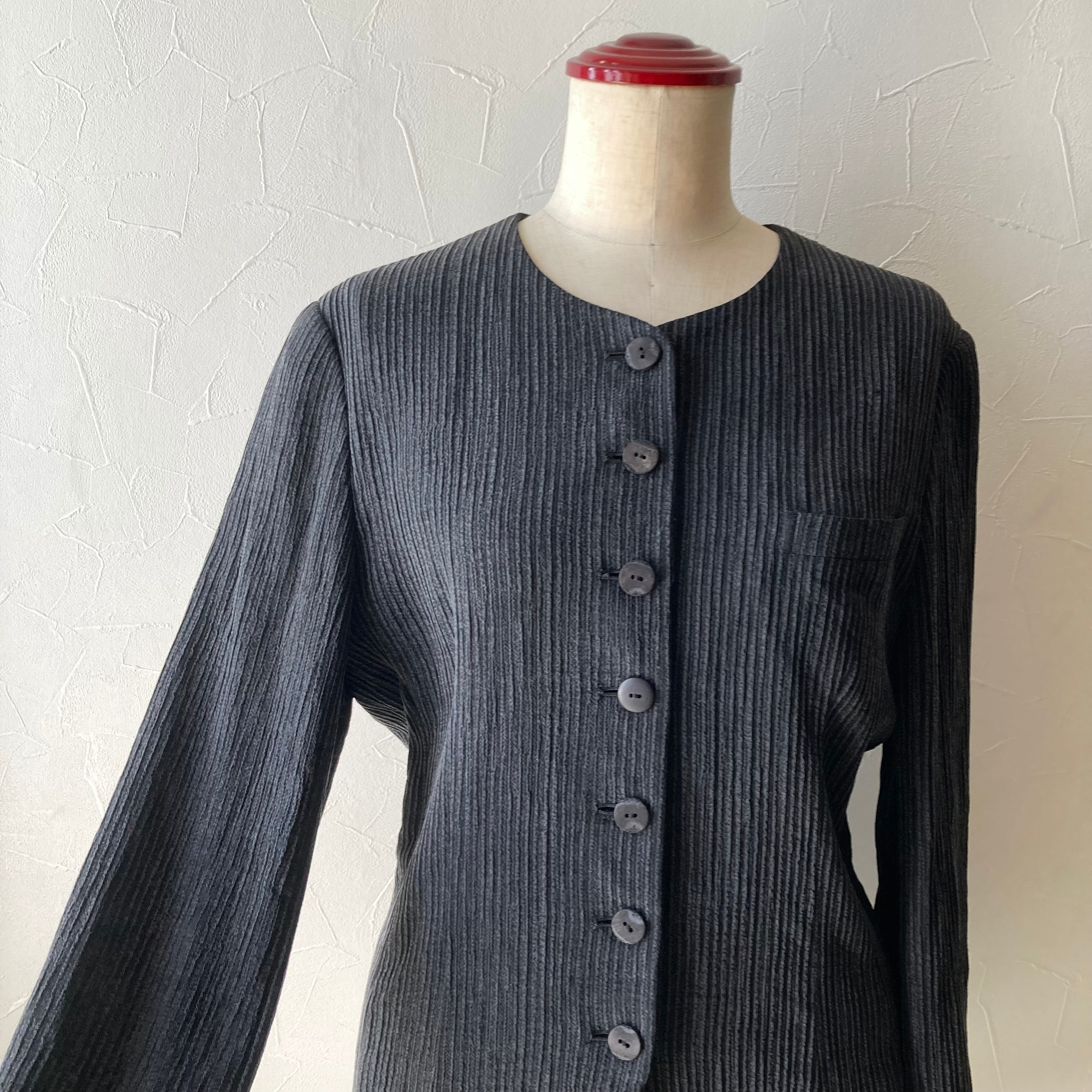 縦に線のようなシワ加工がされた味のある薄手のジャケット◯ 下の二つのボタンは飾りボタンでお洒落なデザイン。裏地がないのでカーディガンのようにさらっと着られます。90sな雰囲気のクールジャケット。前を開けてTシャツに合わせてもかっこよいです。ノーカラーで襟を出したら綺麗めに着られます。
