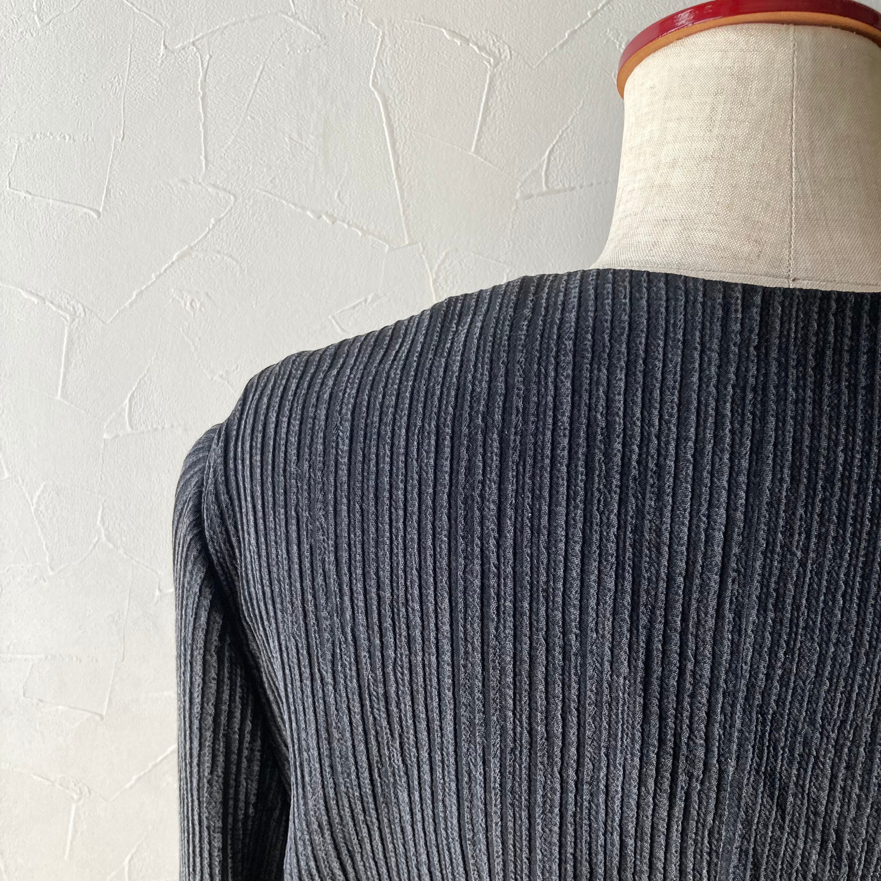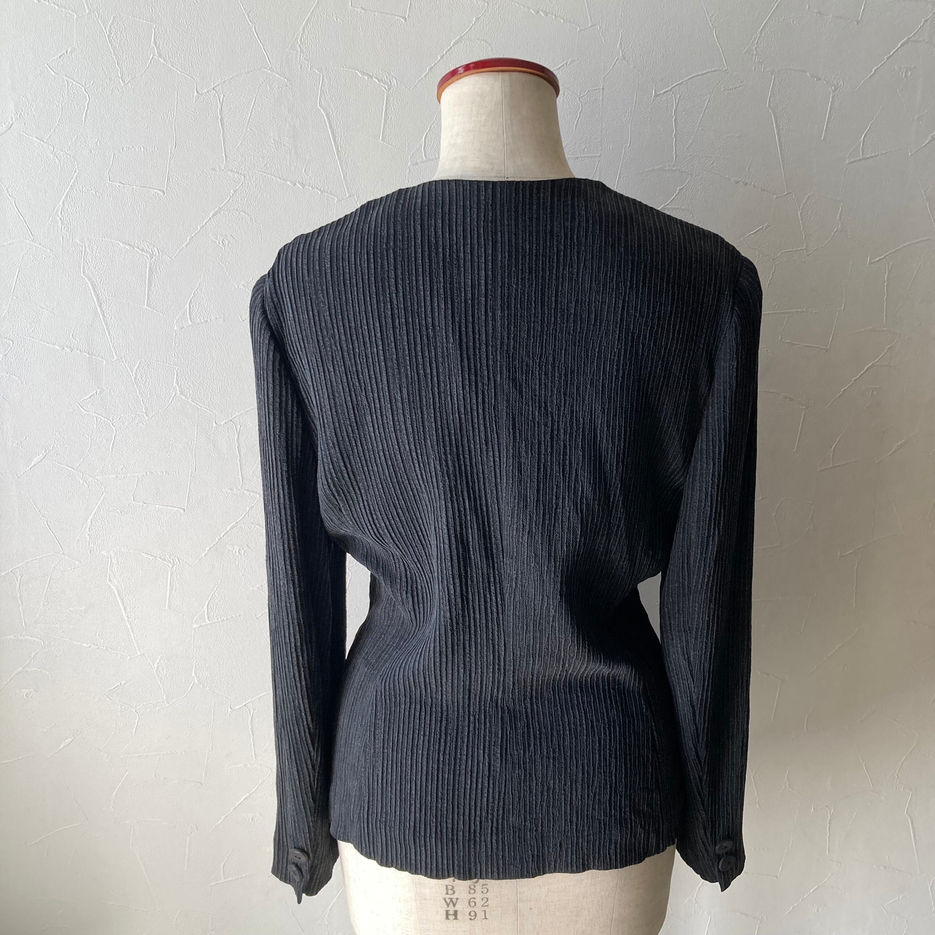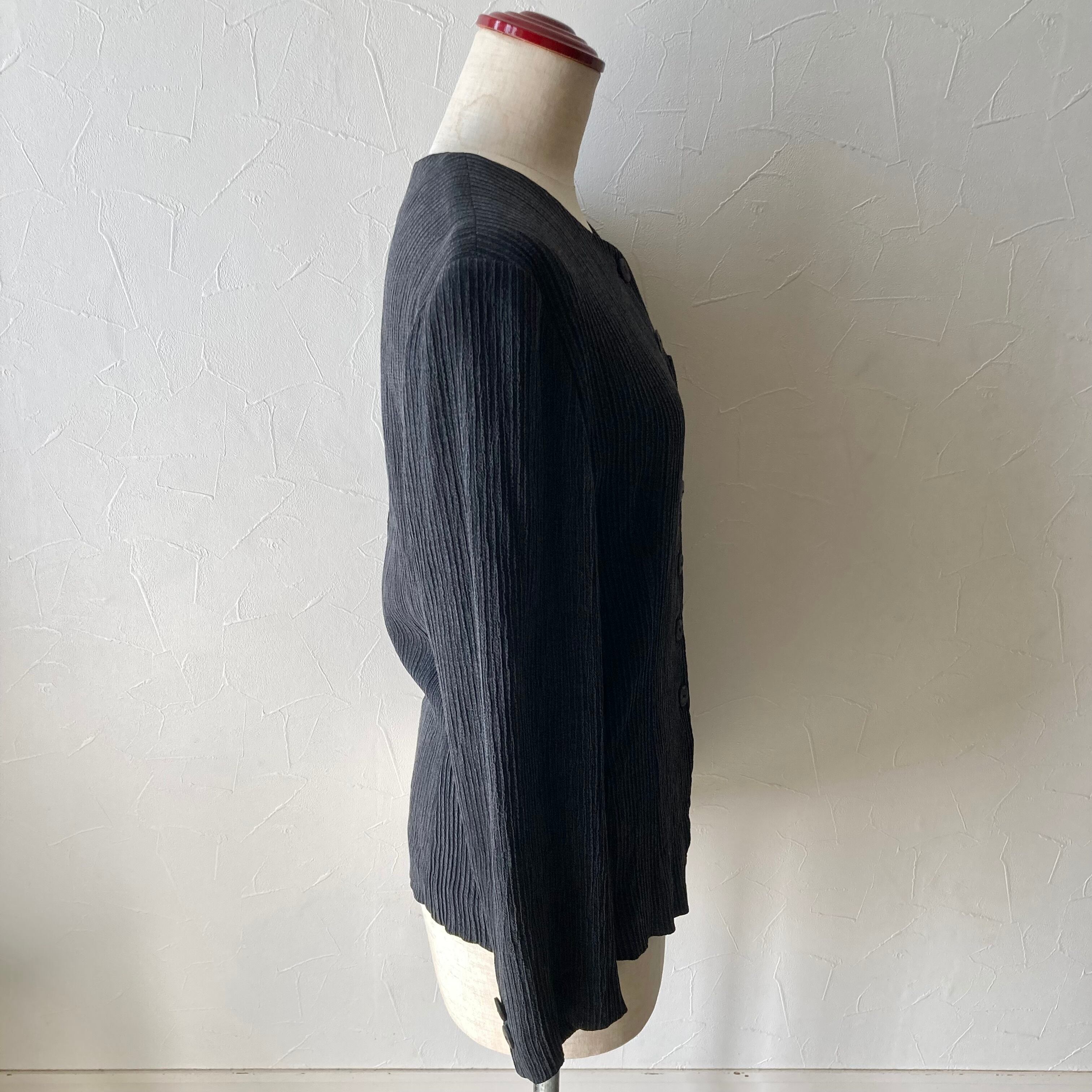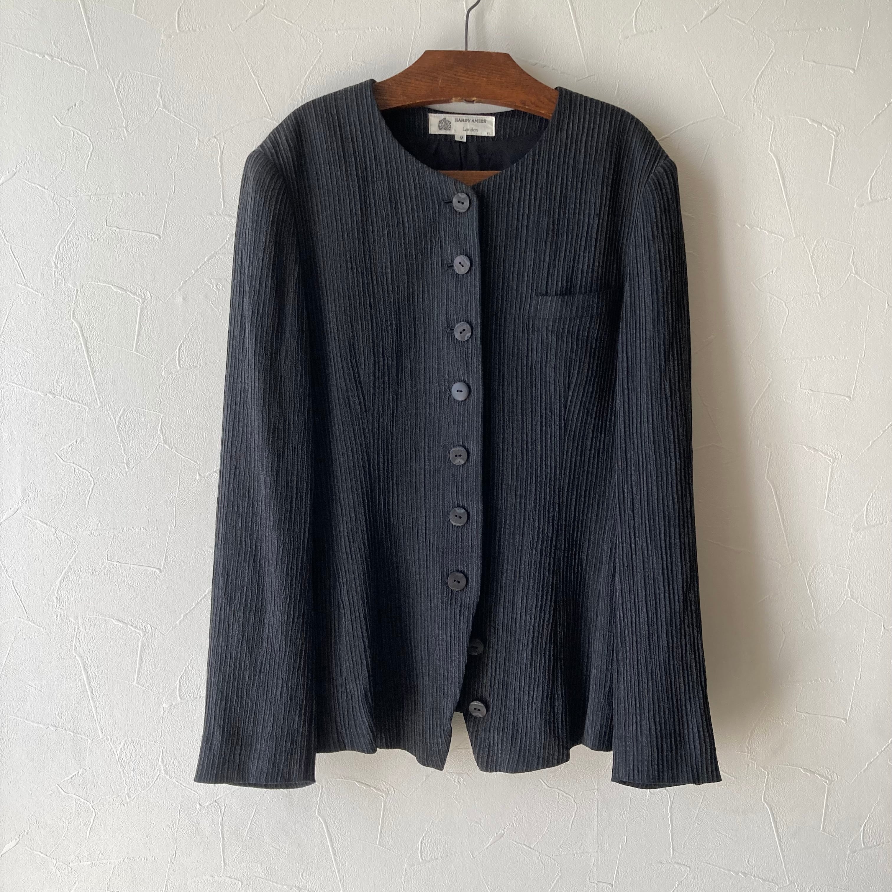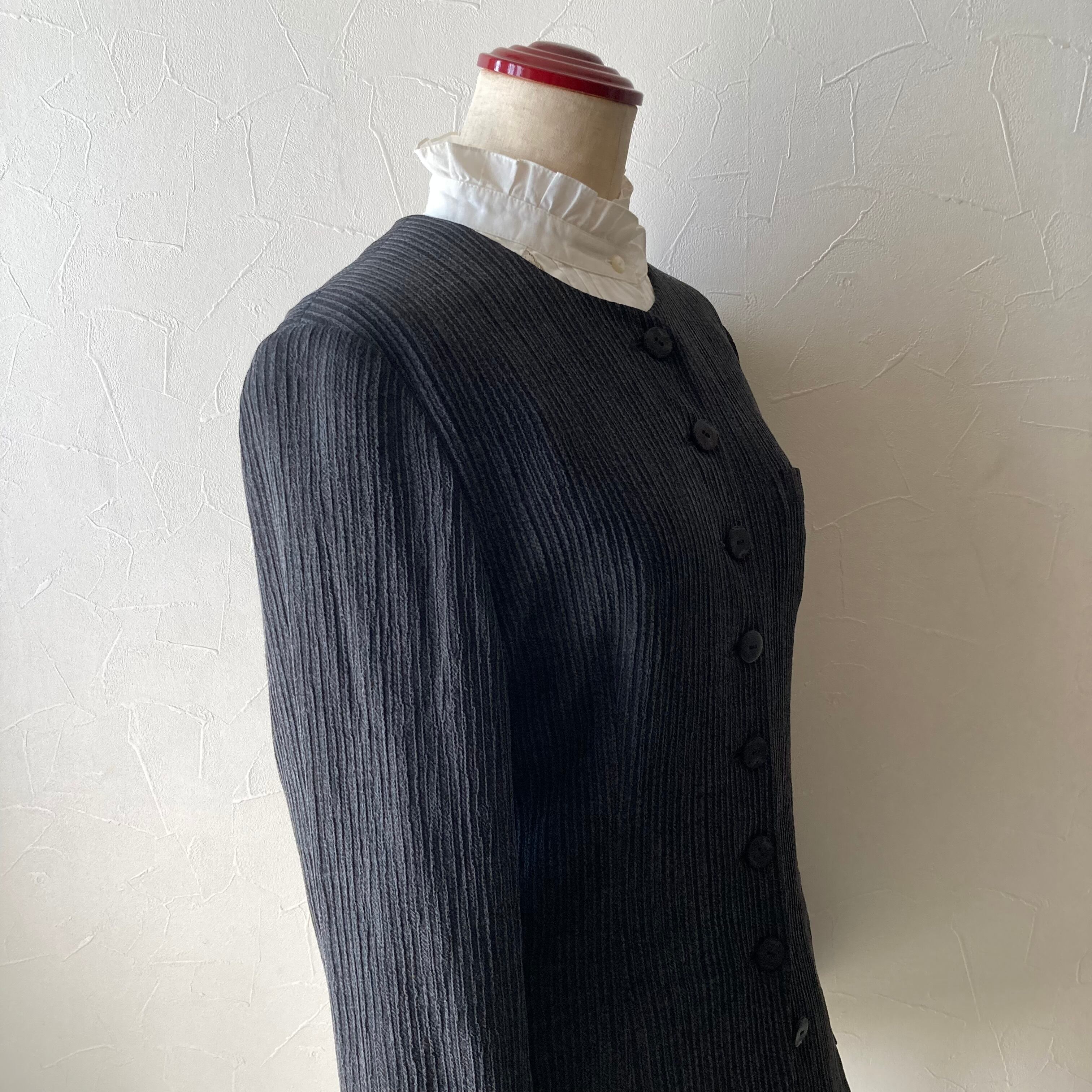 縦に線のようなシワ加工がされた味のある薄手のジャケット◯ 下の二つのボタンは飾りボタンでお洒落なデザイン。裏地がないのでカーディガンのようにさらっと着られます。90sな雰囲気のクールジャケット。前を開けてTシャツに合わせてもかっこよいです。ノーカラーで襟を出したら綺麗めに着られます。