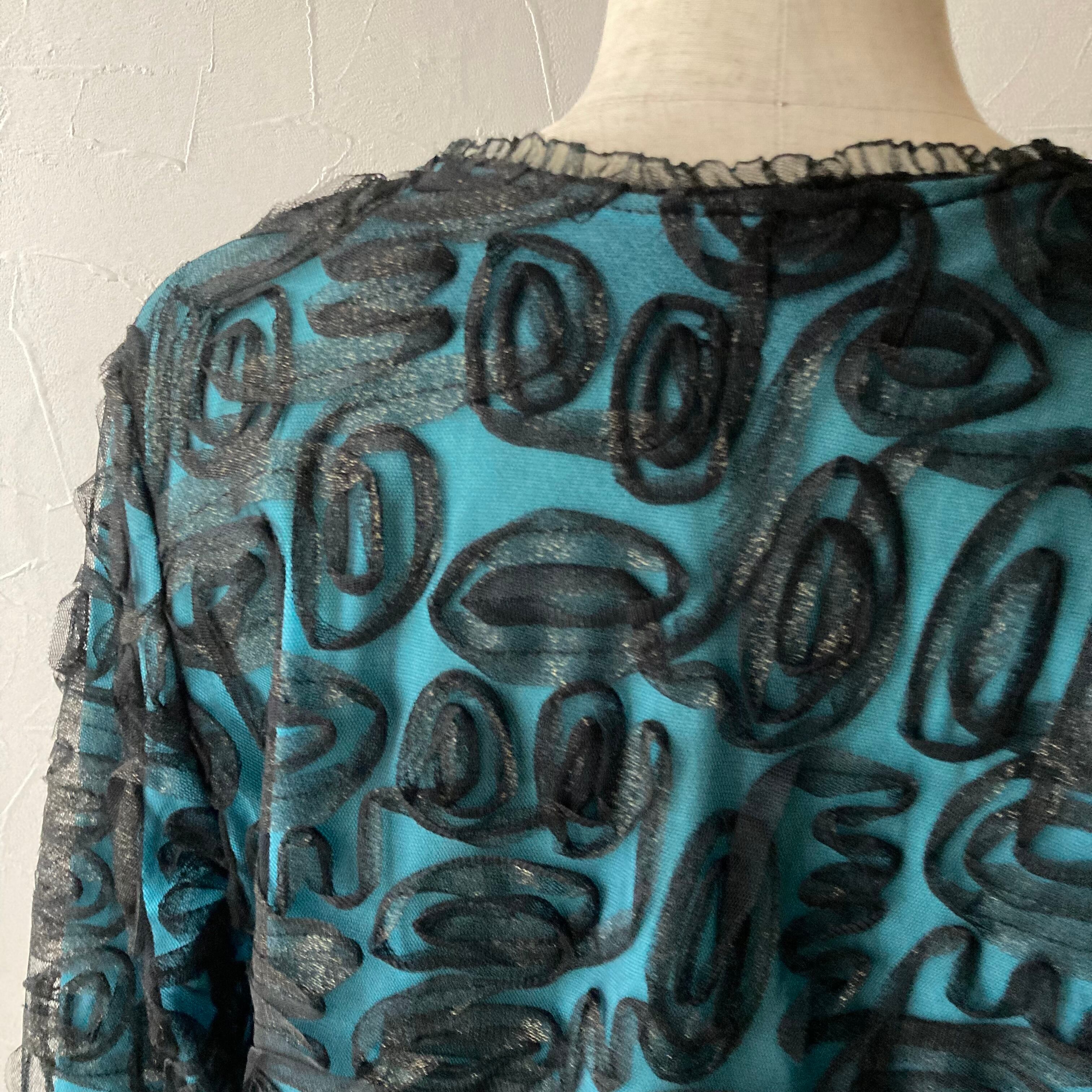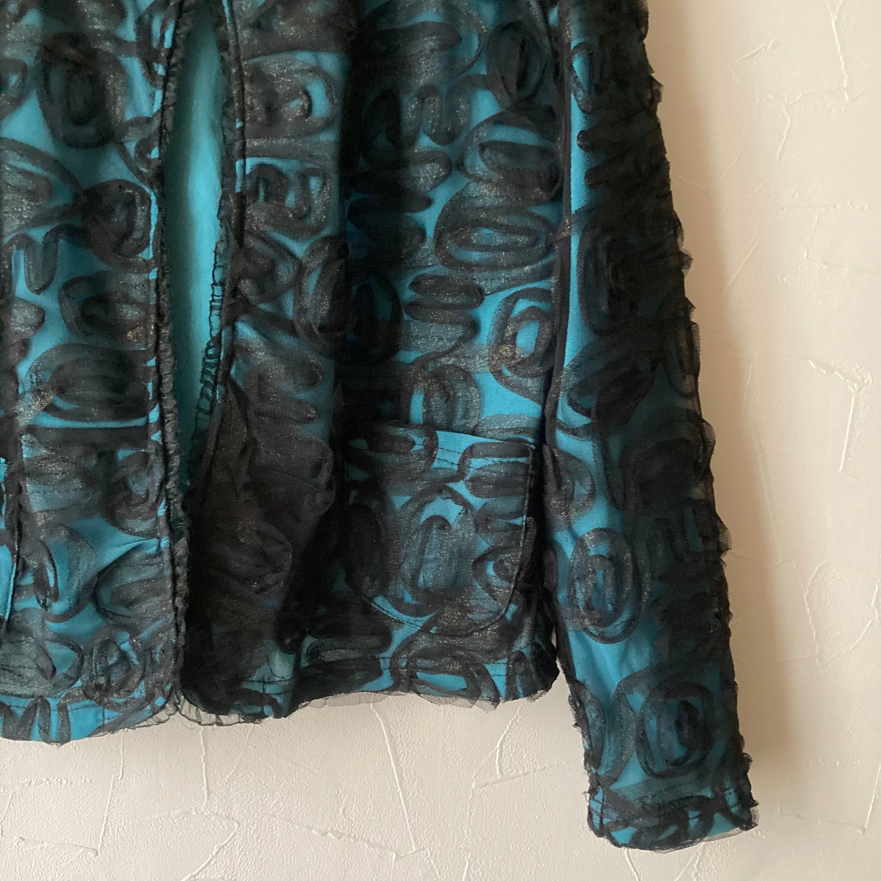 水色に黒のくるくるしたデザインのレースがお洒落なカーディガン◯ 他にない素敵な一着。黒や白でパーティなど、特別な日のお洒落にも、デニムやワイドパンツなどと合わせてデイリーにも着ていただけます♪ 水色の生地は柔らかく着やすいので気軽に着られると思います。