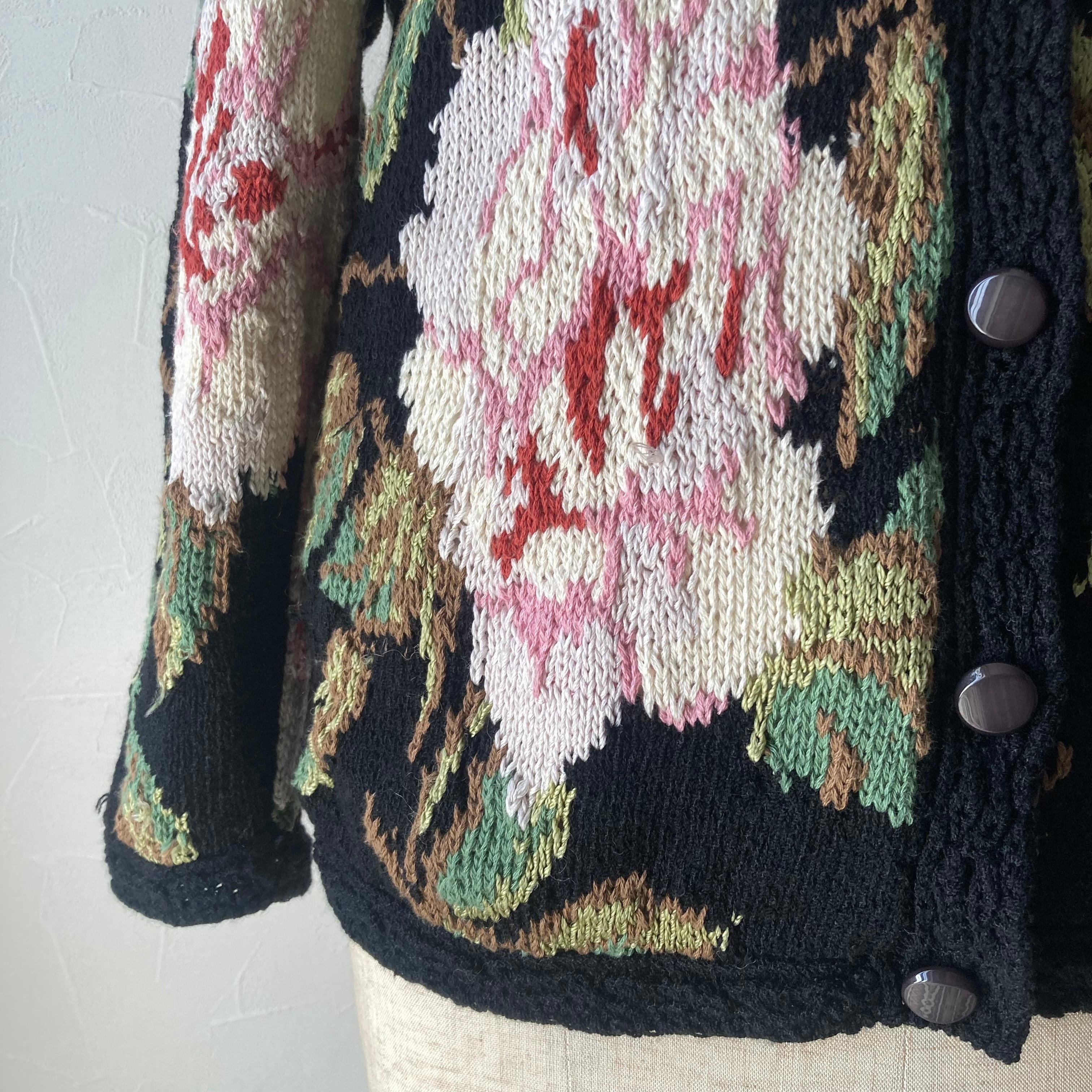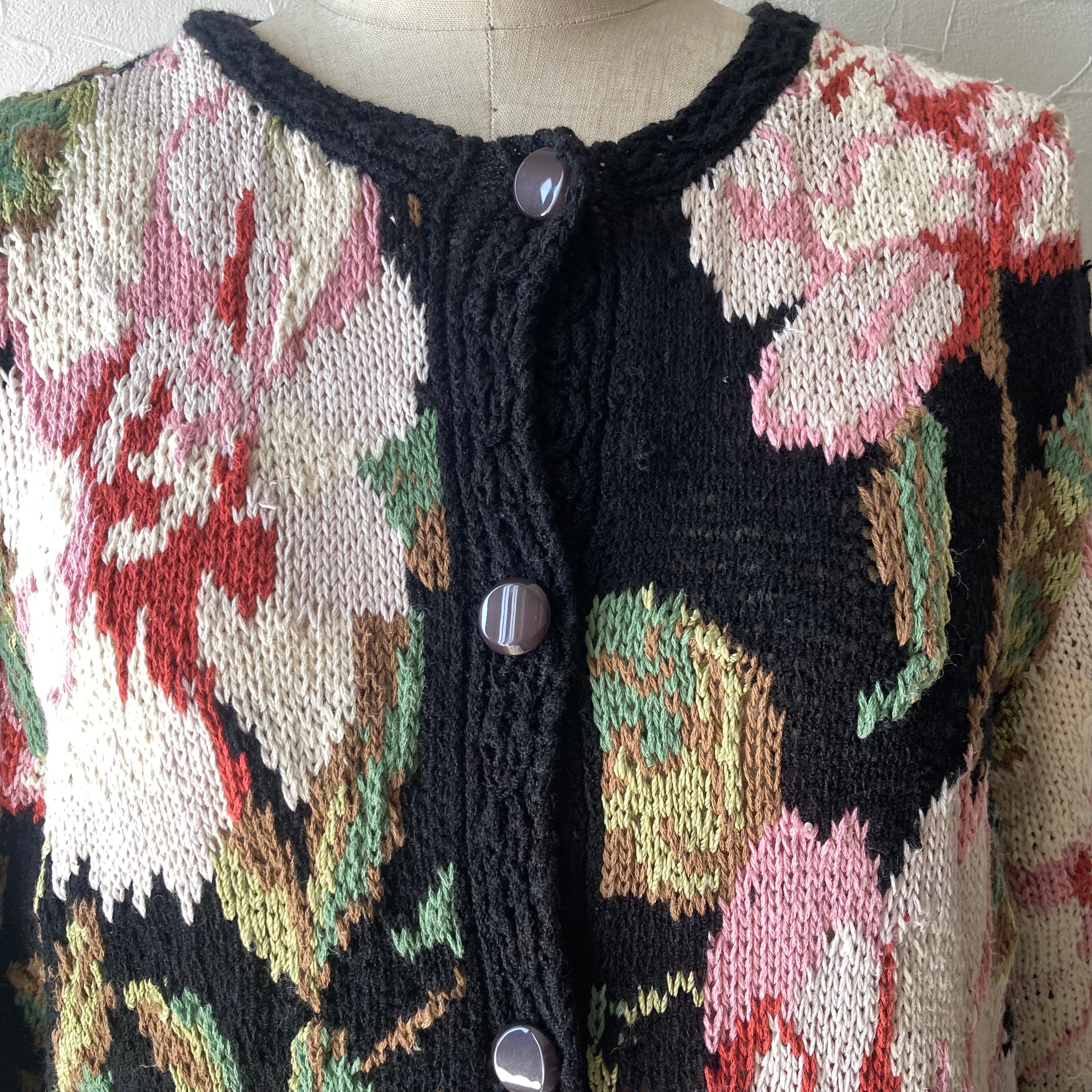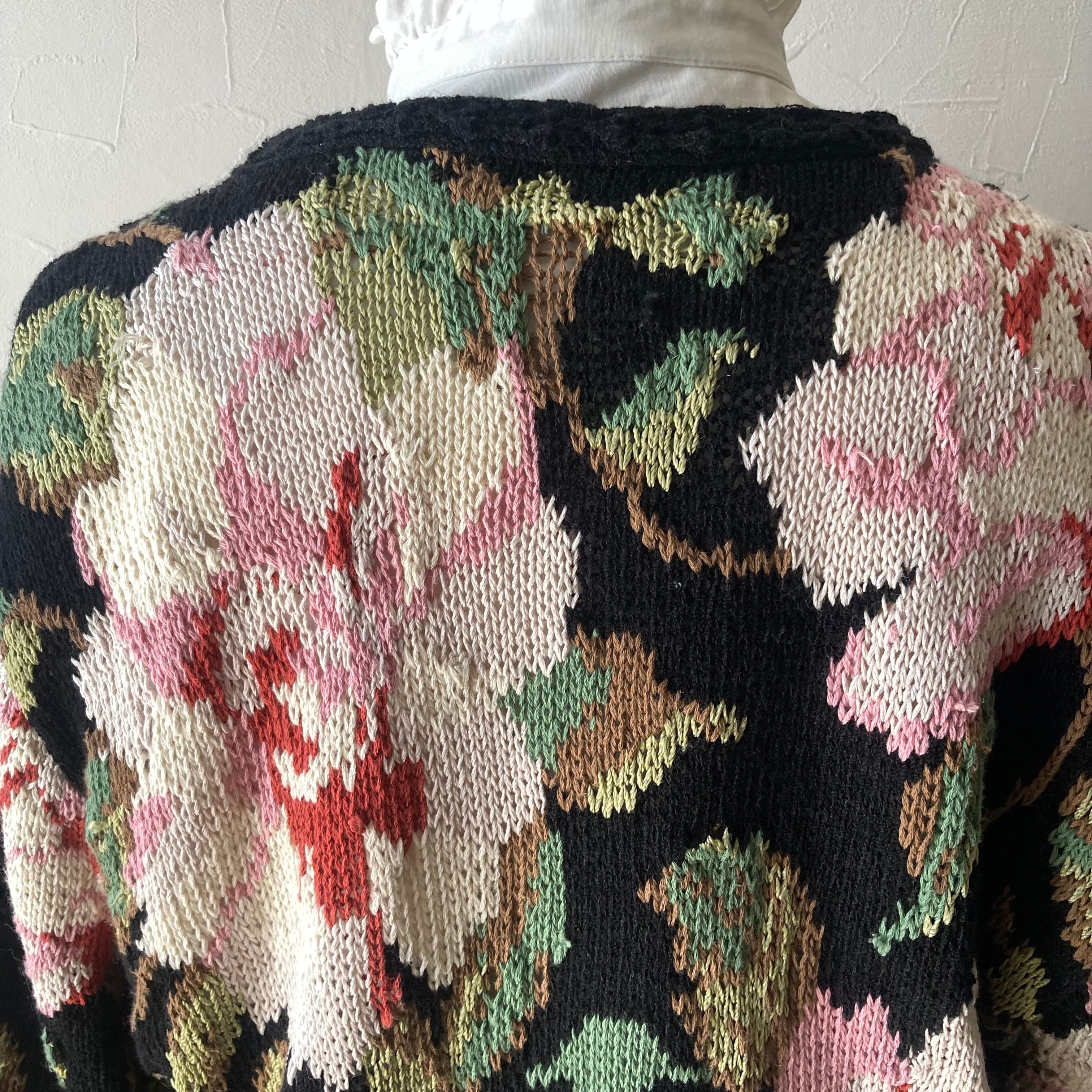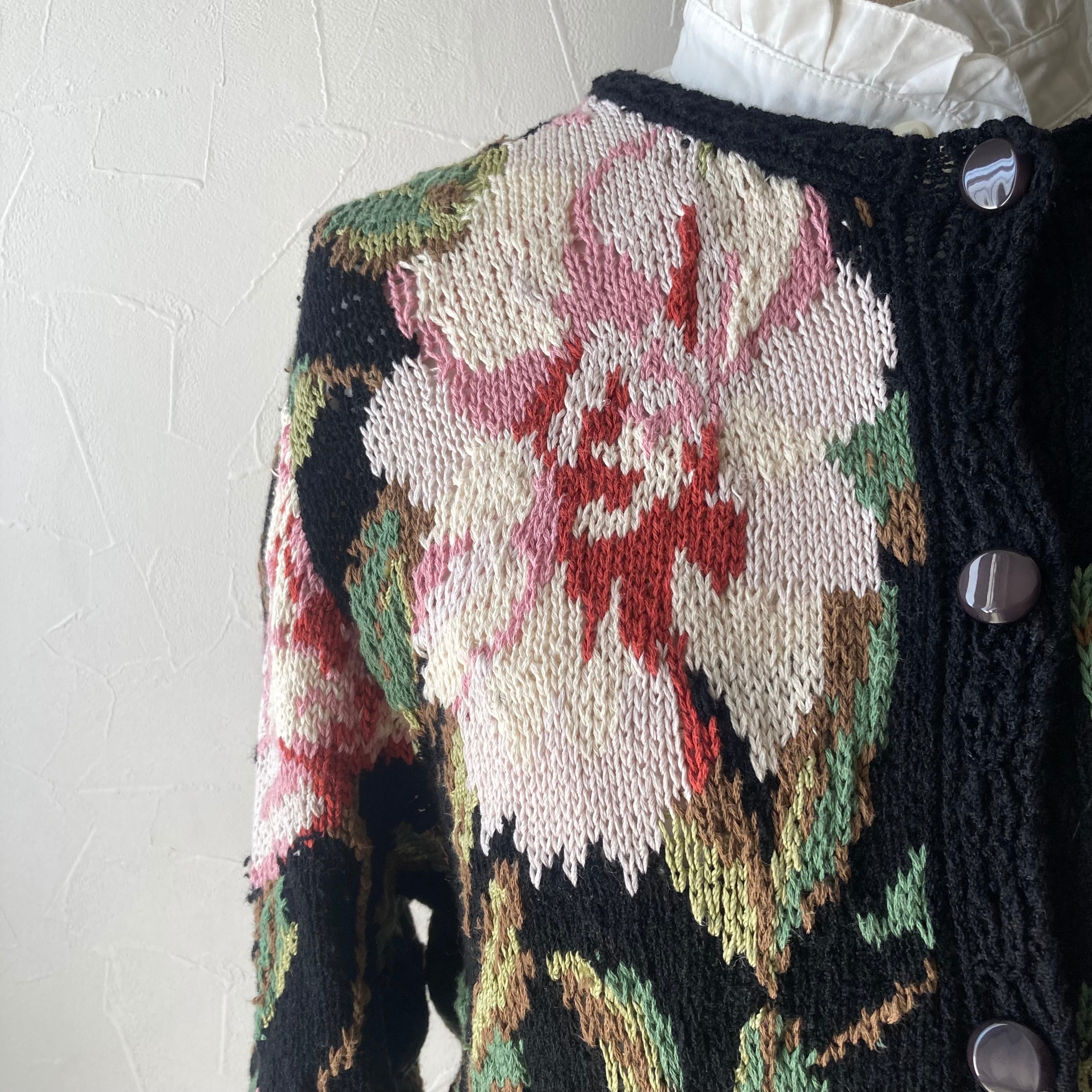 黒地に白色の大きな花柄が魅力的なカーディガン◯ 綿や麻や絹混の素材で触り心地もしなやか。美しい上品な一着です。