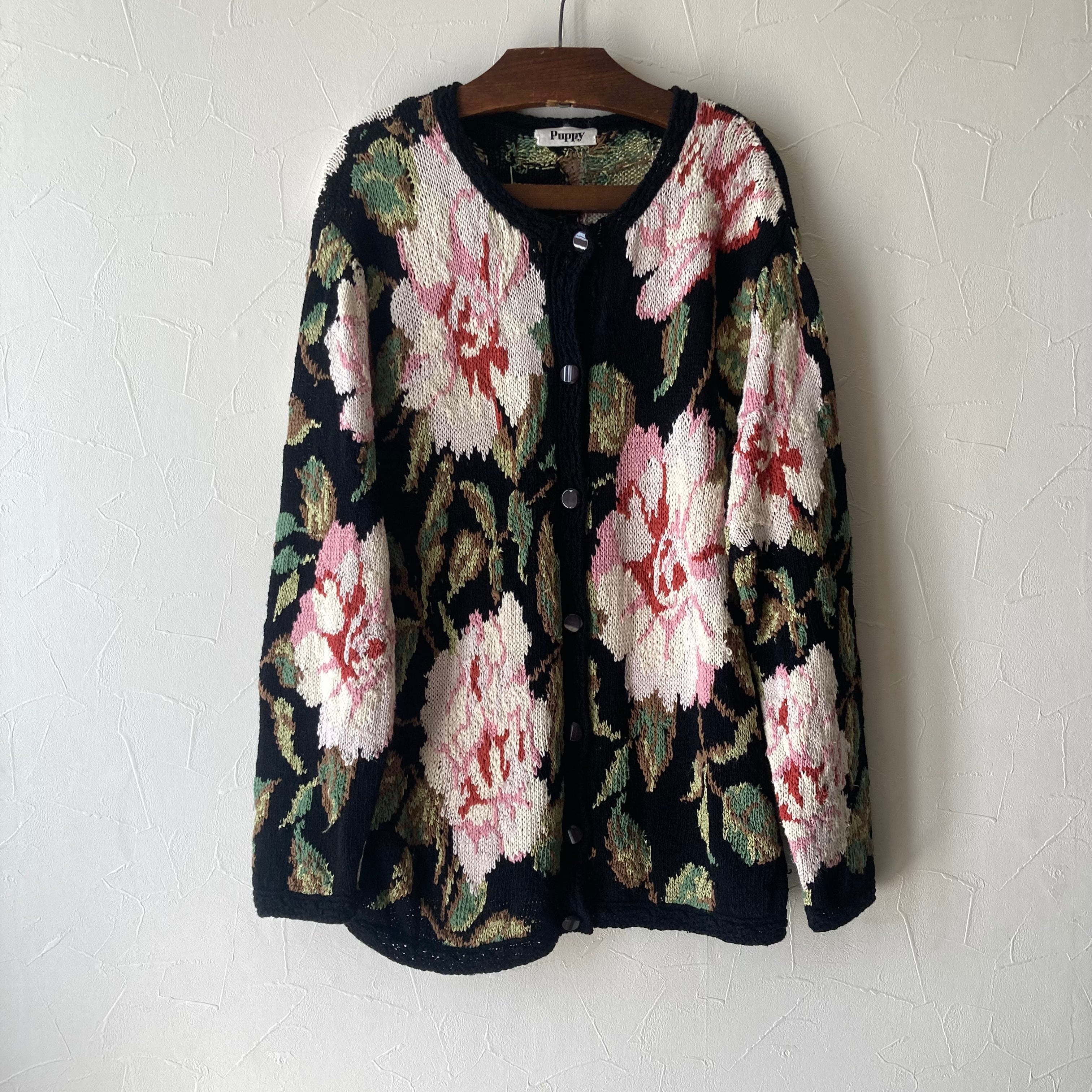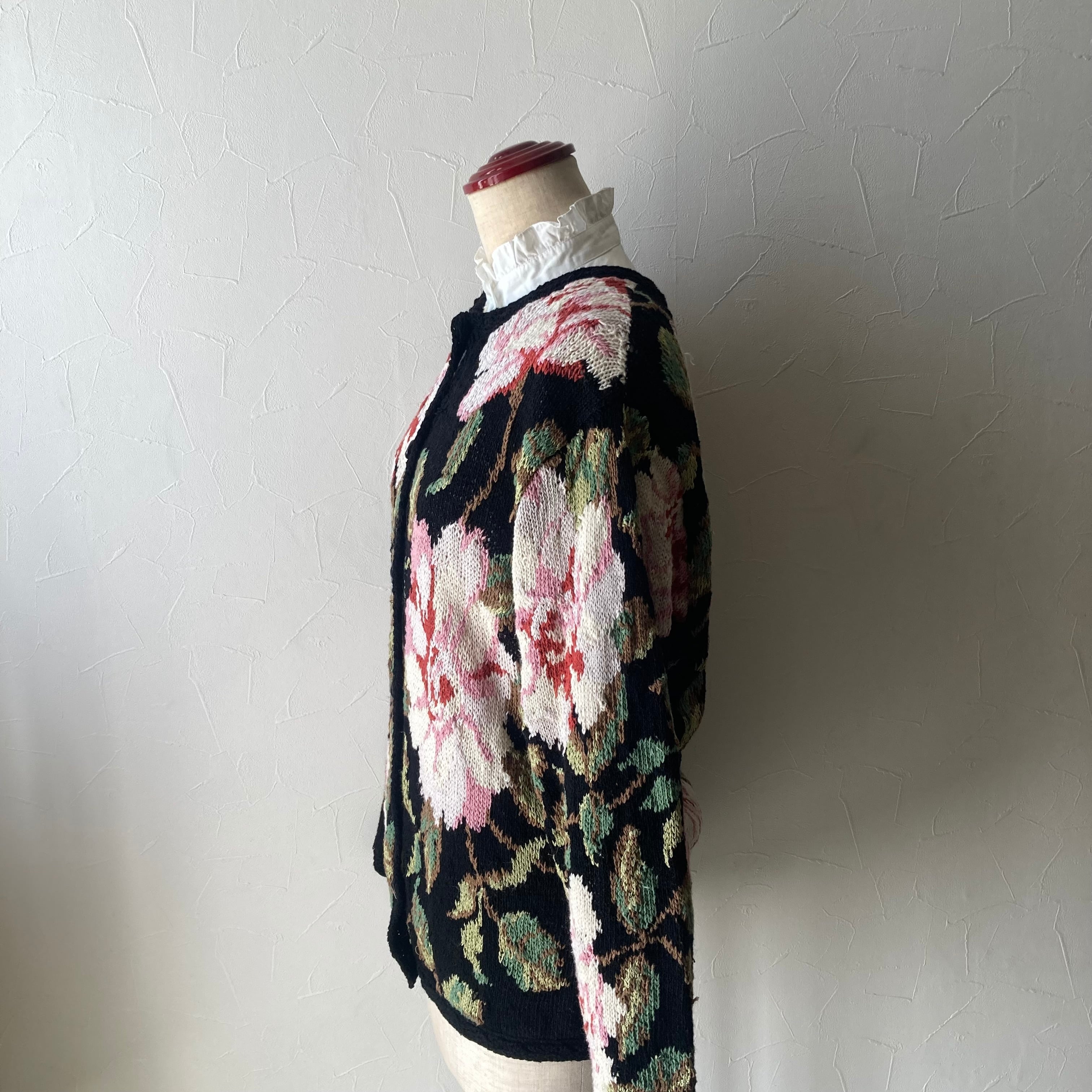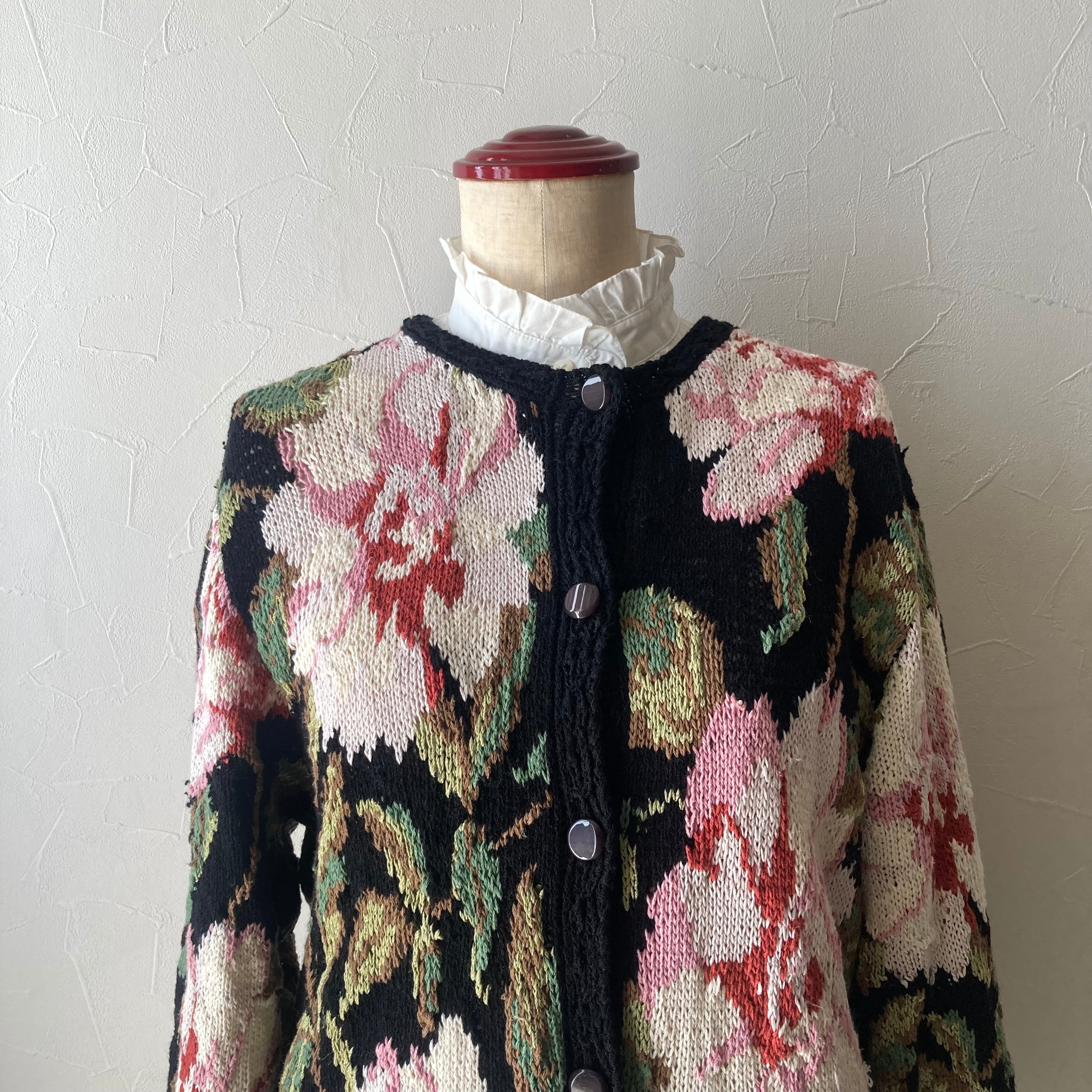 黒地に白色の大きな花柄が魅力的なカーディガン◯ 綿や麻や絹混の素材で触り心地もしなやか。美しい上品な一着です。