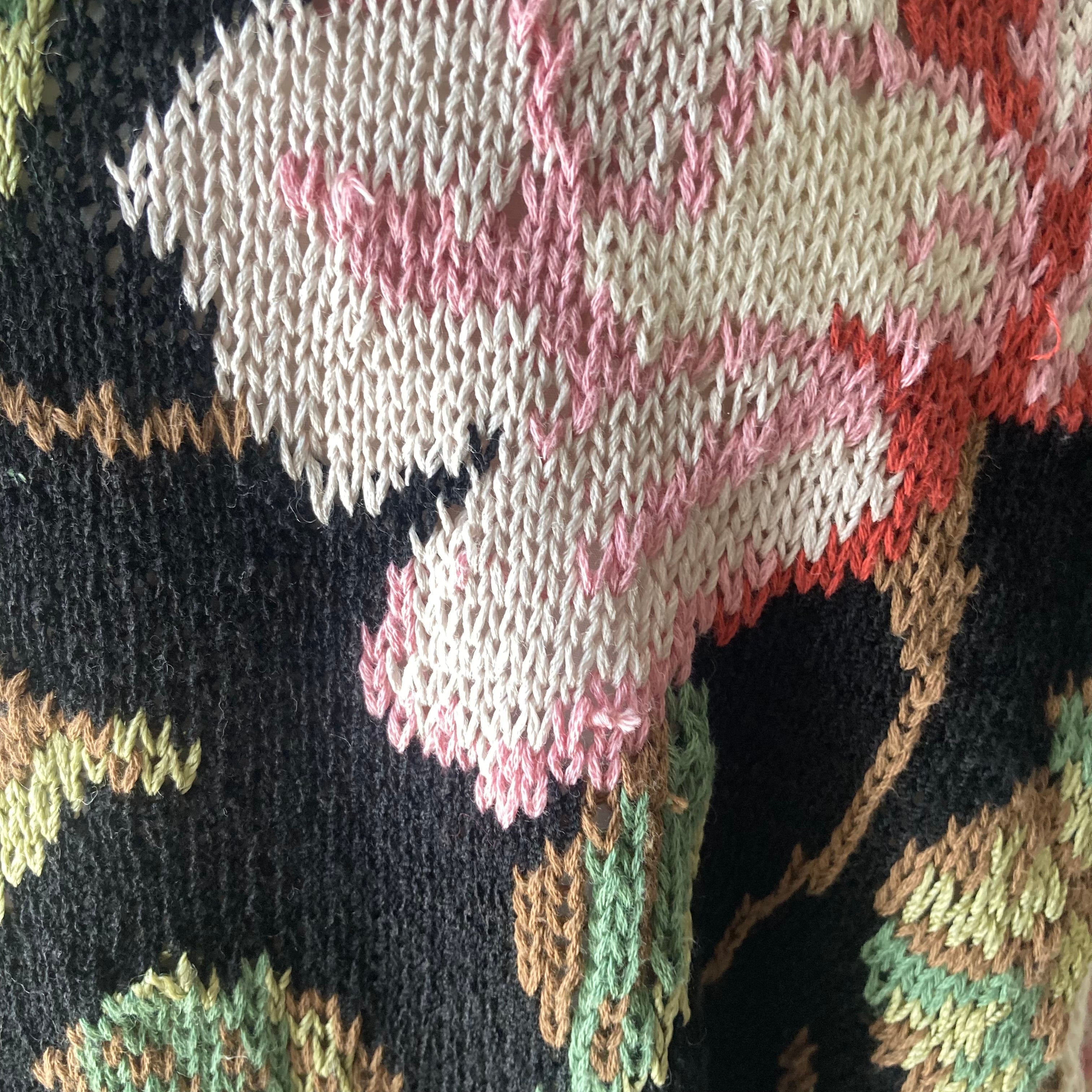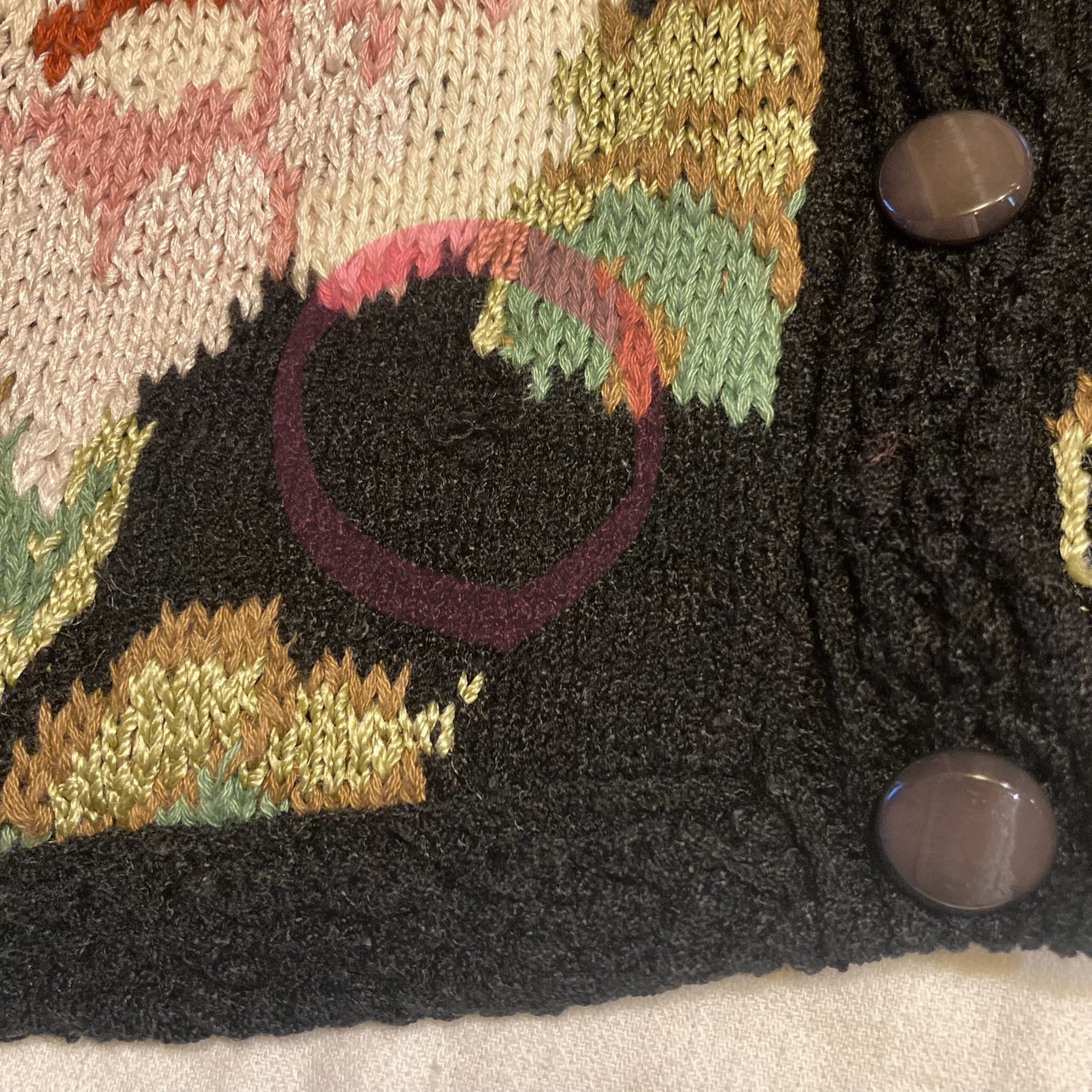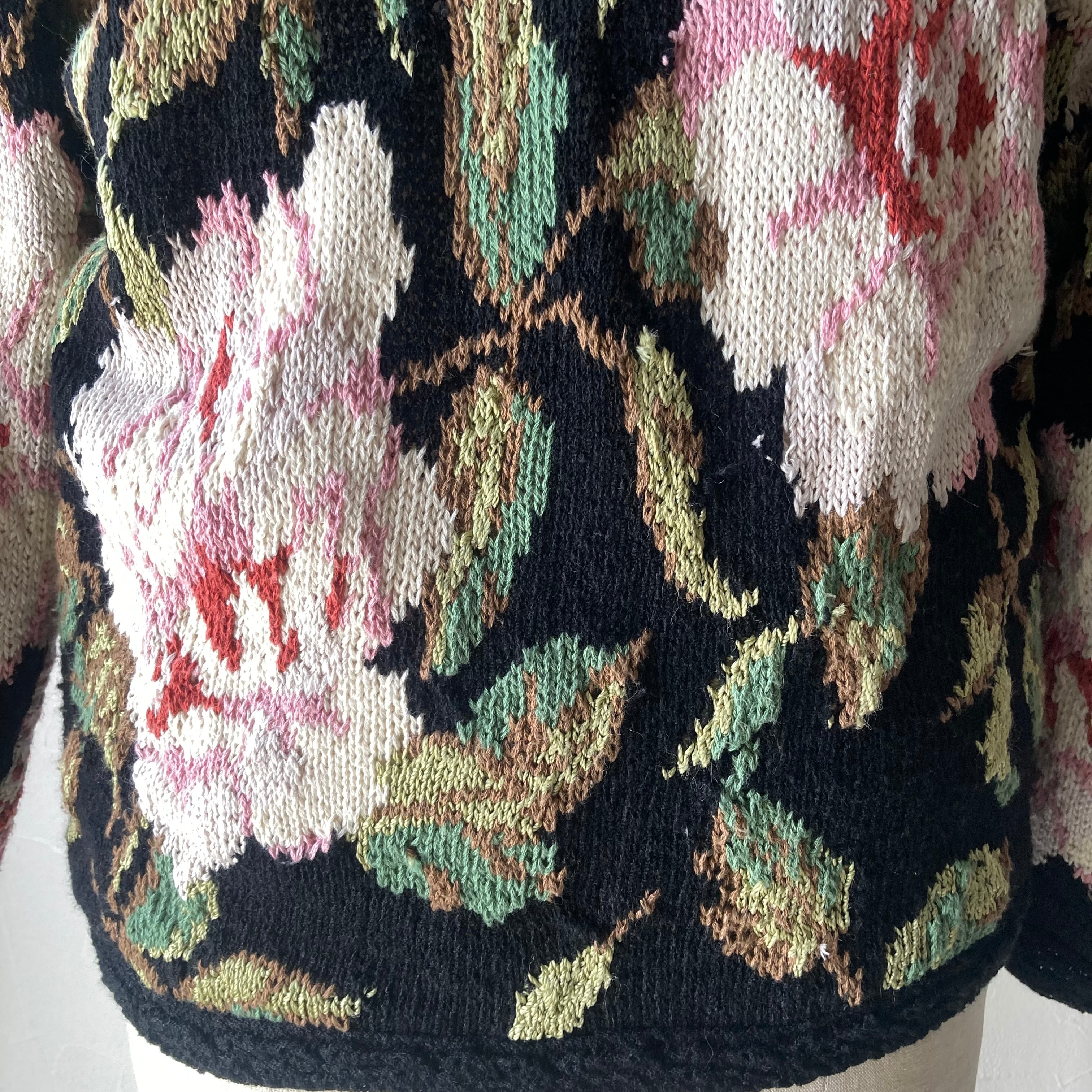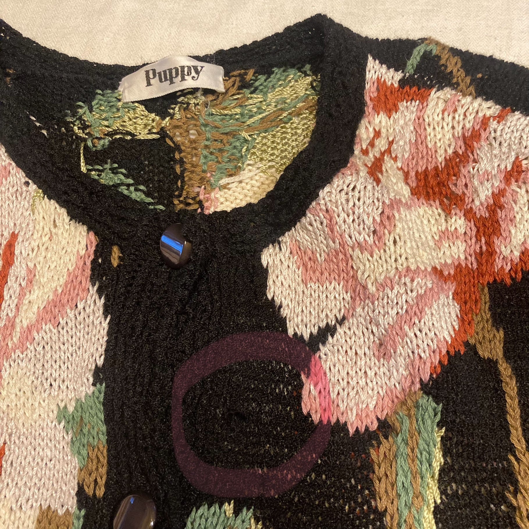 黒地に白色の大きな花柄が魅力的なカーディガン◯ 綿や麻や絹混の素材で触り心地もしなやか。美しい上品な一着です。