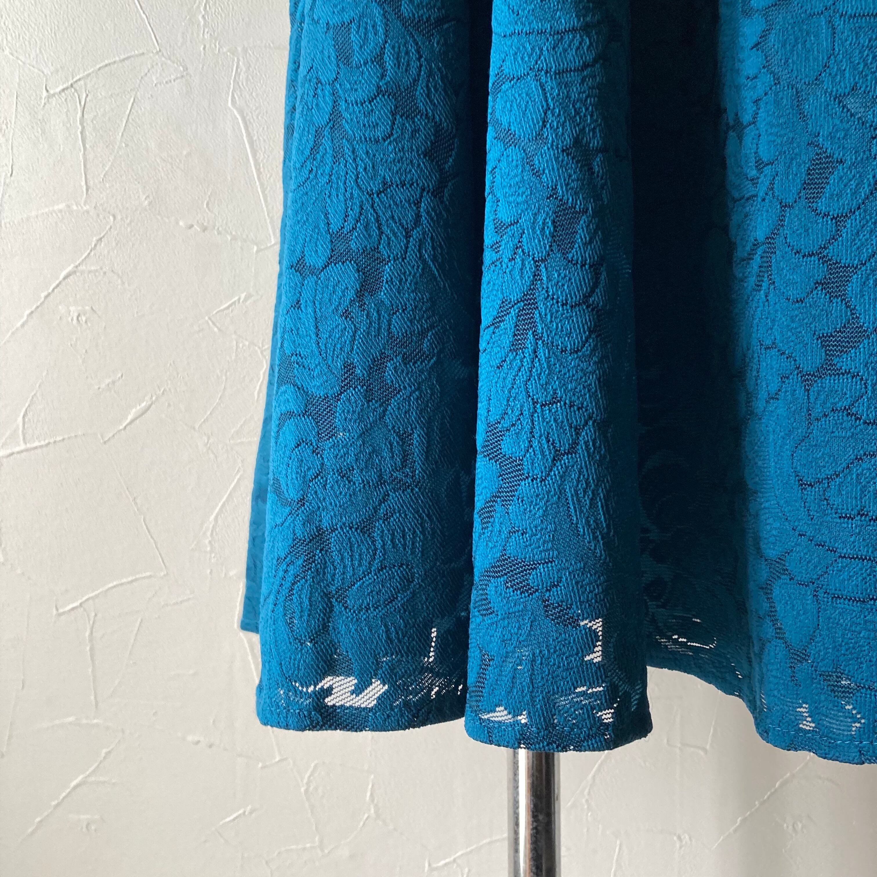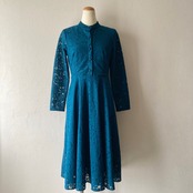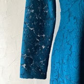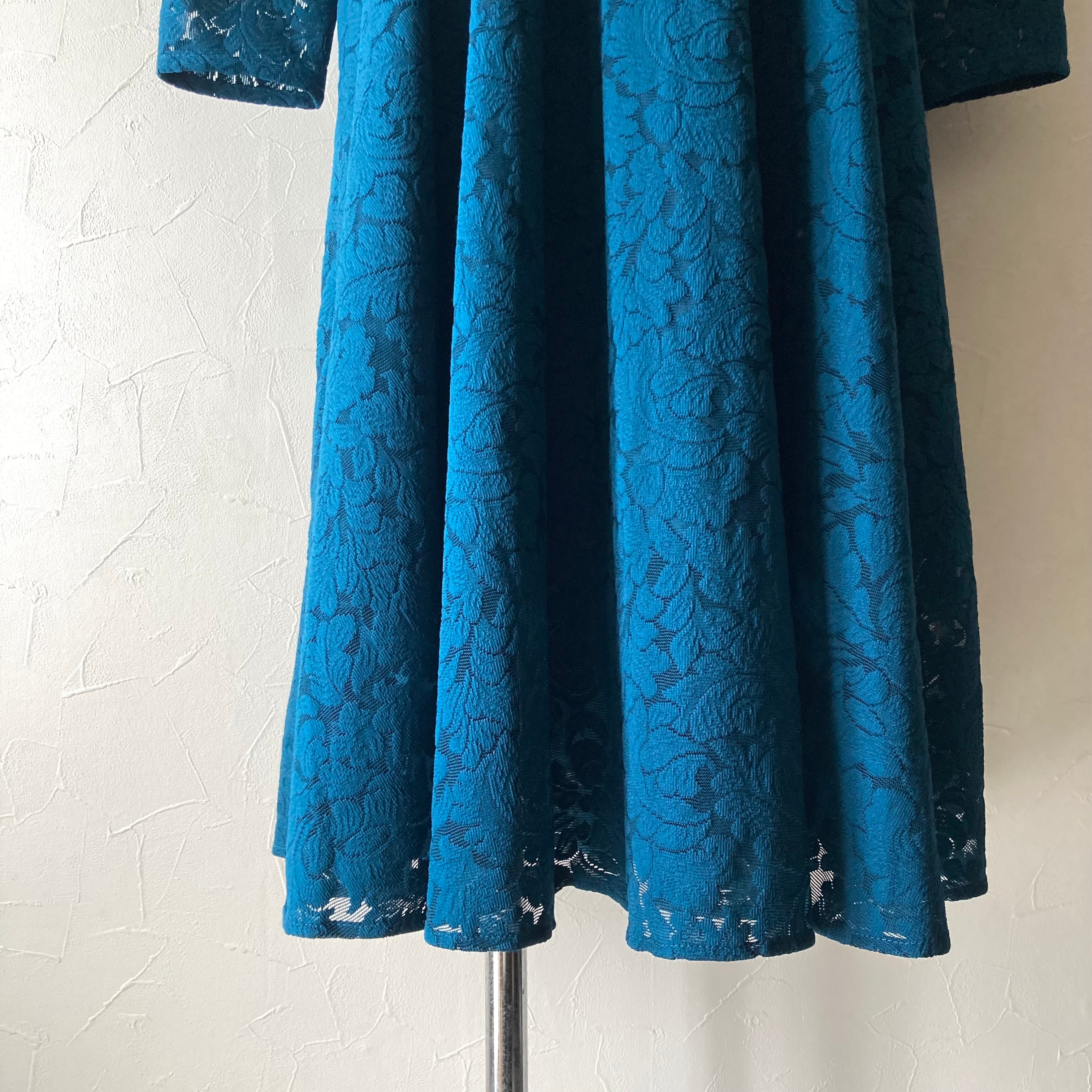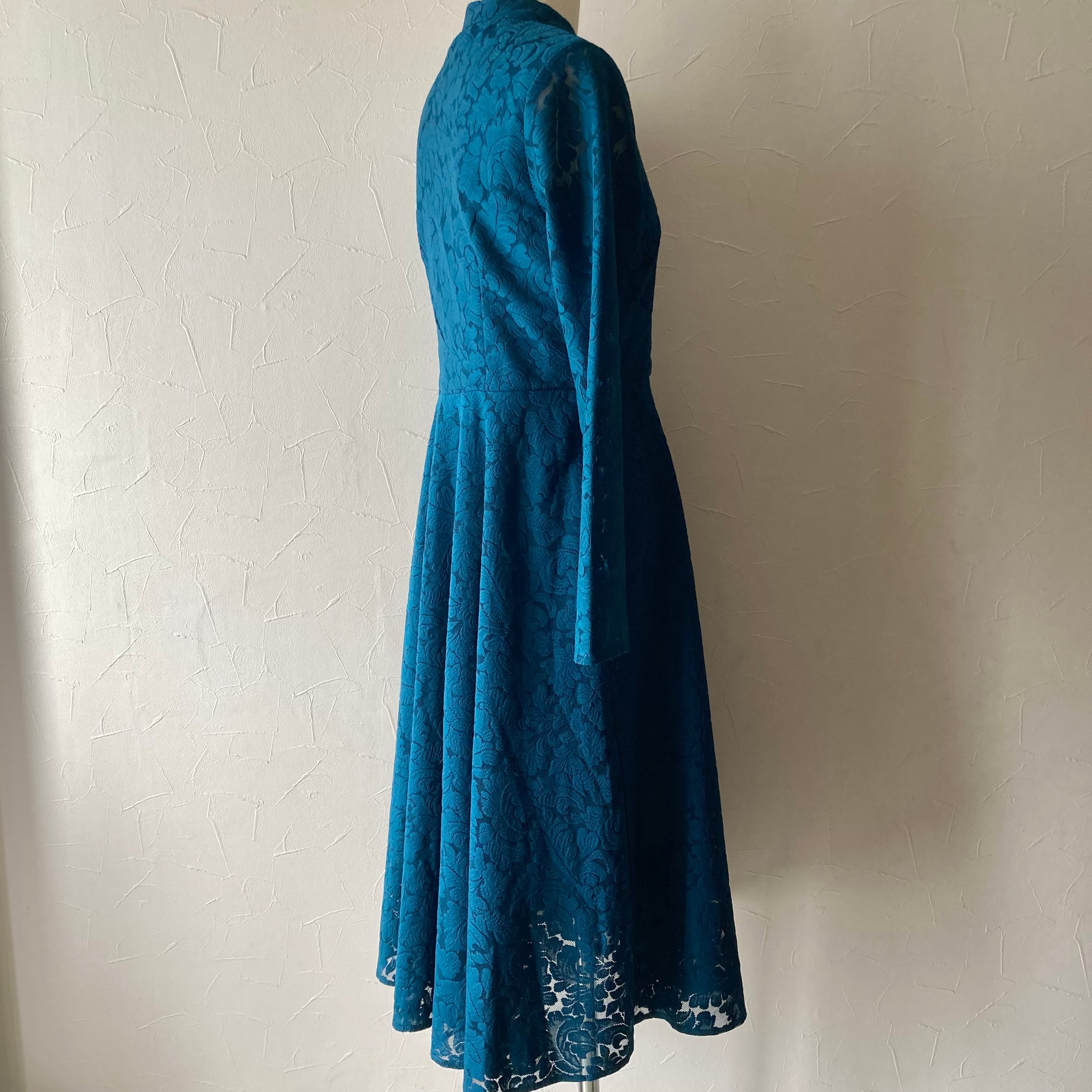 グリーンとブルーが混ざったようなとても素敵なお色のワンピース◯ レースも可愛いです。トップはタイトにスカート部分はひらひらと華やか。控えめながらも美しいシルエットです。