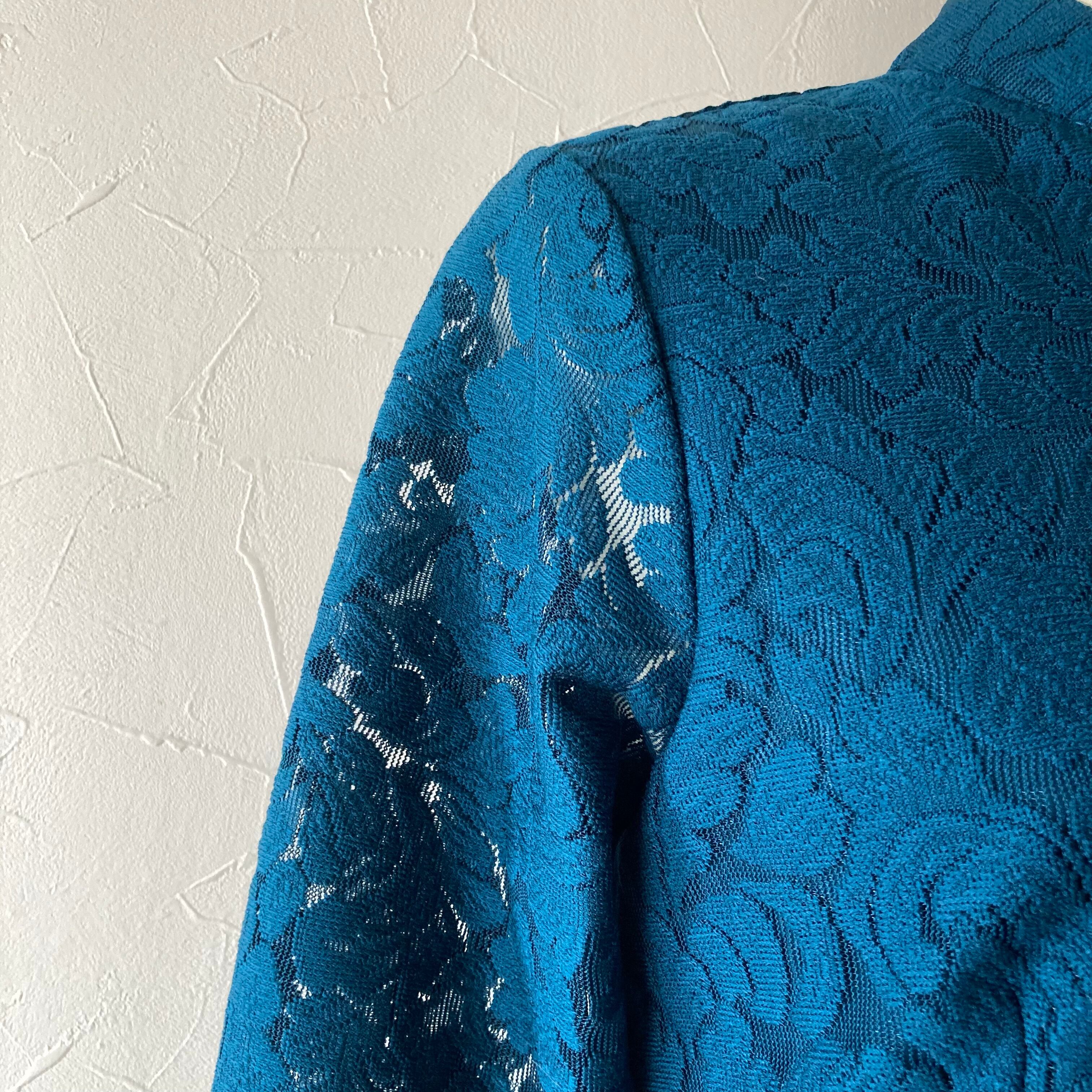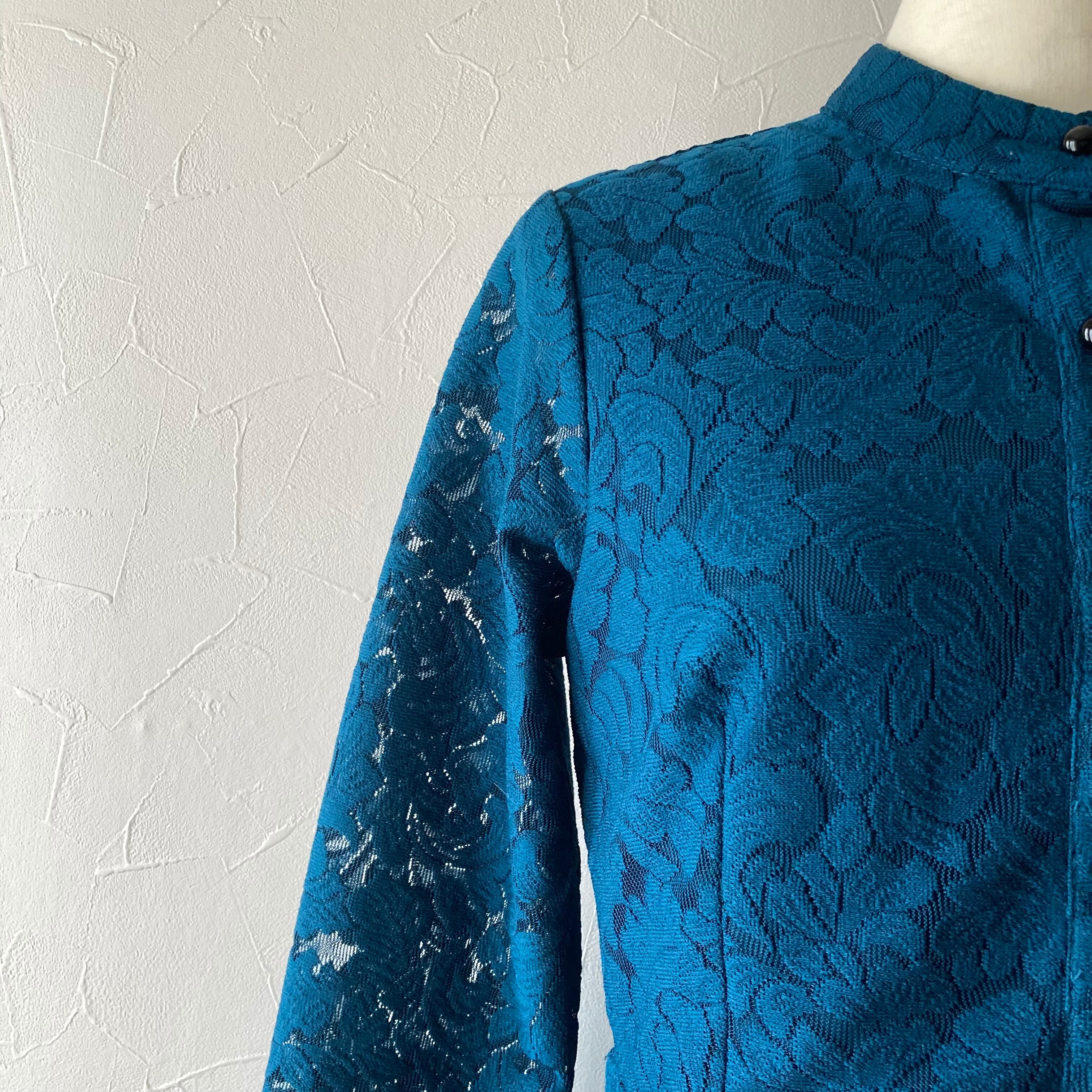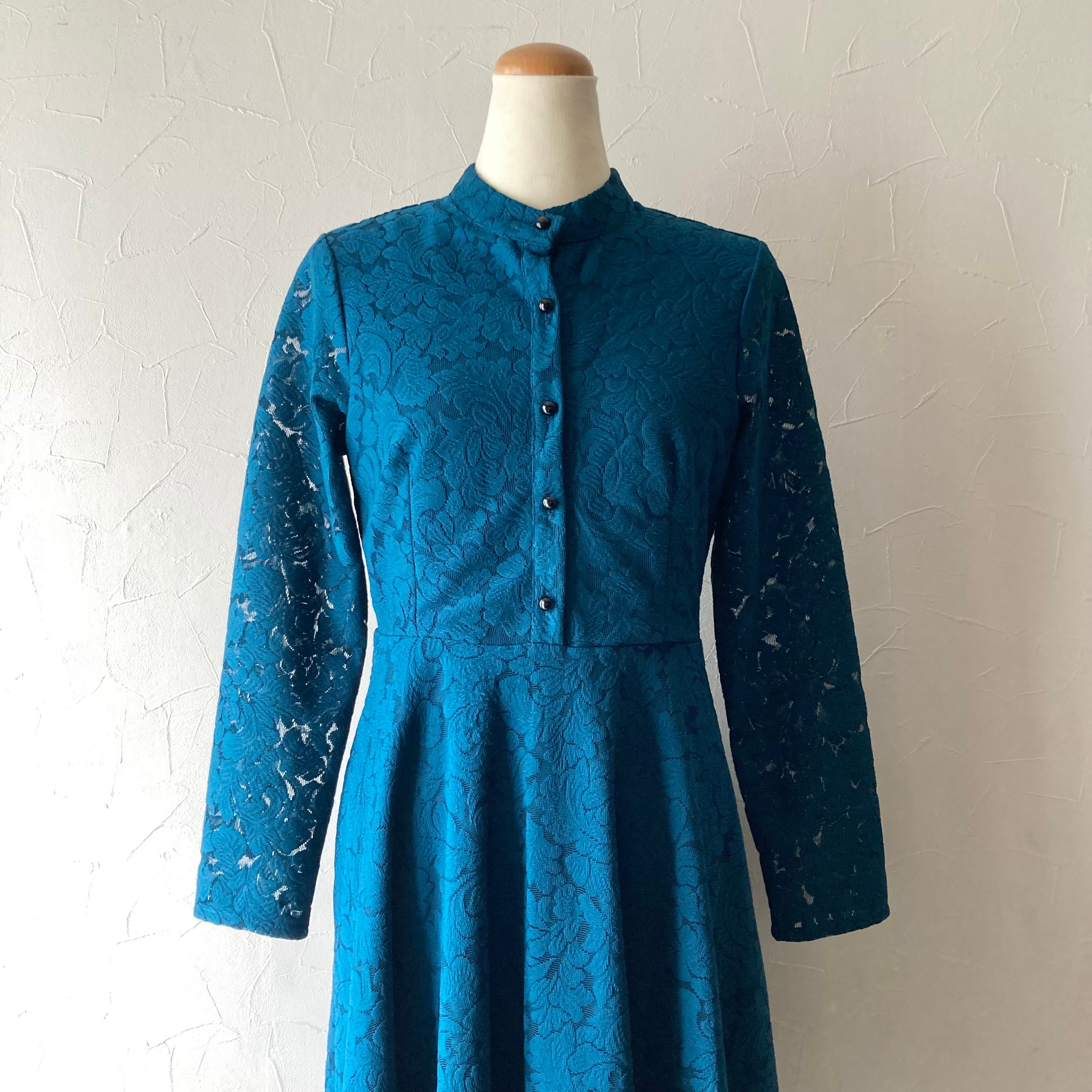グリーンとブルーが混ざったようなとても素敵なお色のワンピース◯ レースも可愛いです。トップはタイトにスカート部分はひらひらと華やか。控えめながらも美しいシルエットです。