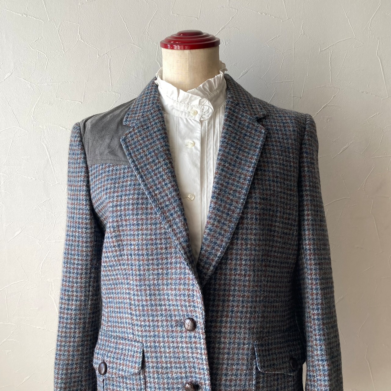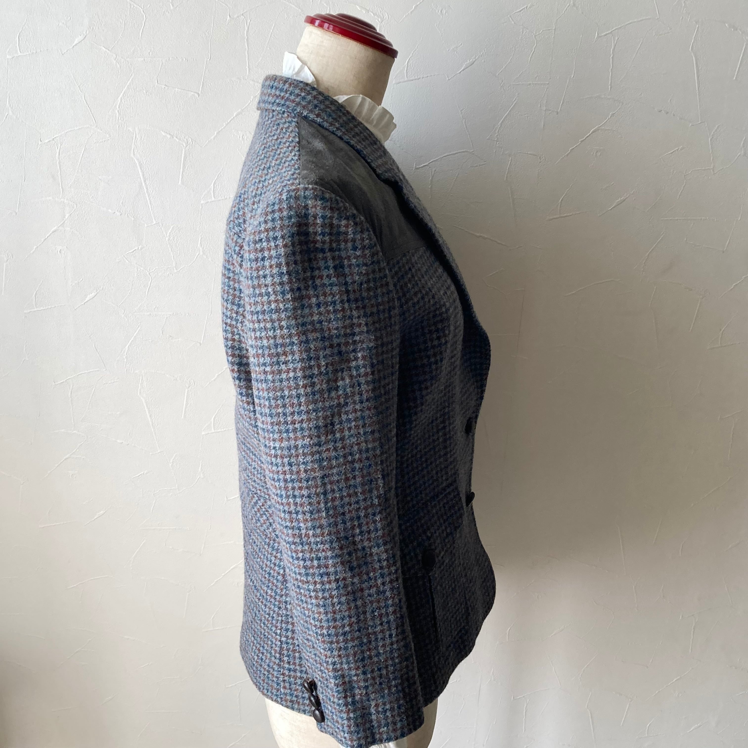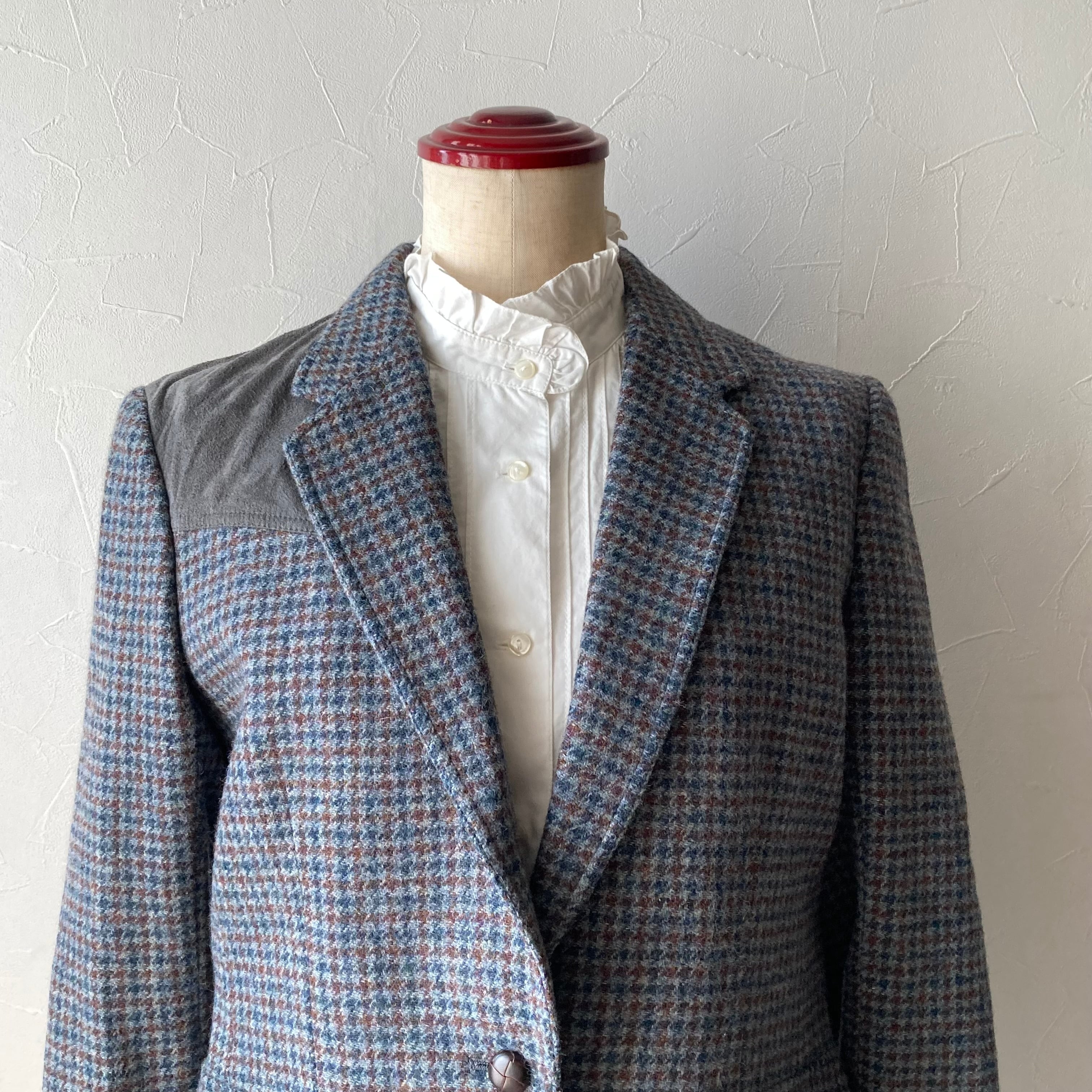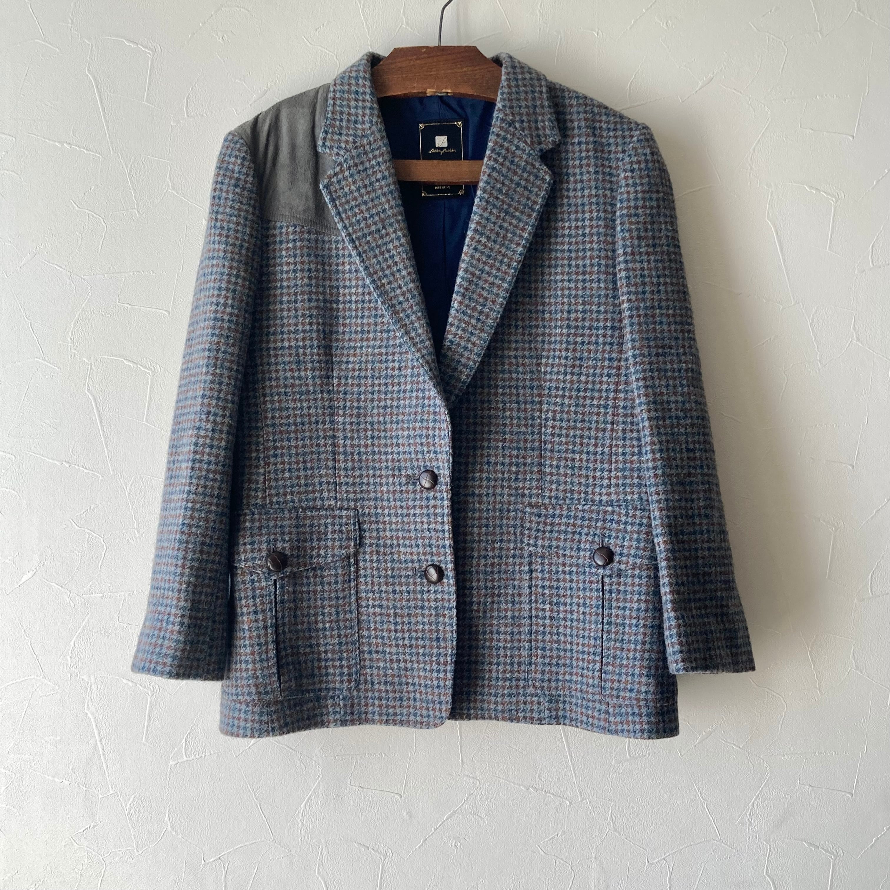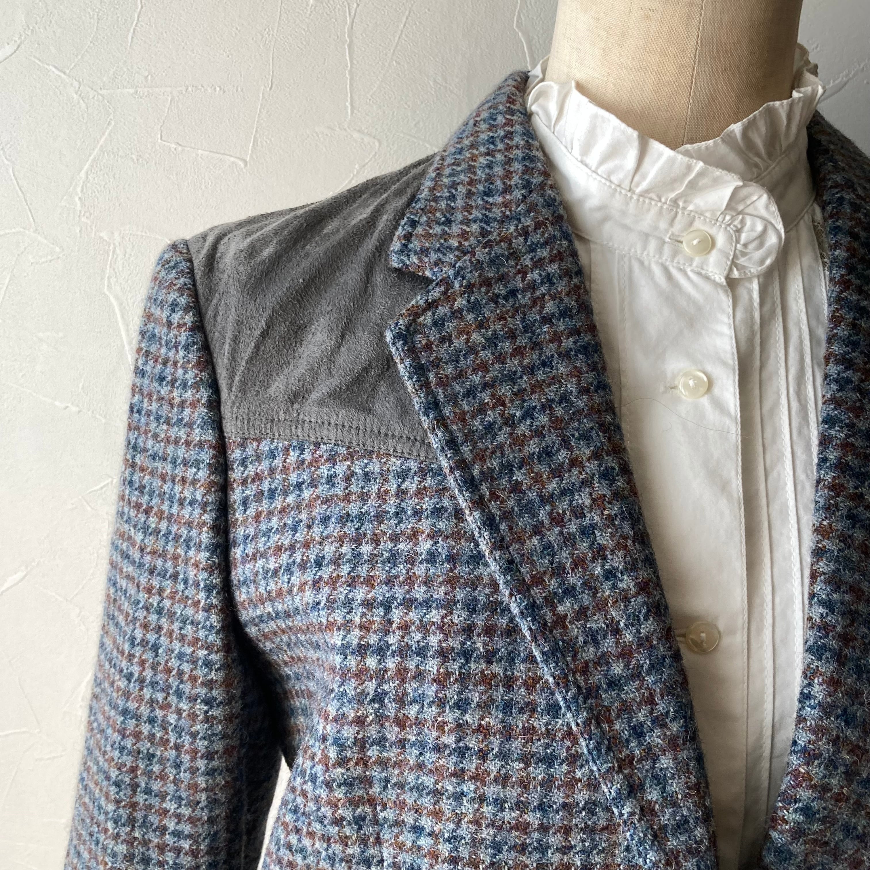ブルー×ブラウンの千鳥格子た肩にはスウェード風の異素材、ウッドボタンでレトロな雰囲気漂うウールジャケット。女性に着やすいサイズ感でデニムやパンツスタイルで古着らしいコーデを楽しめます。