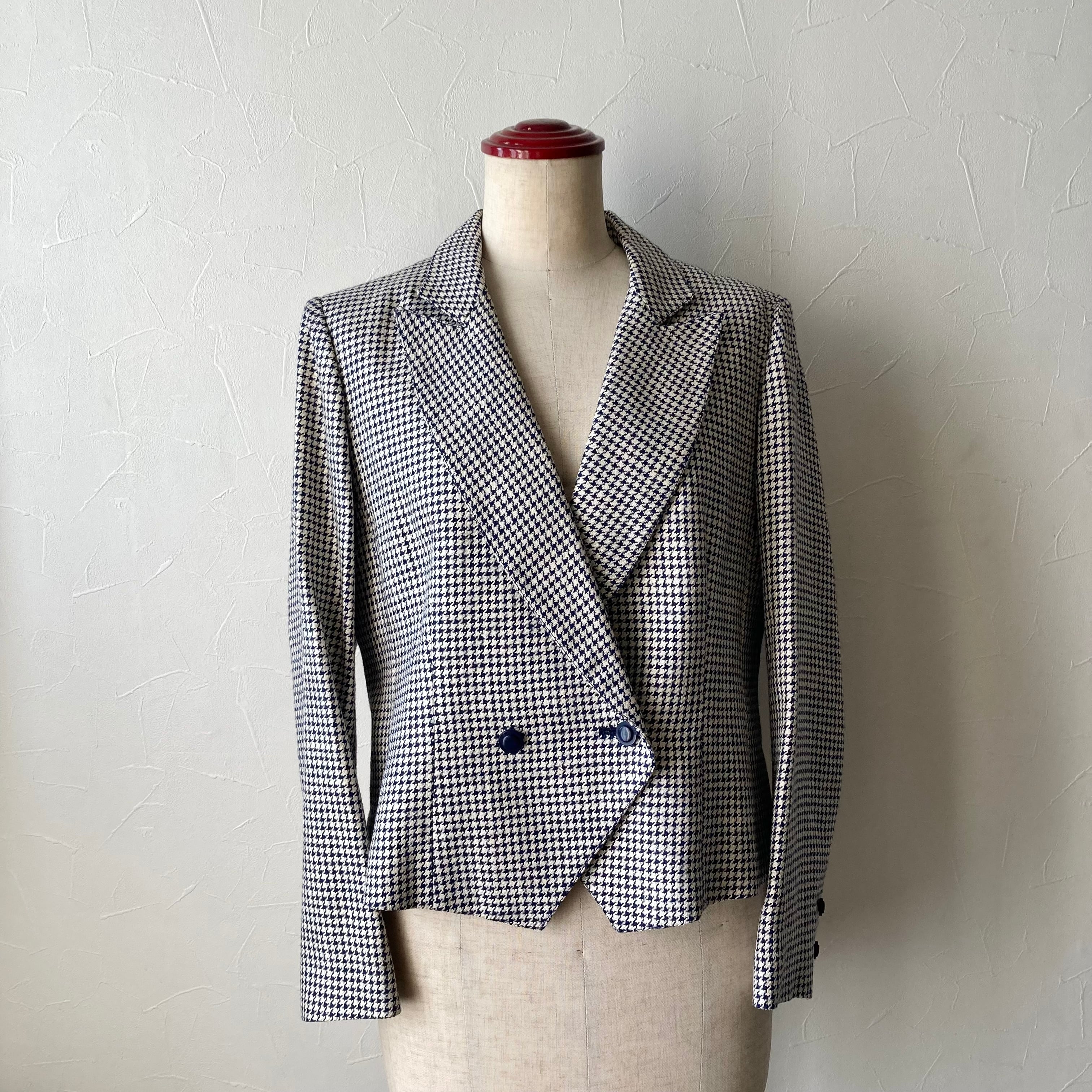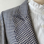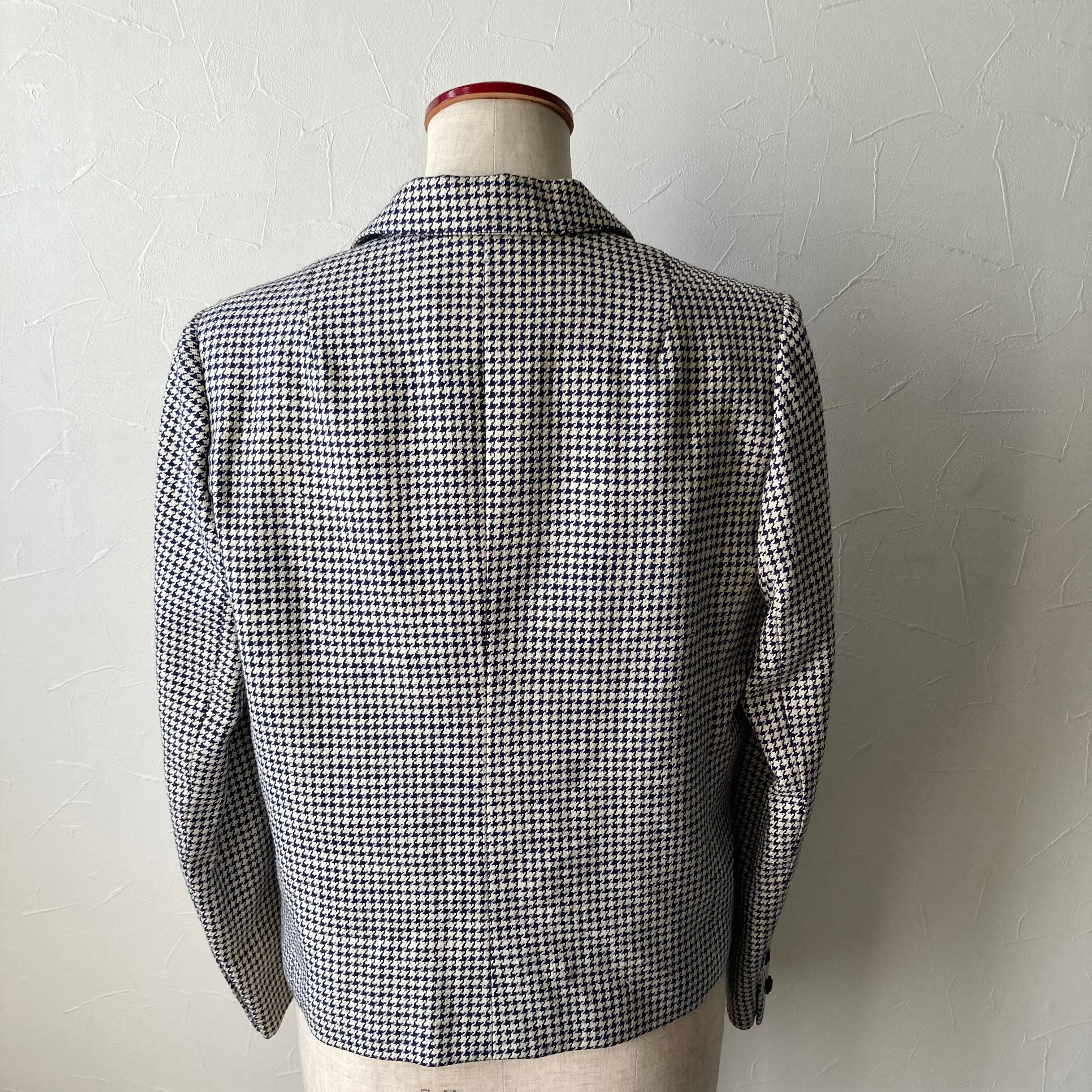 ネイビーの千鳥格子がレトロで可愛らしいデザインジャケット。襟の形、ボタンが2つなのが可愛いです。絹混素材で上品な雰囲気。肩パッドが入っていますがシルエットがきれいなのでそのままにしてあります。