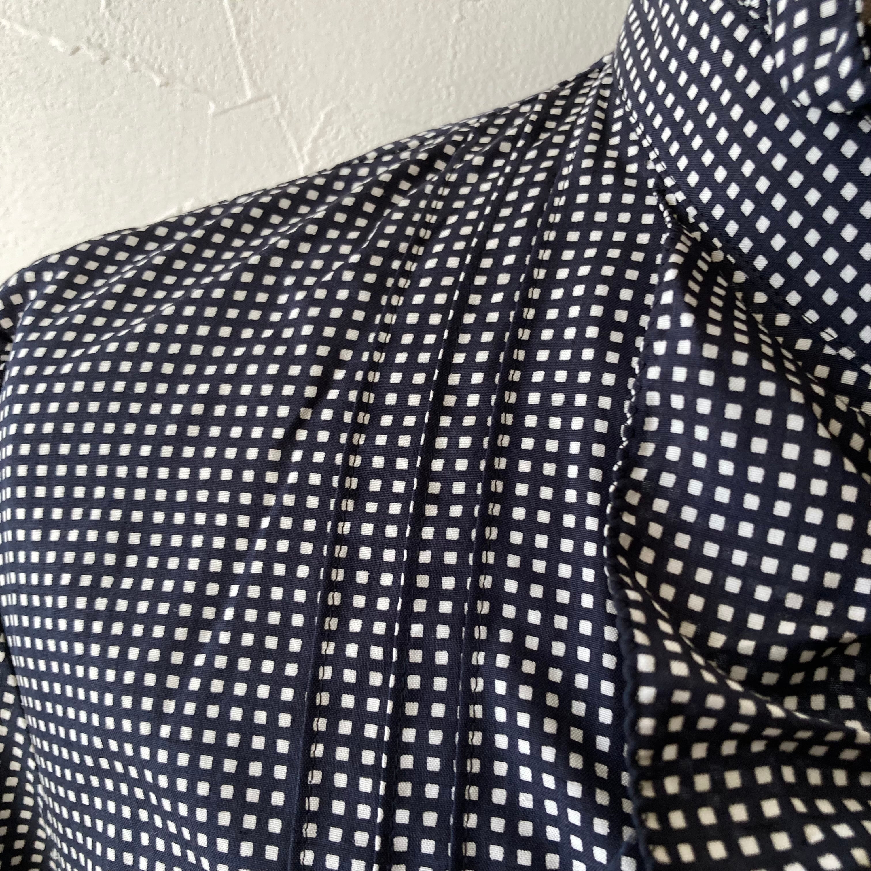 小さな四角い柄が可愛らしいフリルブラウス。たっぷりめなフリルもレトロでキュート。ボタンもさりげなく四角いのです。モノトーンなのでフリルも甘くなりすぎない着やすい一枚です。