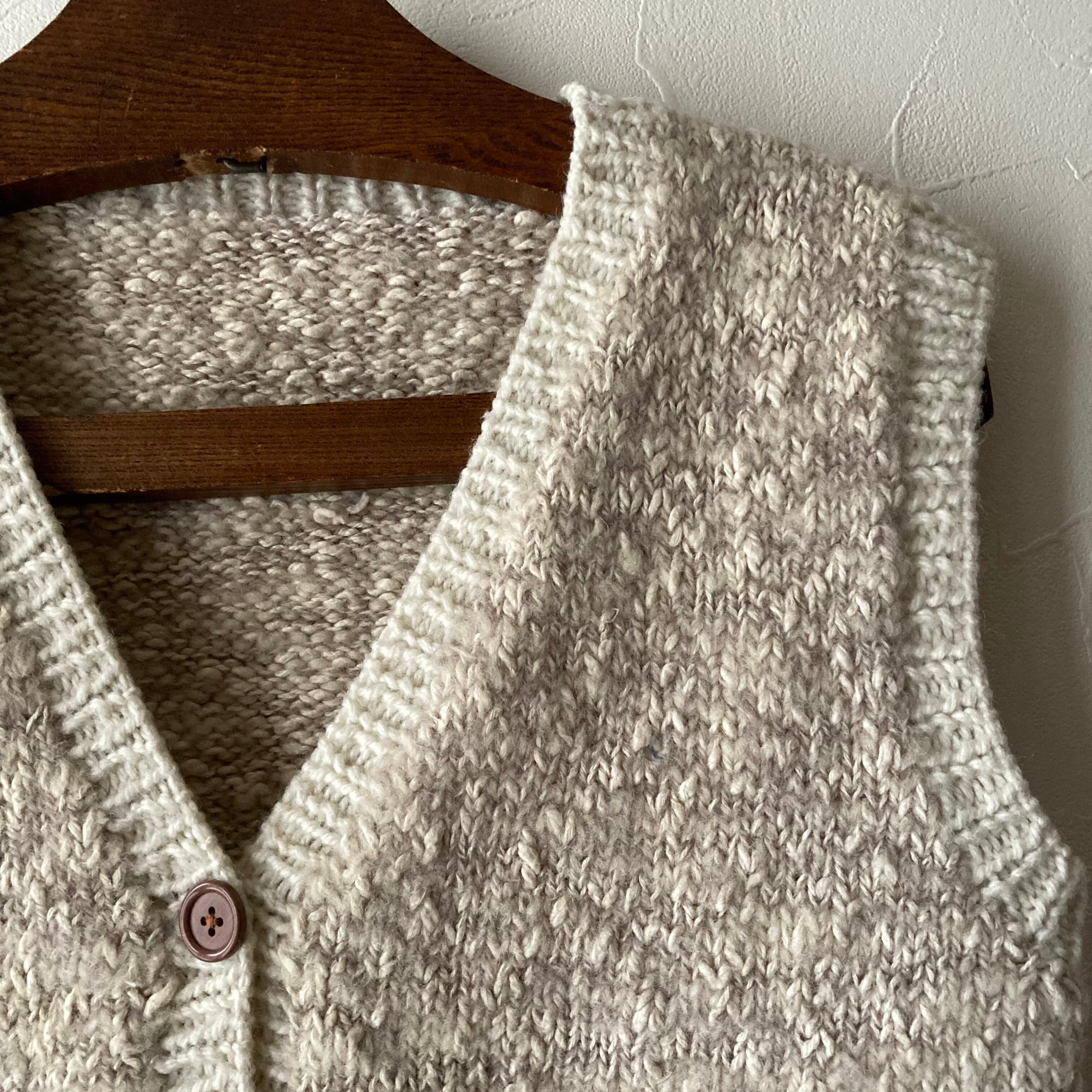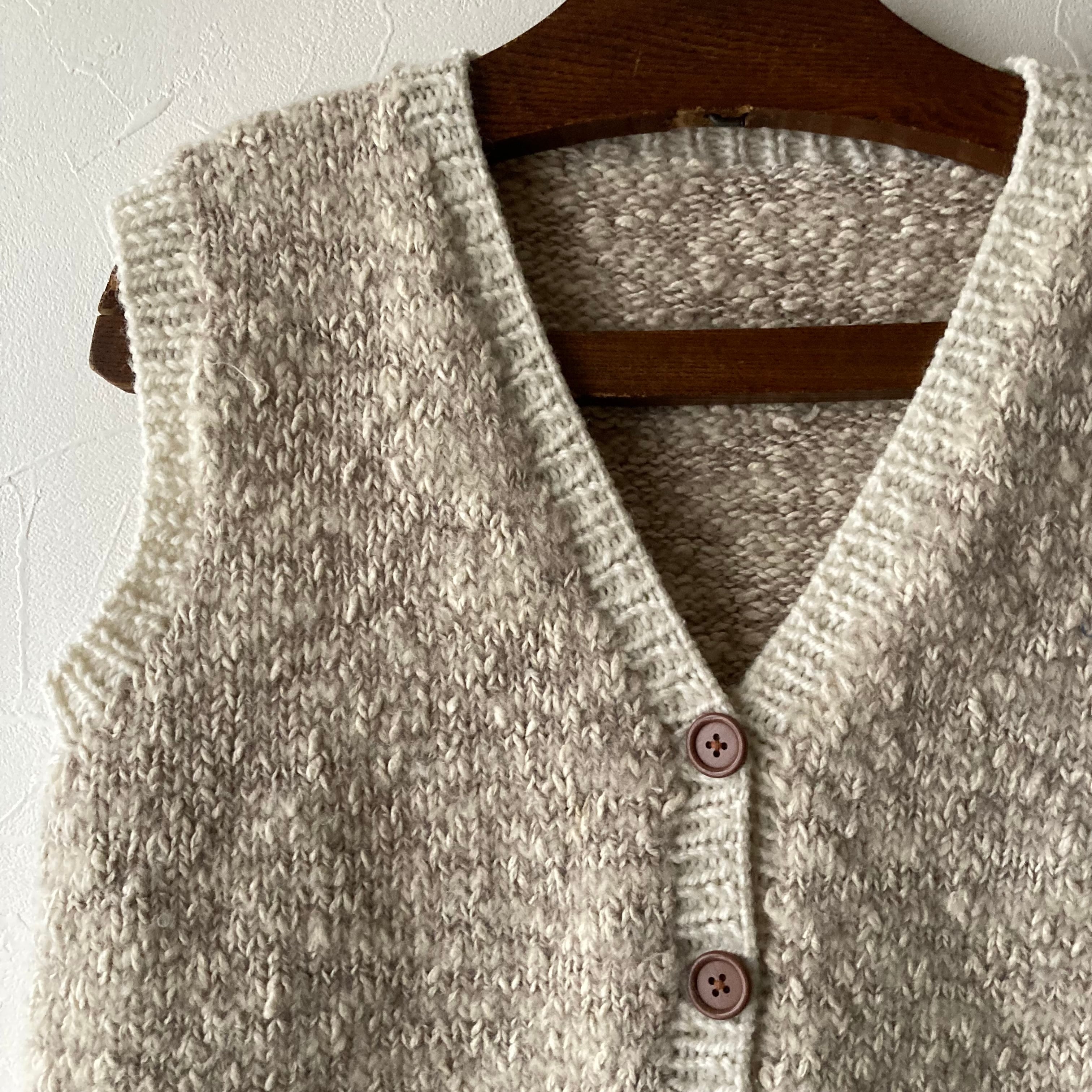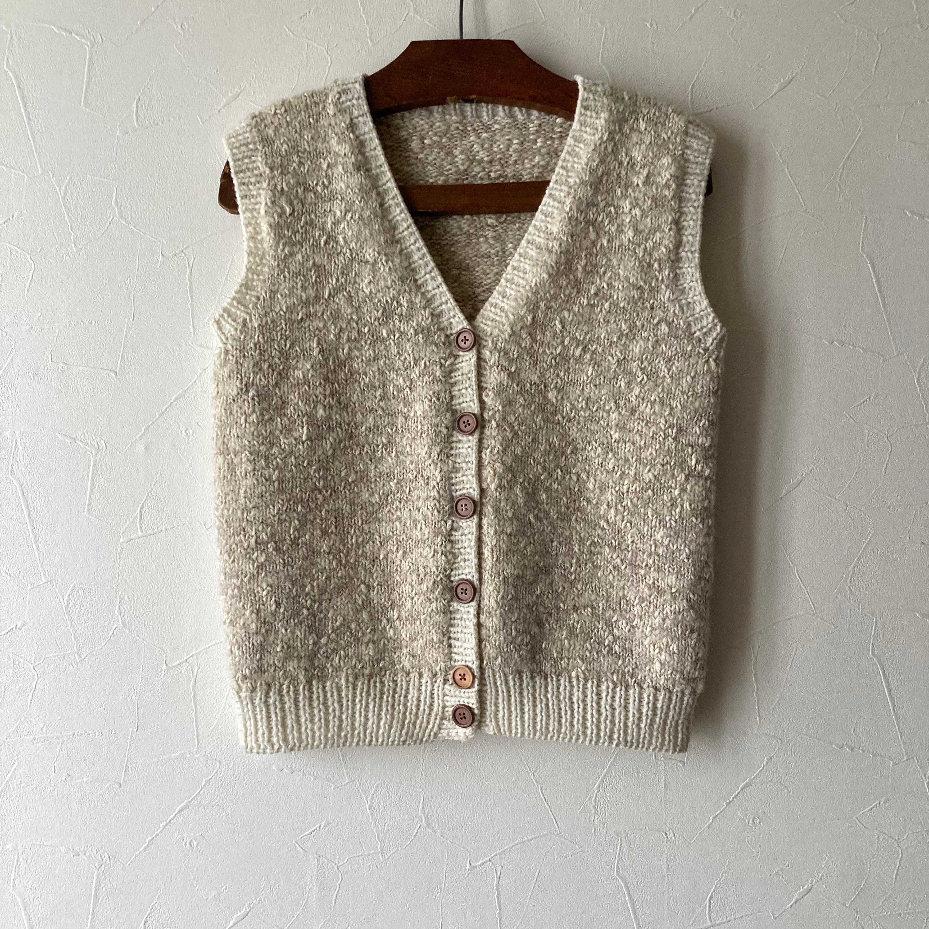 厚みのあるもふもふした素材のハンドメイドのベスト◯ ウッドボタンも可愛いです。一つ色違いのボタンが付いていますがそれも愛嬌♡可愛く見えます。小さめなサイズ感でボリュームのあるボトムと合わせると可愛いです。