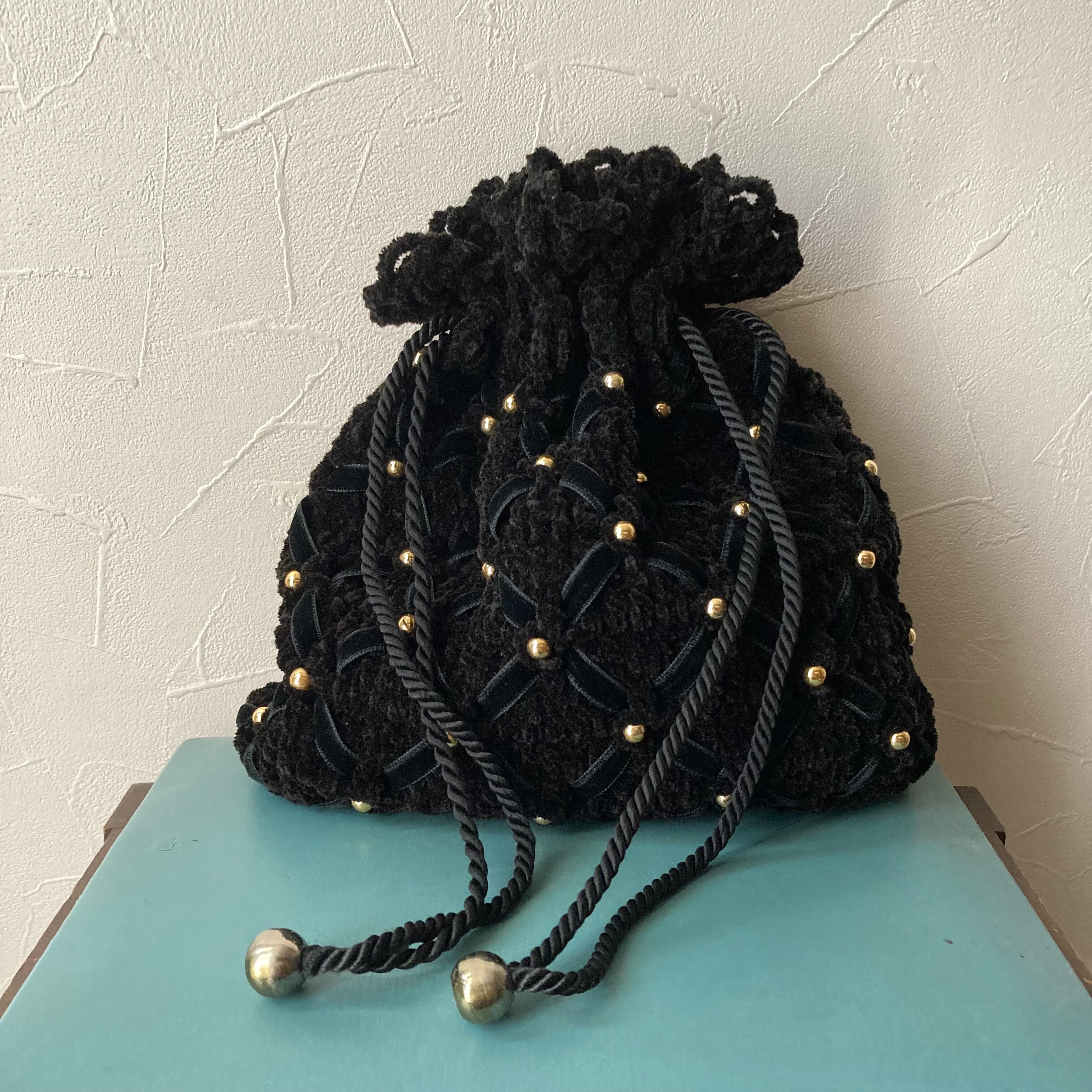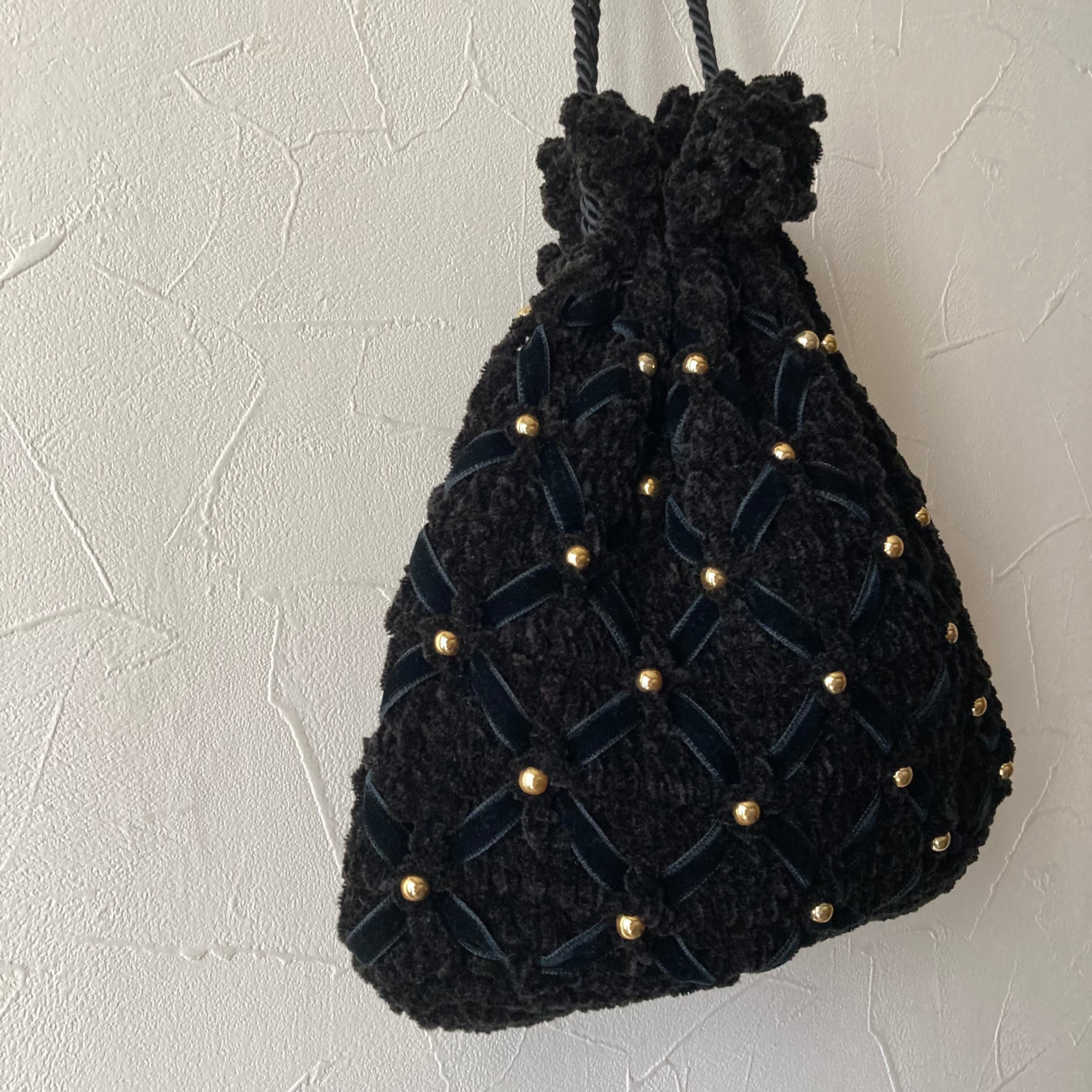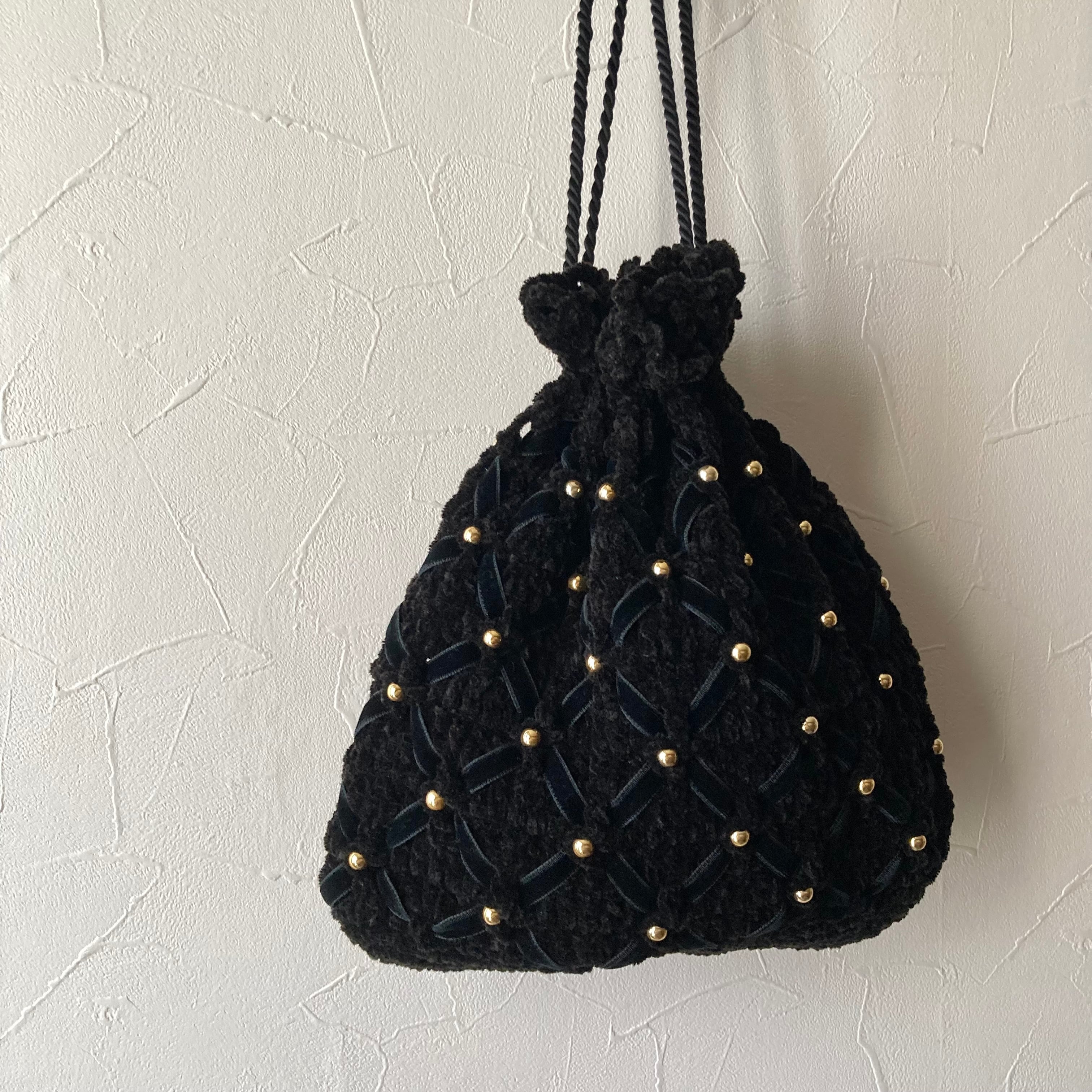 黒のもこもこ毛糸とゴールドビーズ、ベルベットテープが編まれた上品な巾着バッグ◯