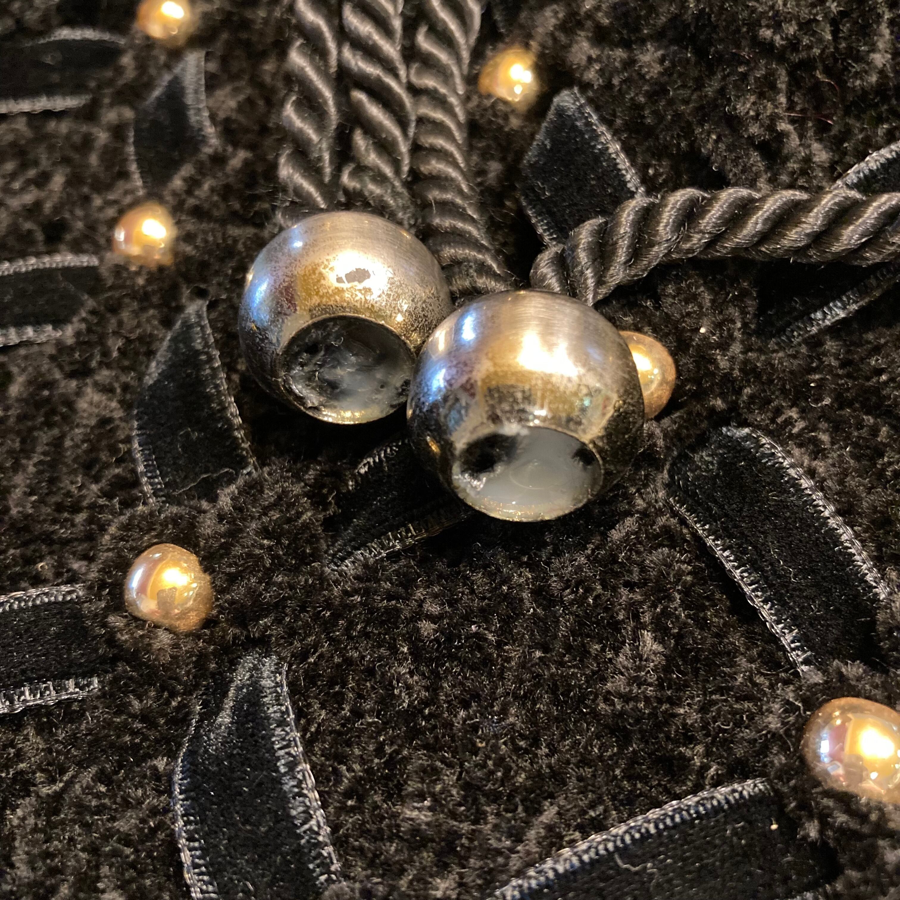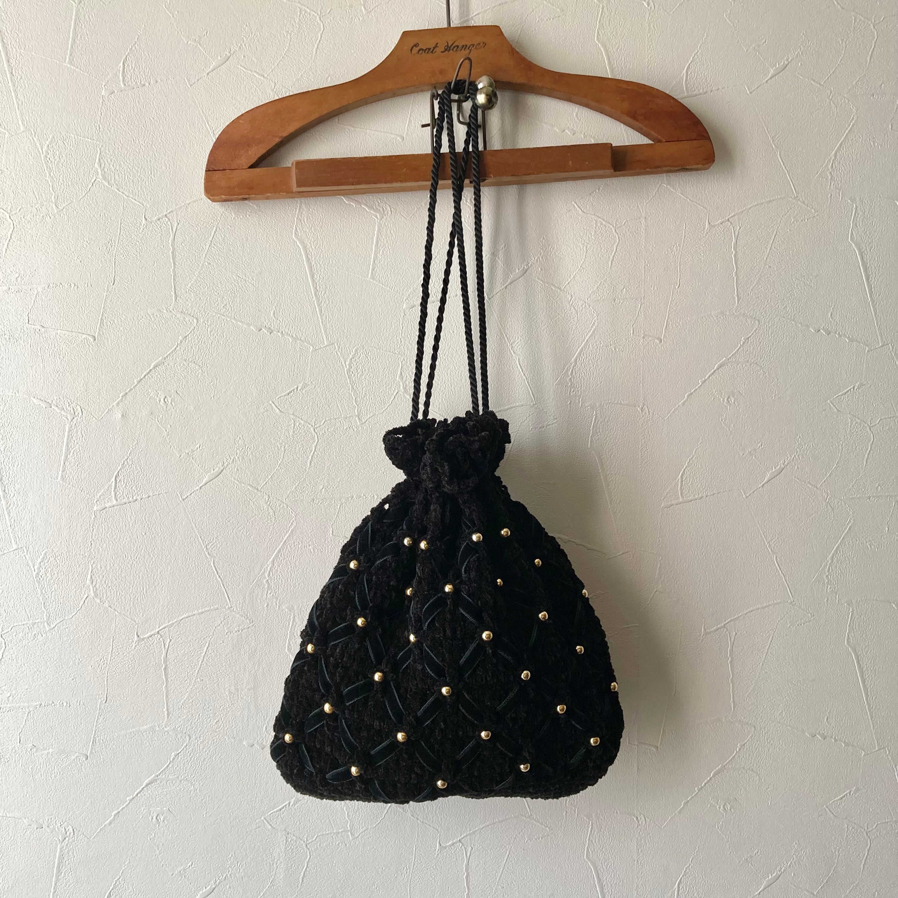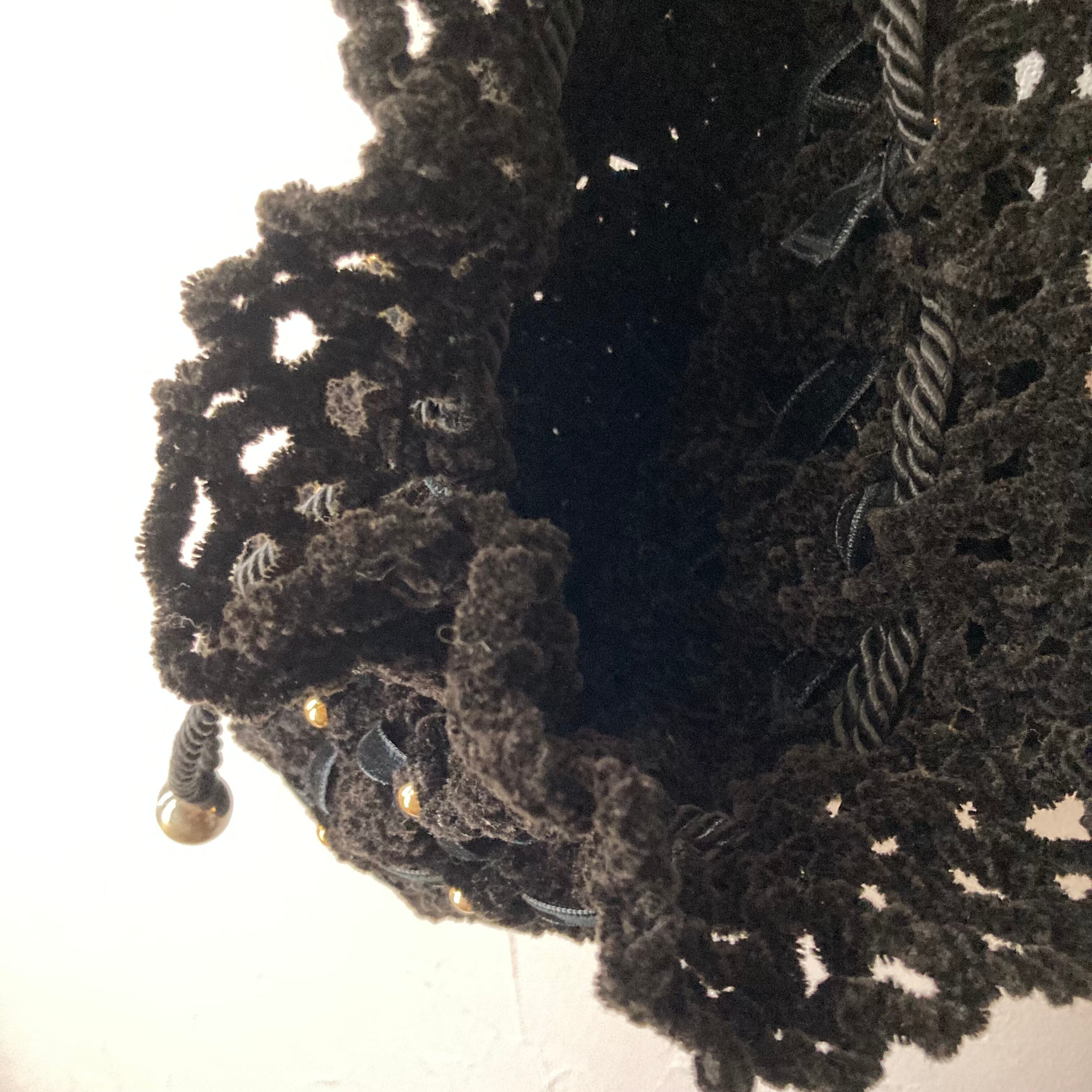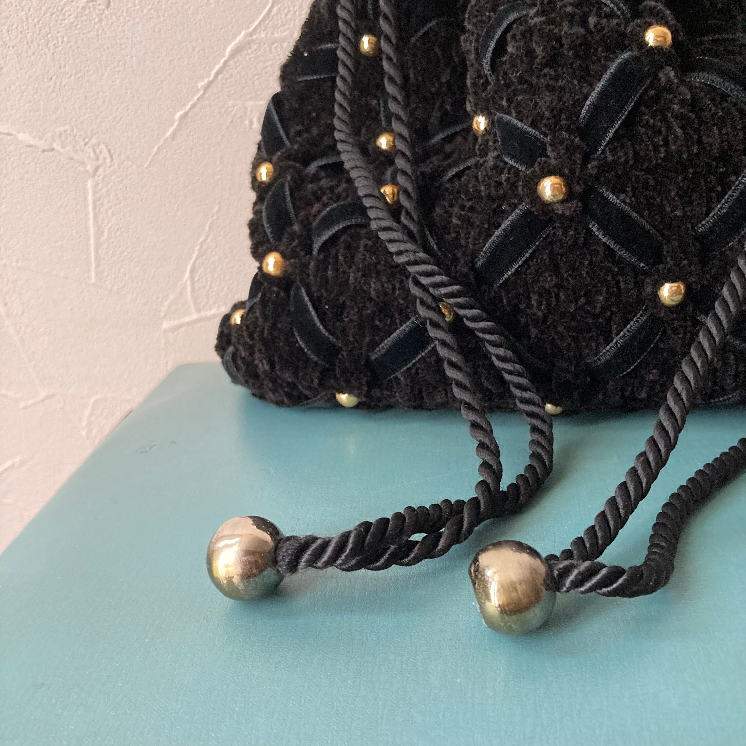 黒のもこもこ毛糸とゴールドビーズ、ベルベットテープが編まれた上品な巾着バッグ◯
