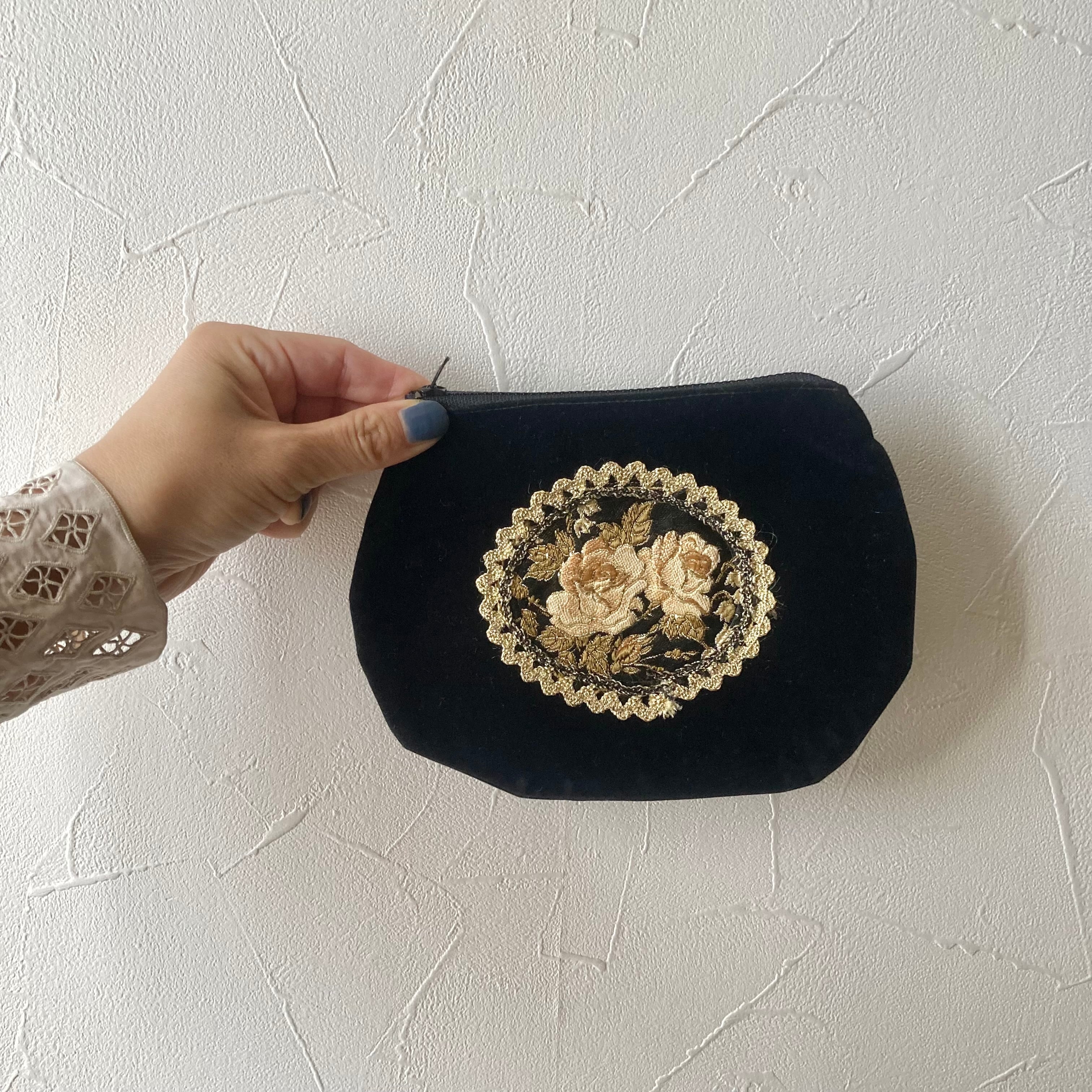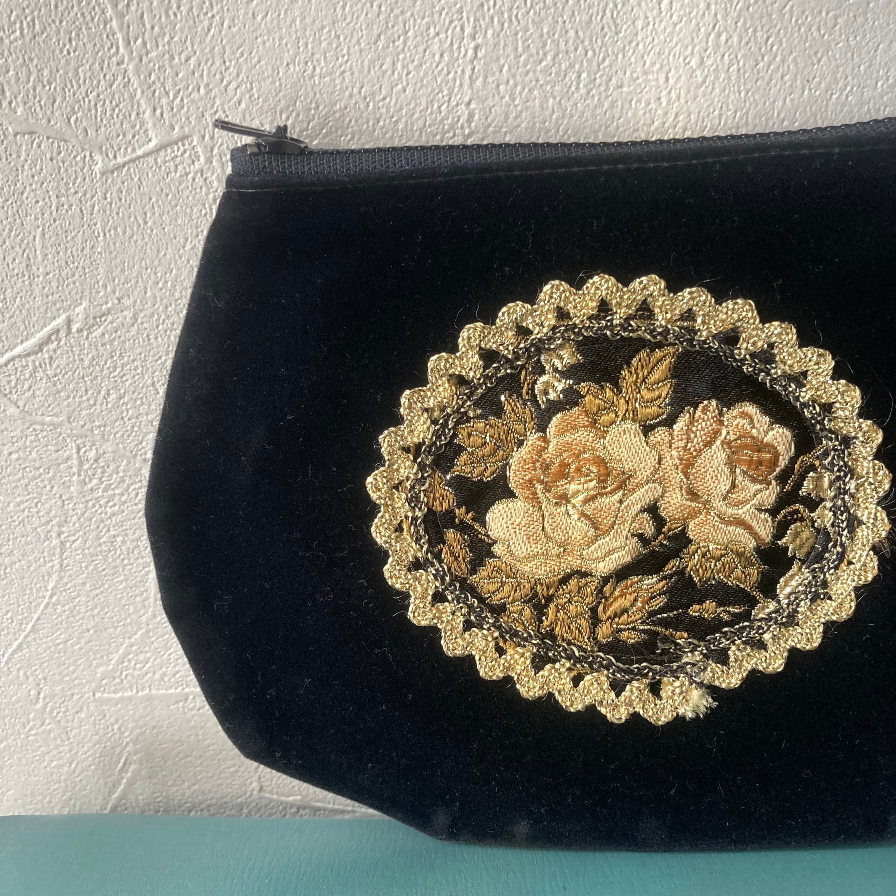 黒の別珍にゴールドの花刺繍がレトロな小さなポーチ◯ メイク道具や小物入れに。