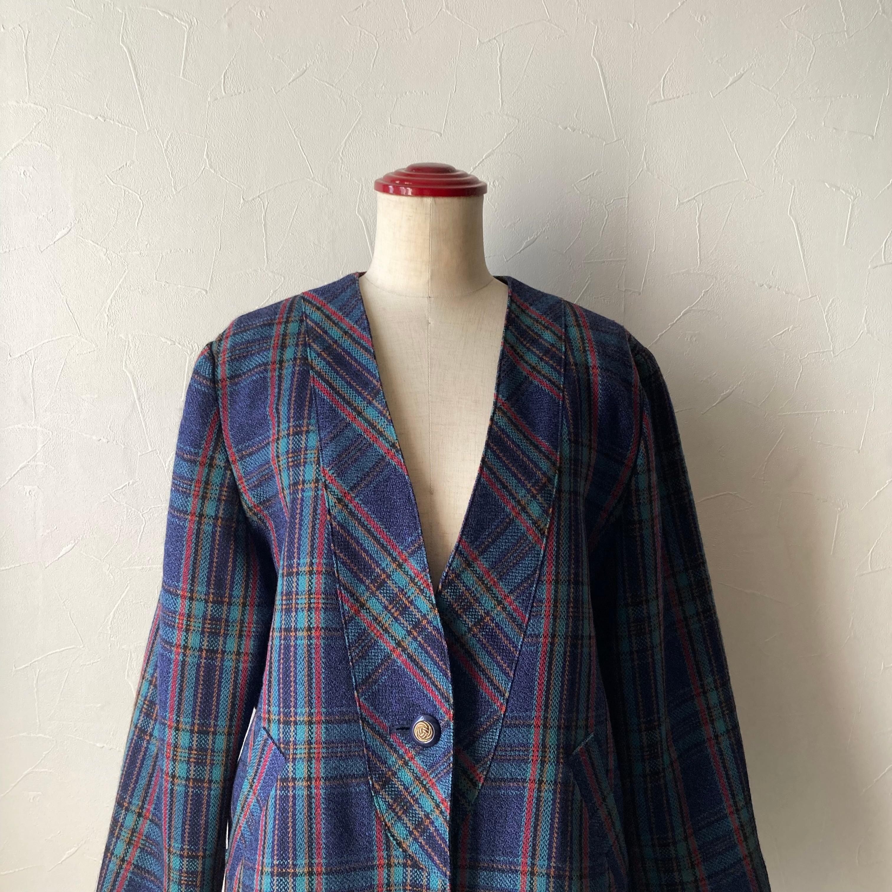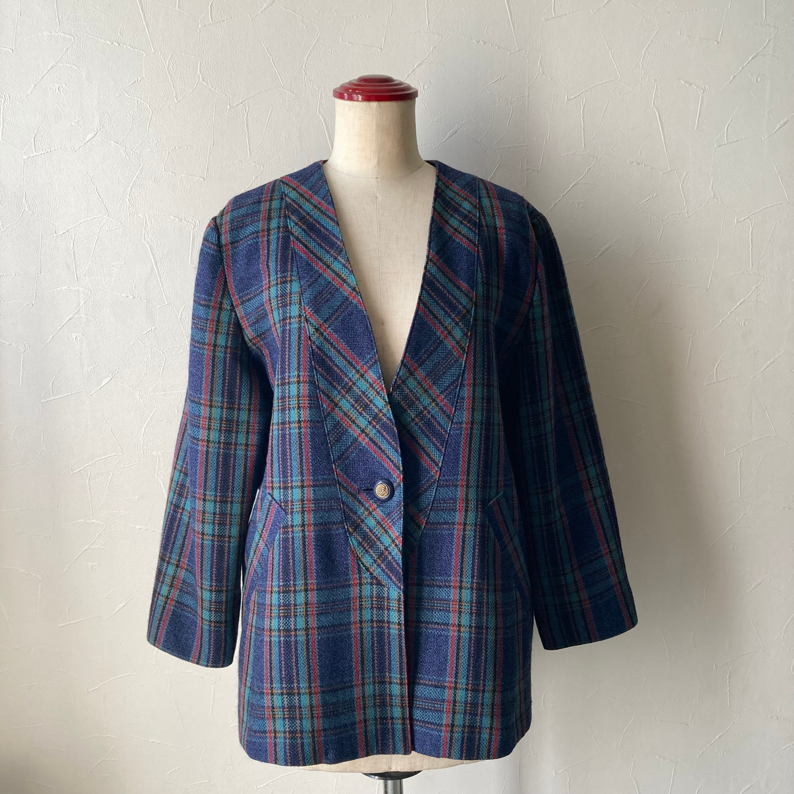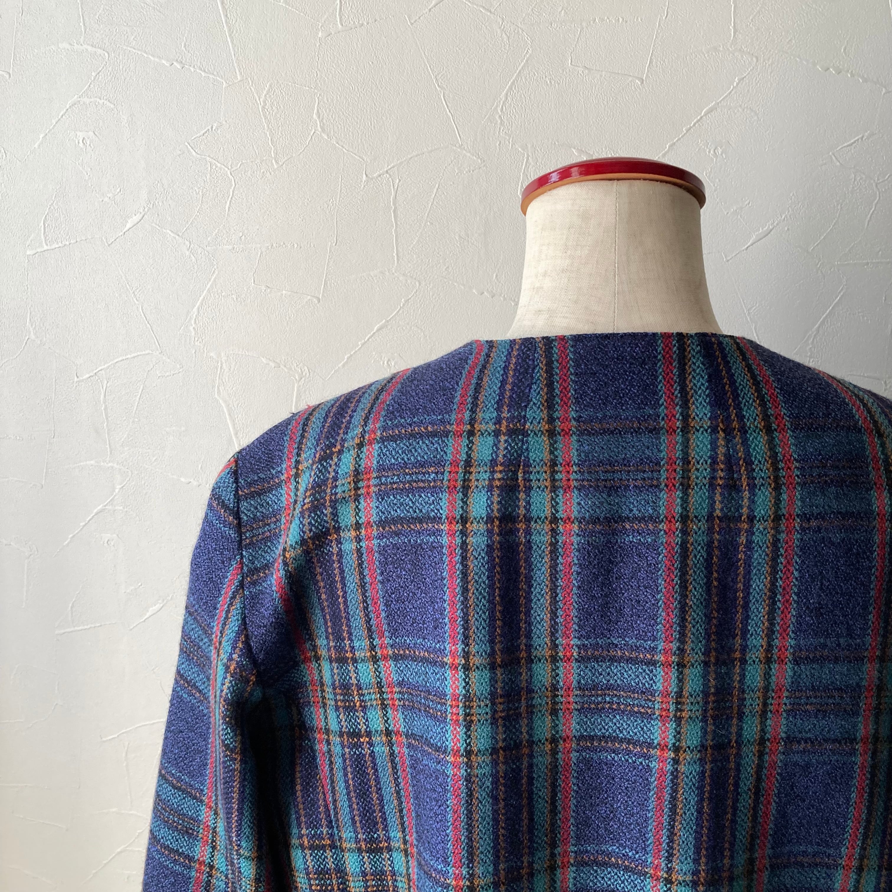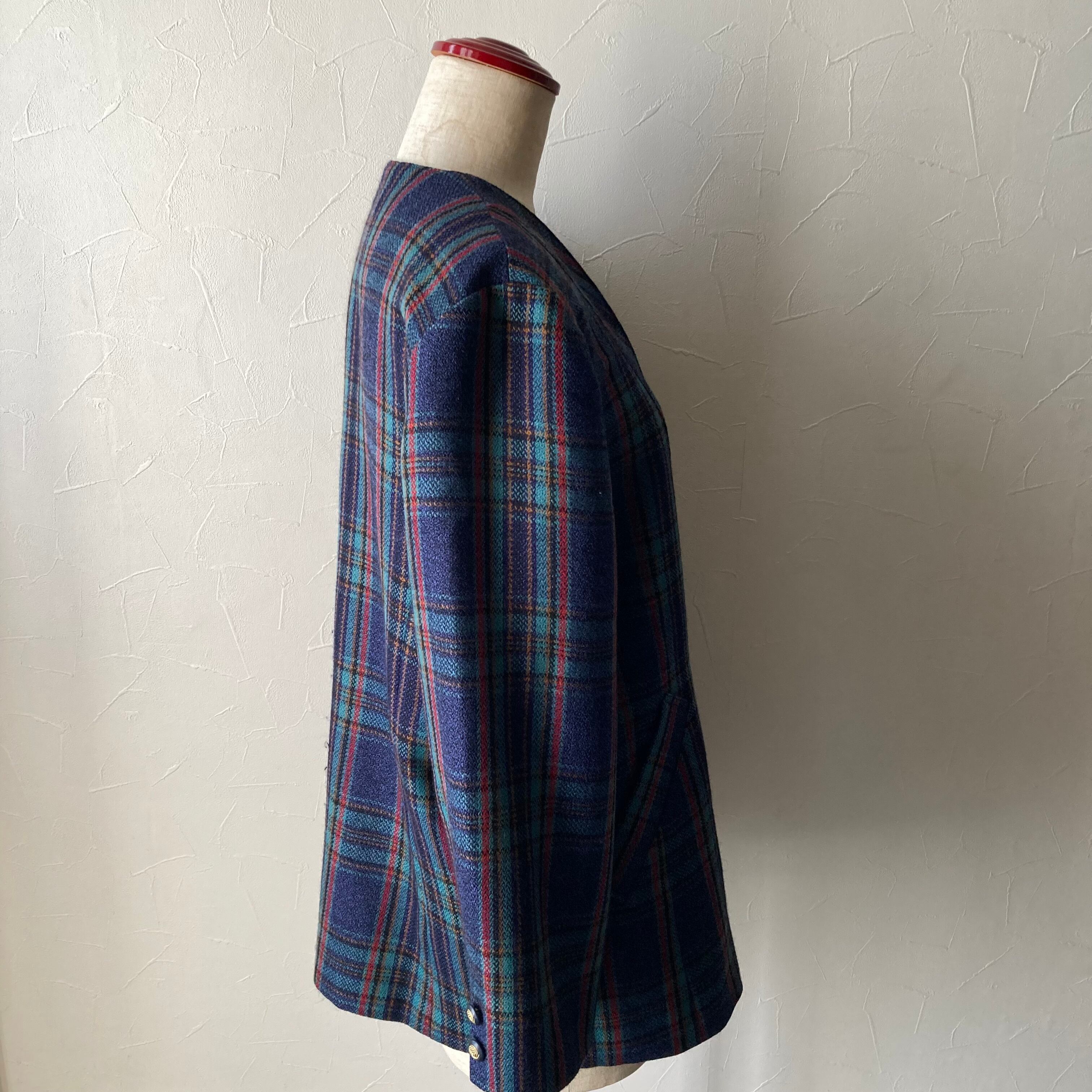 ネイビーチェックノーカラージャケット 古着 used vintage レトロ
