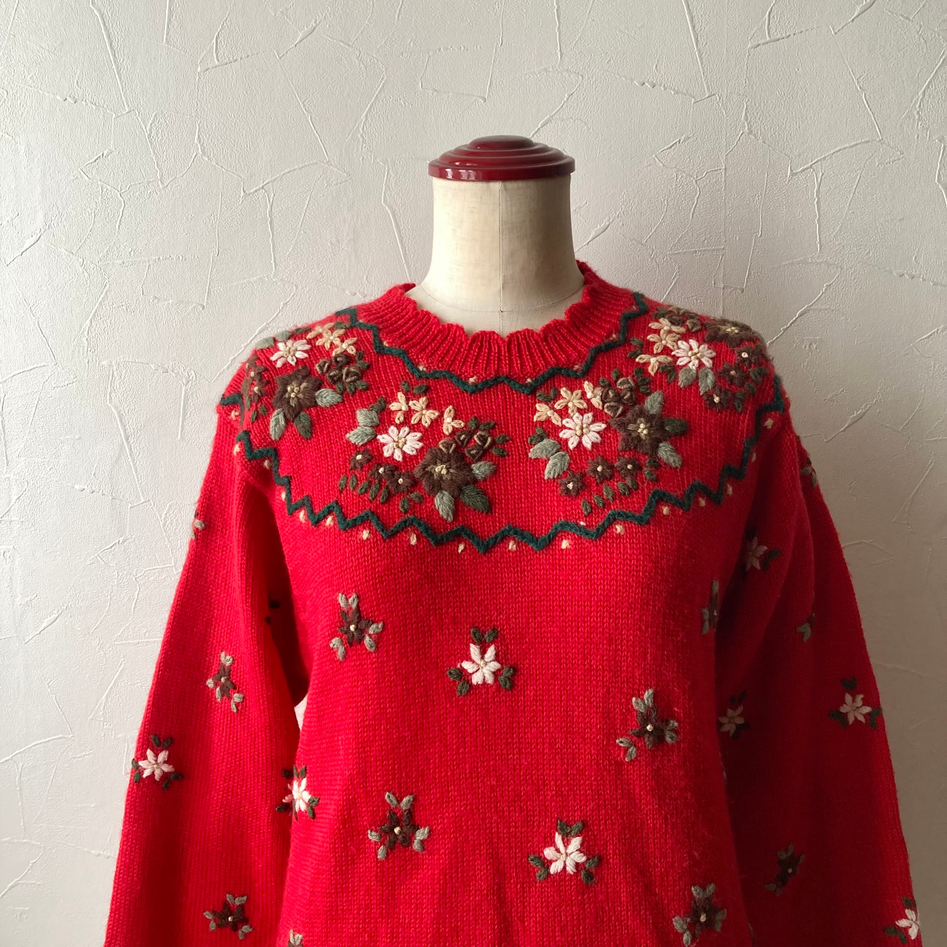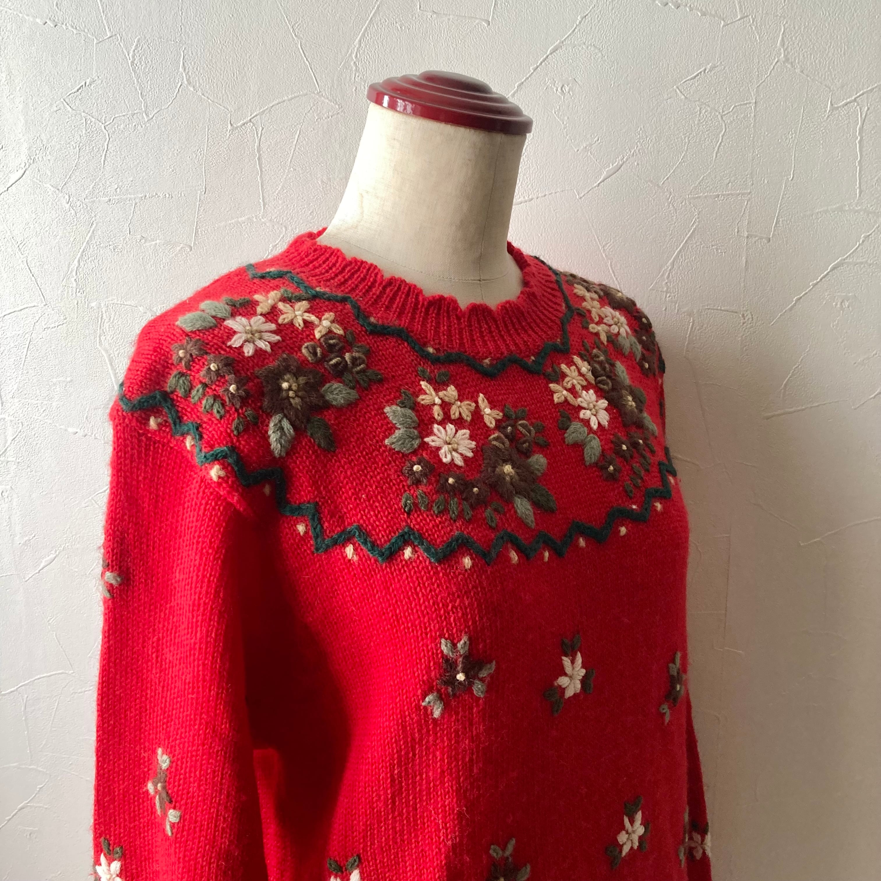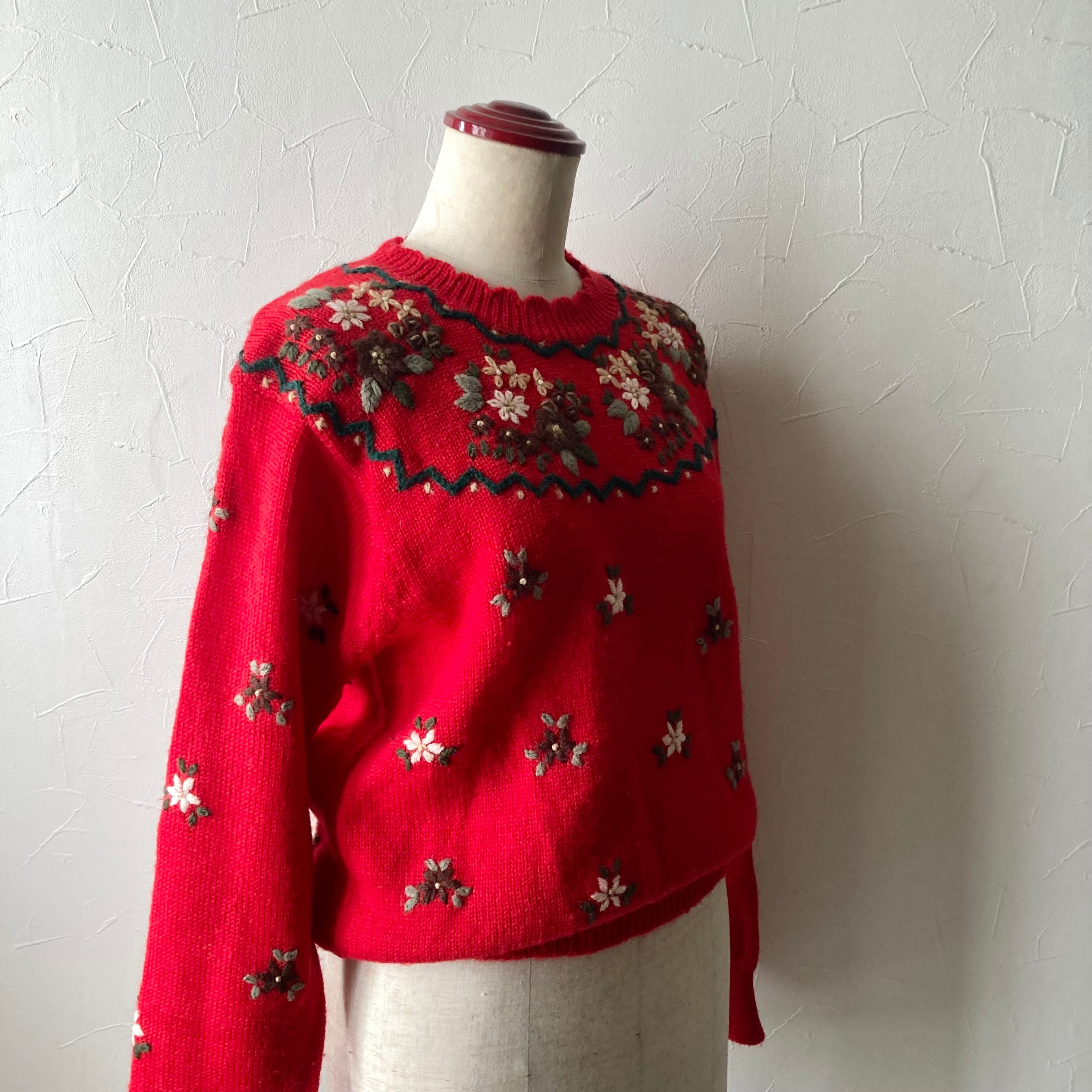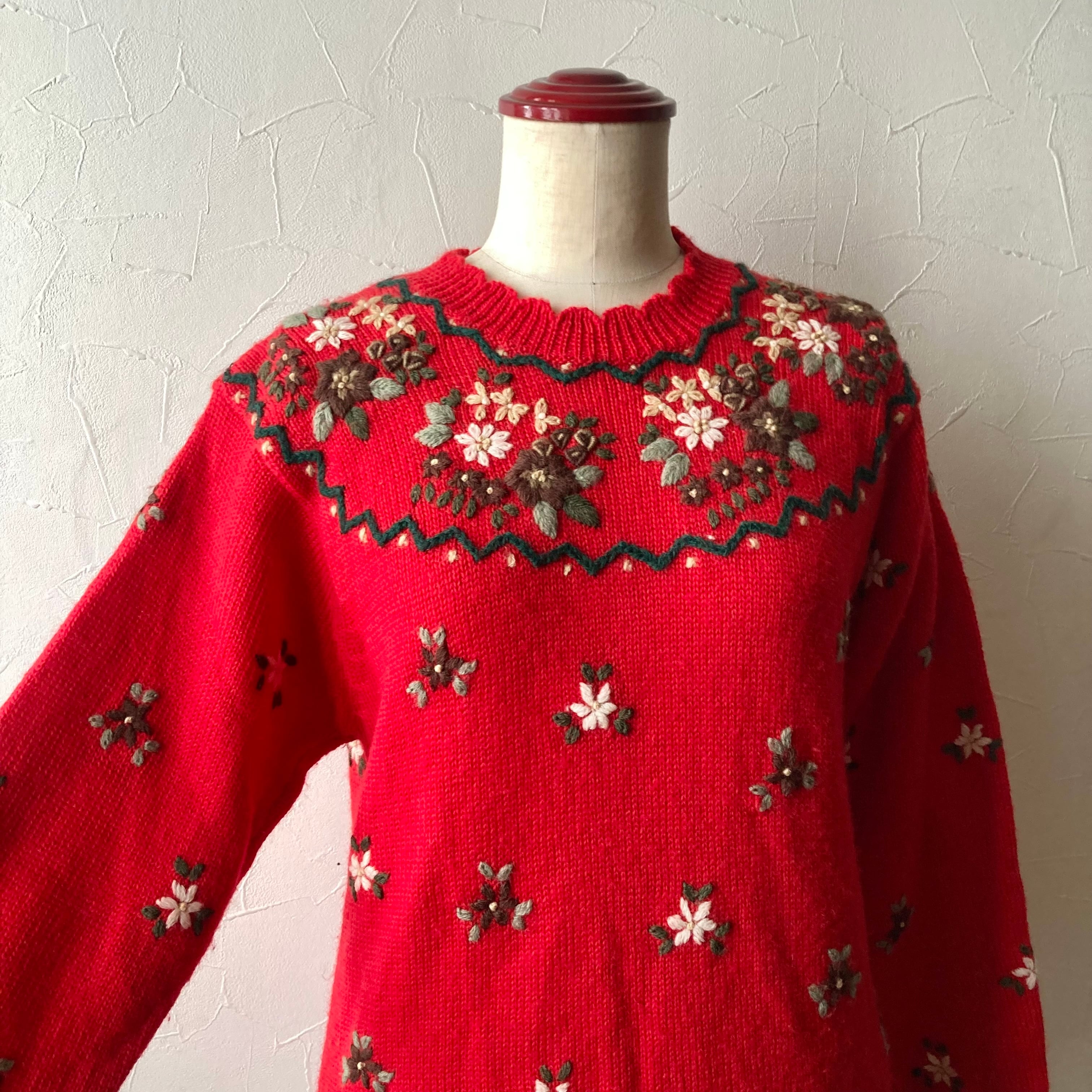 刺繍赤色ニット 古着 used vintage レトロ