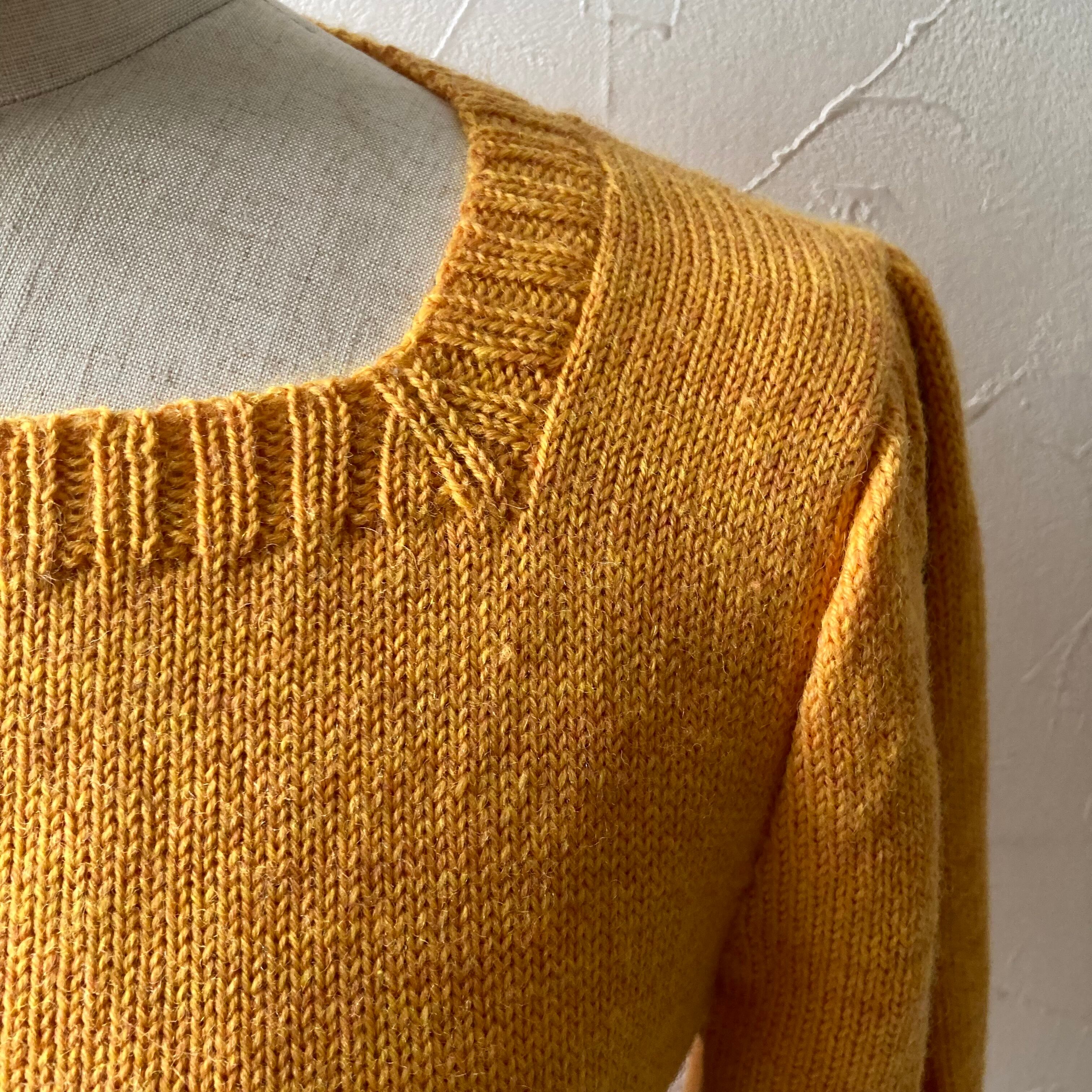 可愛いレトロなオレンジ色のパフスリーブニットトップス◯ パフスリーブに袖先は長めのリブで可愛いシルエット。裾も長めのリブでキュッとしたすっきりシルエットになっています。ハンドメイドの温もり感のあり、フレアパンツやロングスカートなどと相性が良さそうです。
