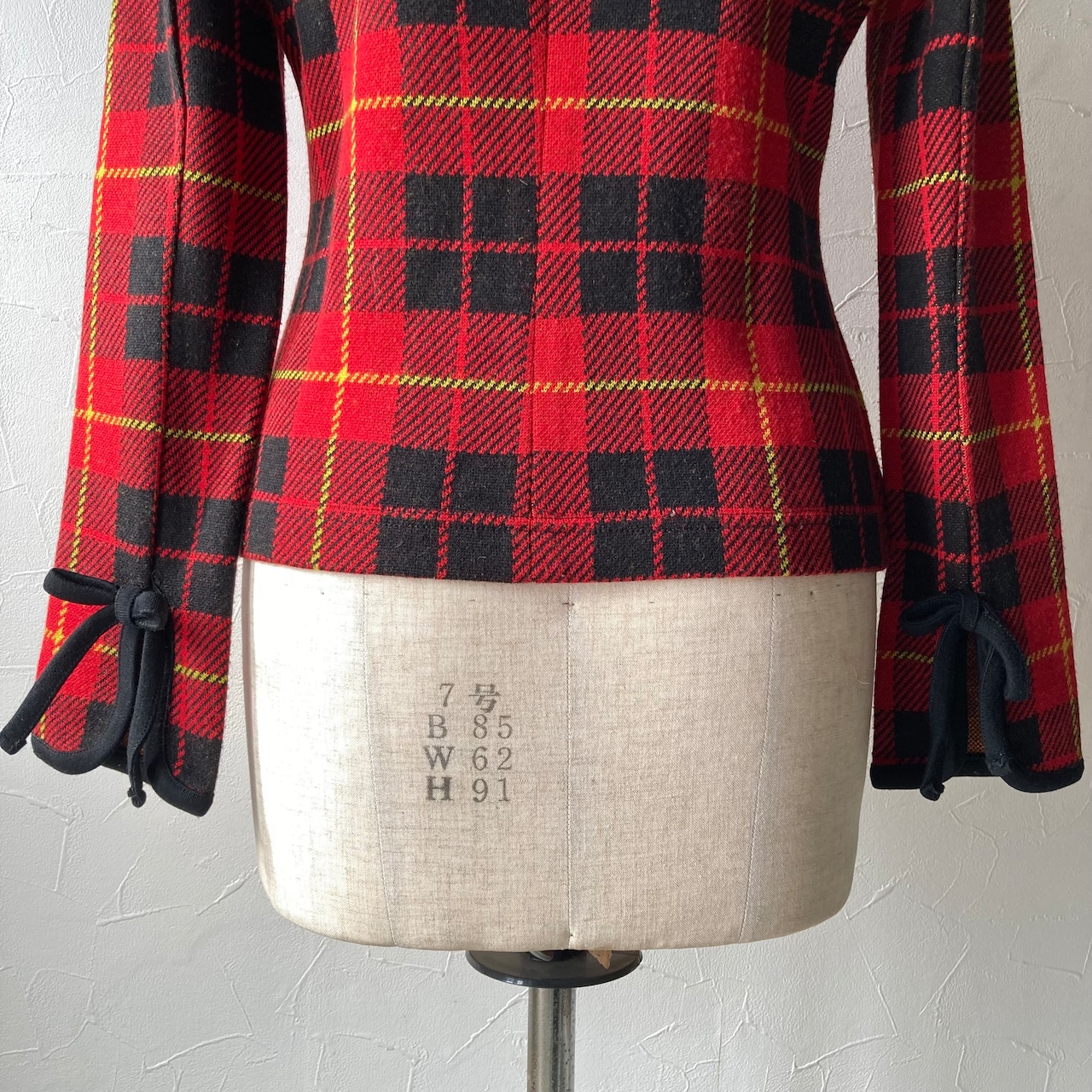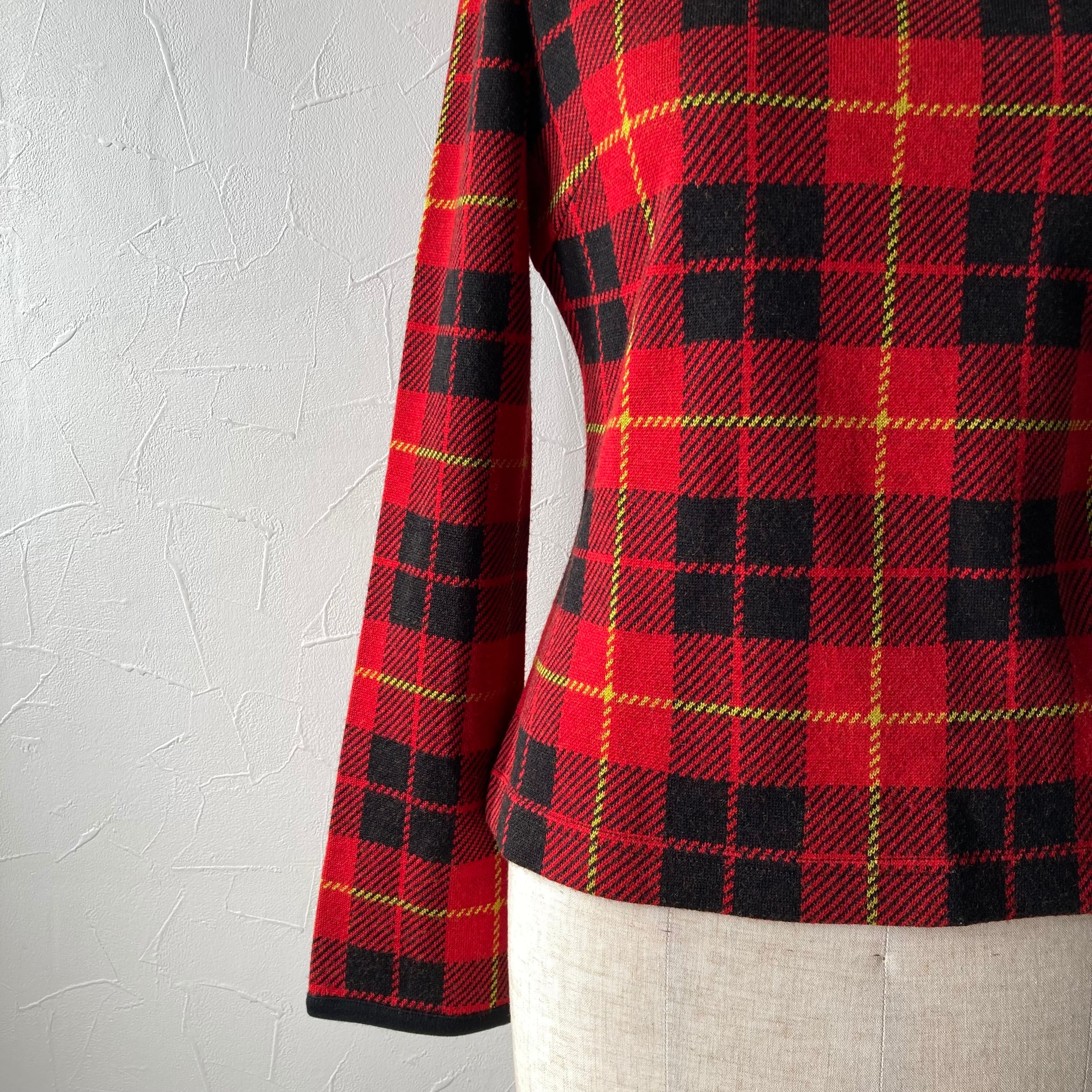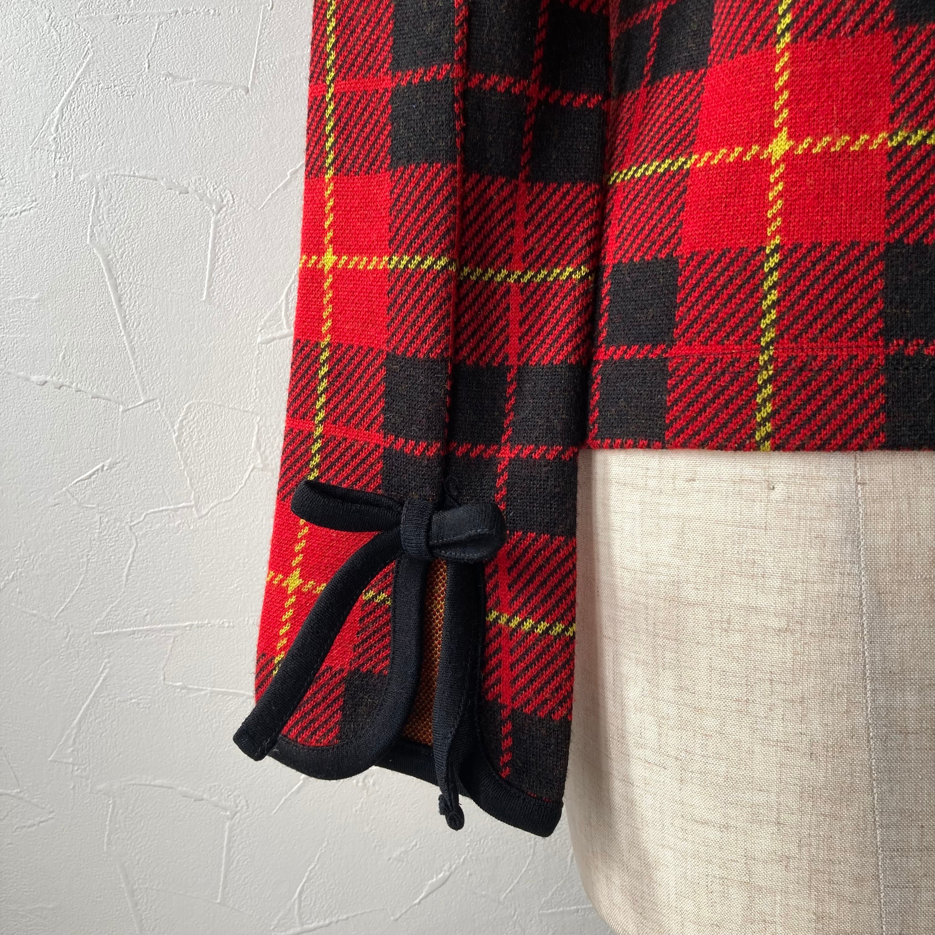赤タータンチェックリボン付ニット 古着 used vintage レトロ