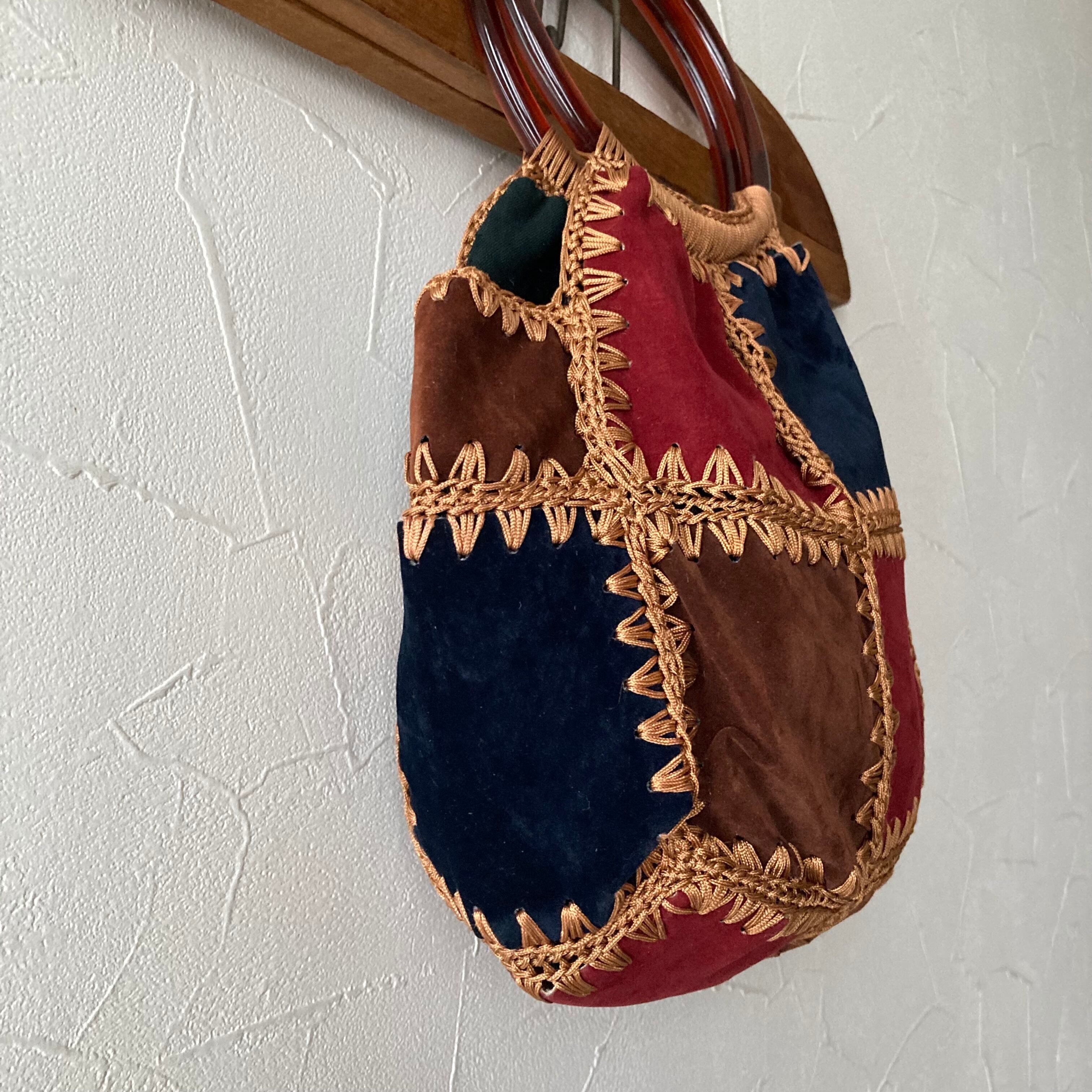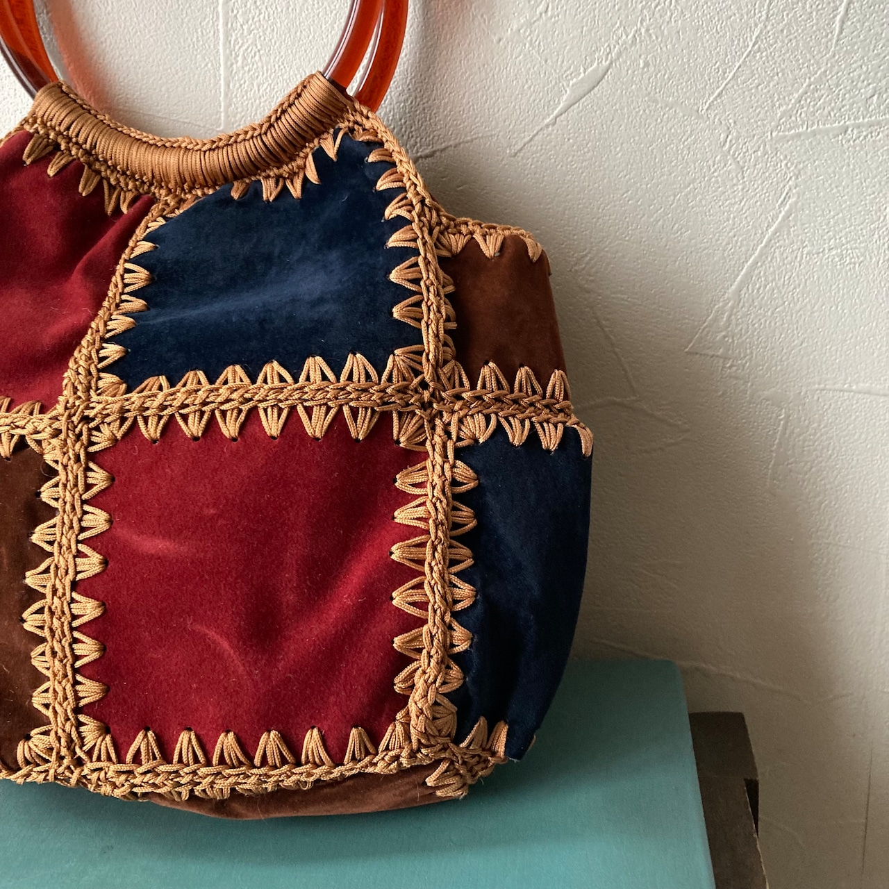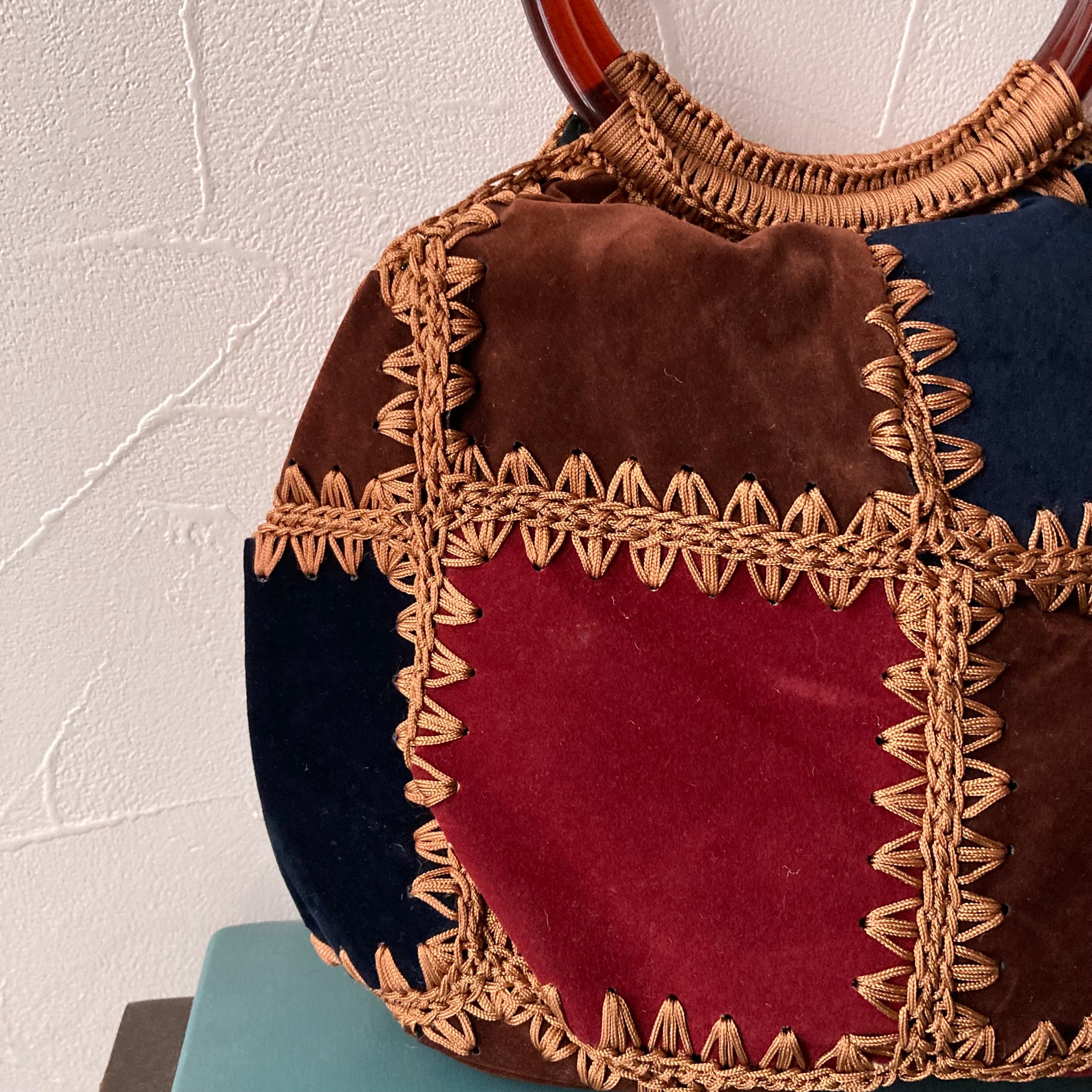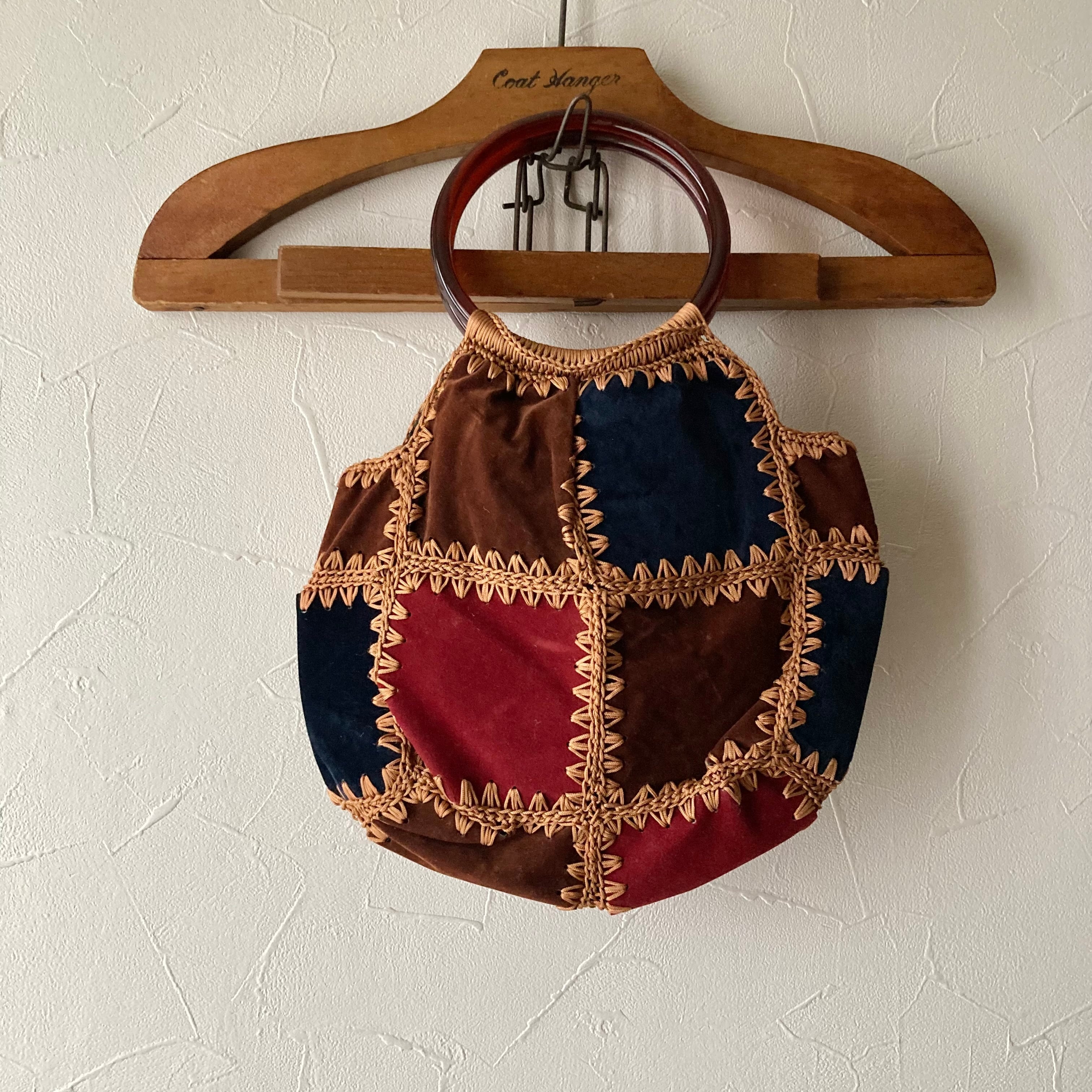 ベロアの温かな色味の組み合わせが素敵なバッグ◯丸い持ち手もレトロで可愛いです。小さめですが、お財布やお化粧ポーチ、必要なものは入る可愛いサイズ感です。