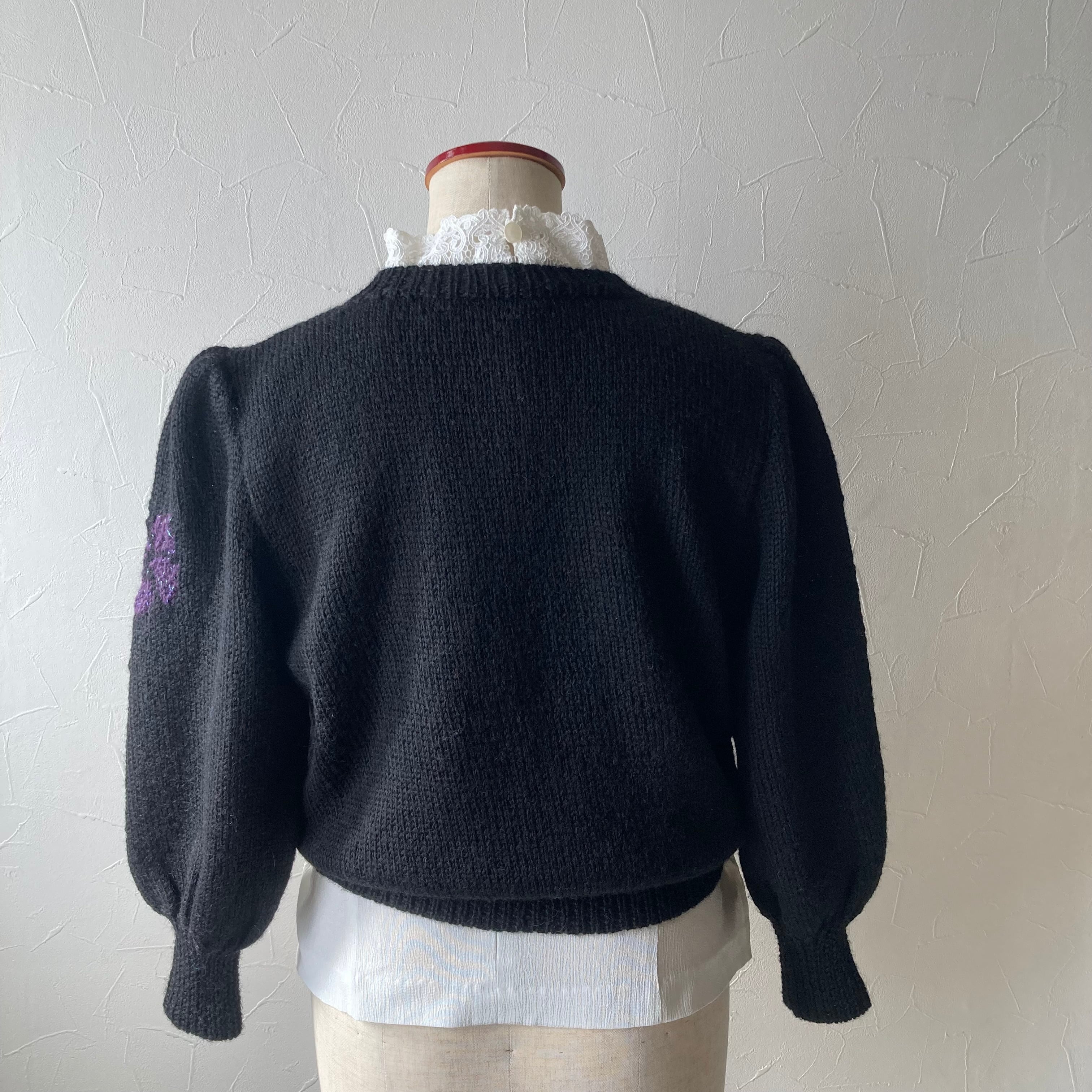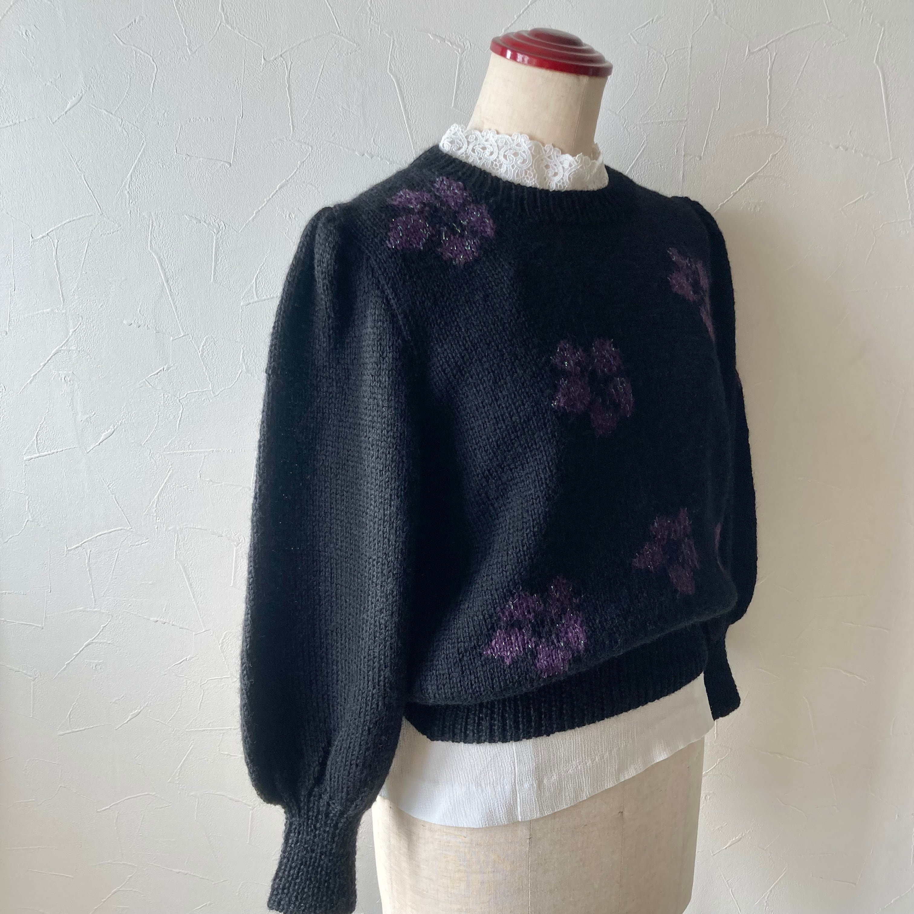 黒に紫の花柄が魅力的なパフスリーブニット◯紫の花には小さなブルーのラメがちらほらと入っています。大きなパフスリーブがレトロで可愛いシルエットになっています。