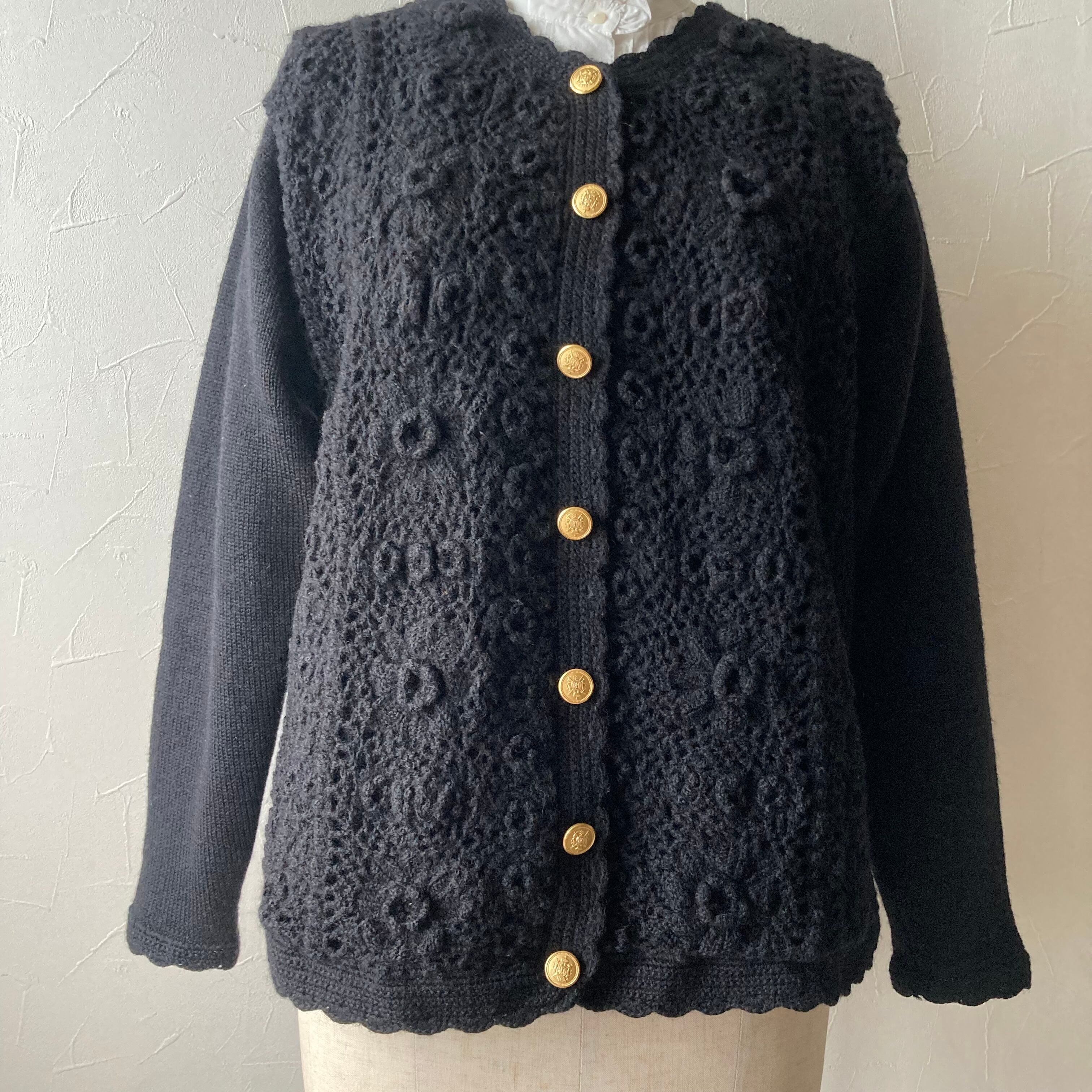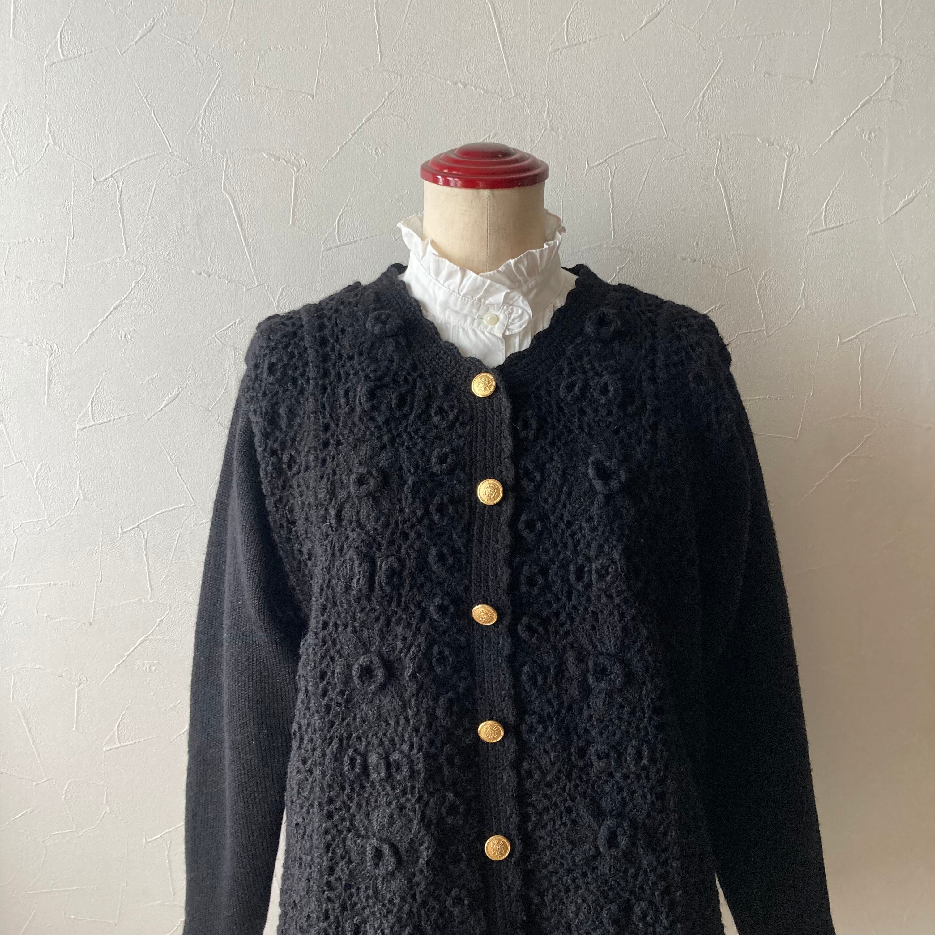モコっとしたお花のモチーフのニットカーディガン◯ ゴールドボタンがレトロでハンドメイドの温かみのある一着です。