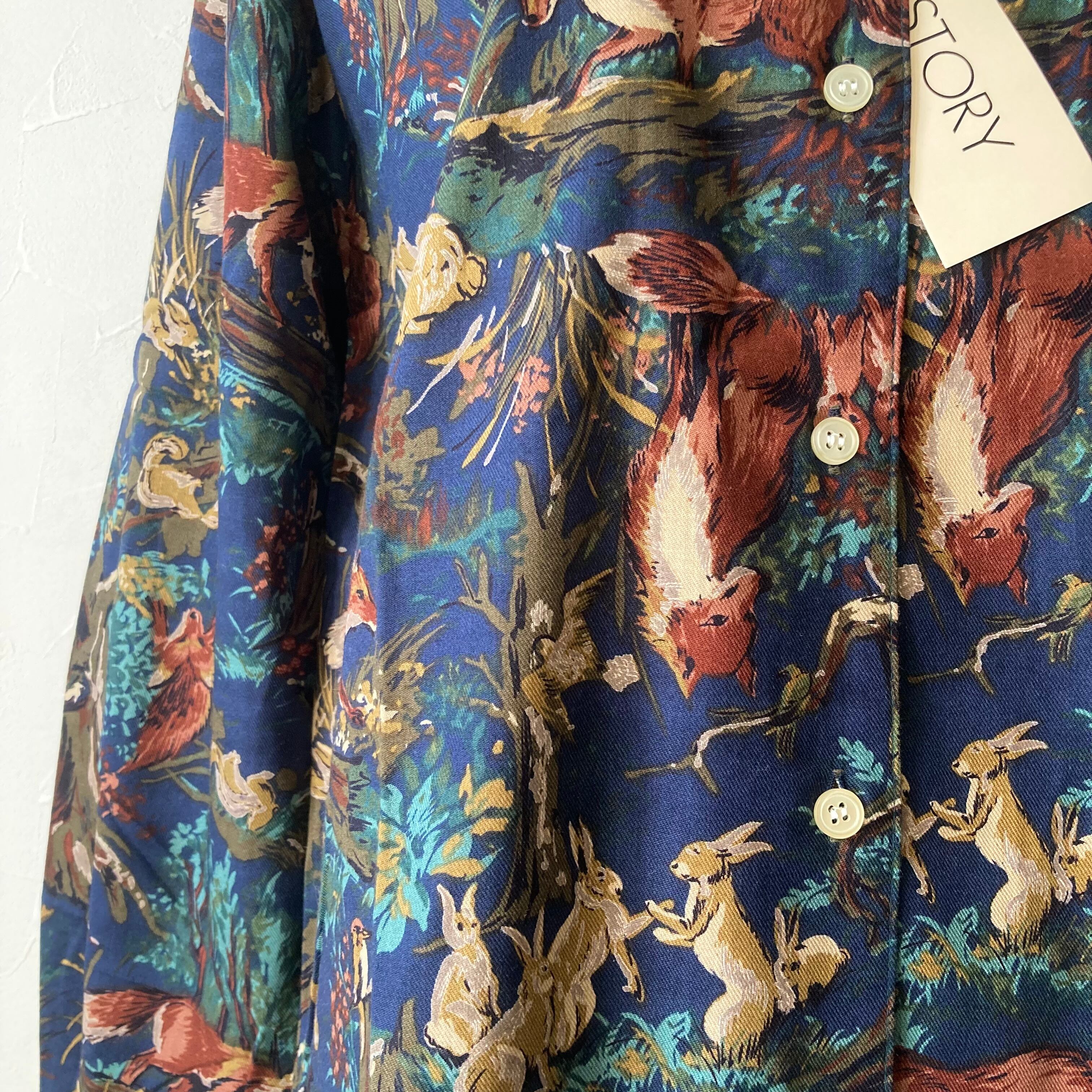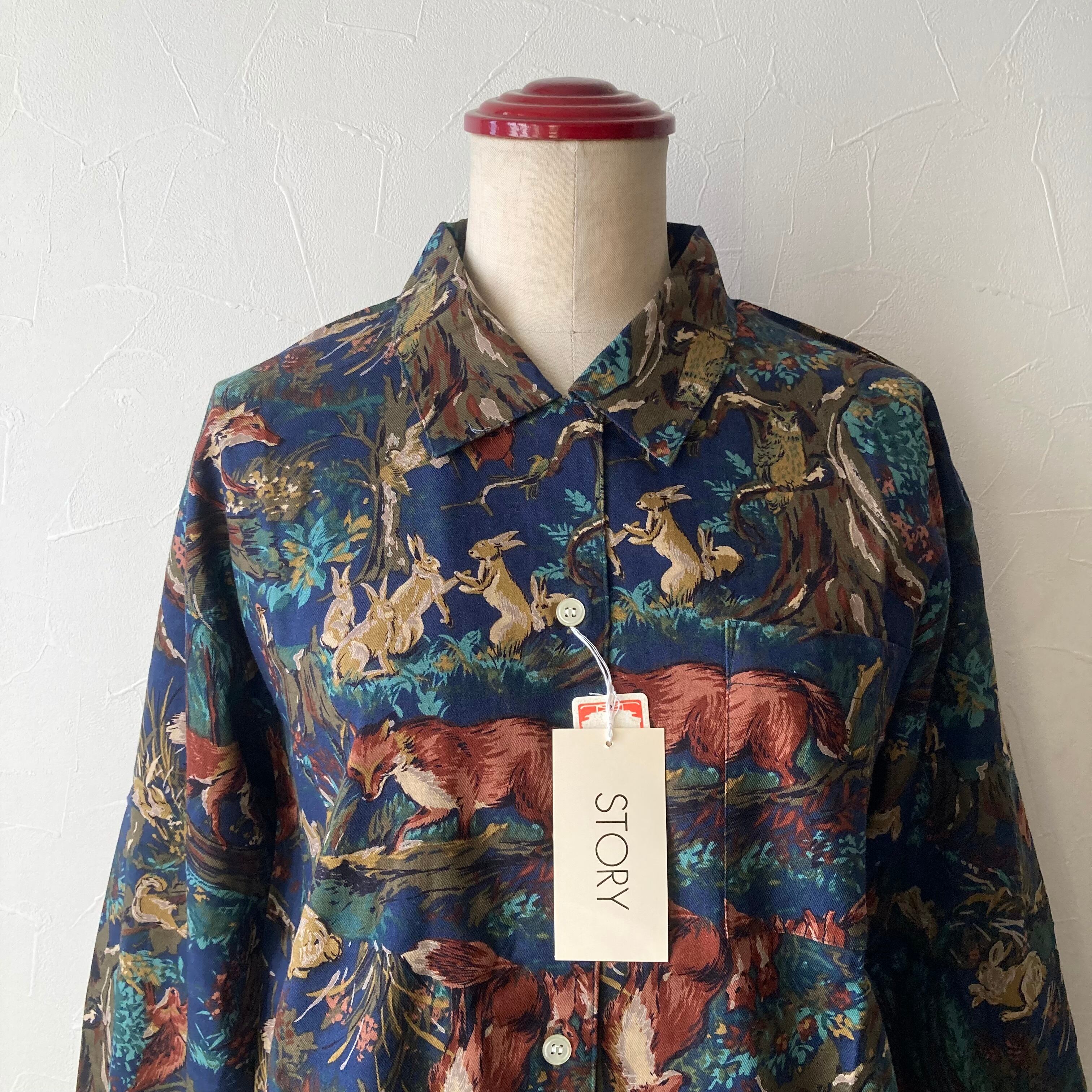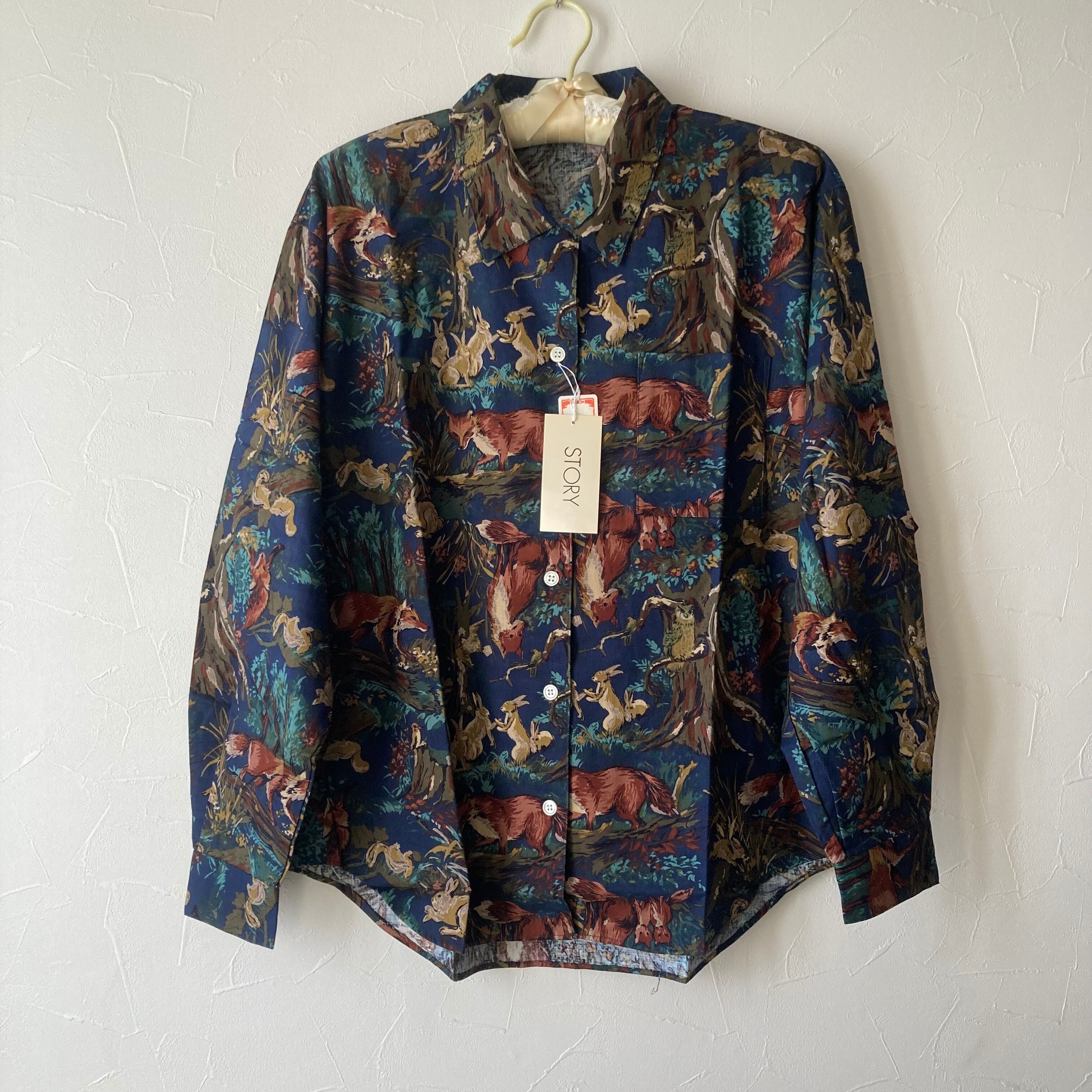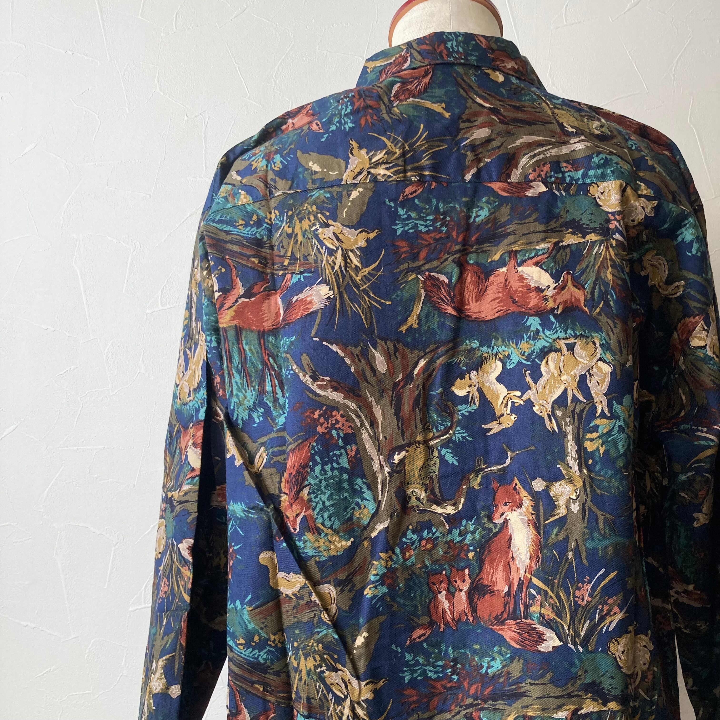 森の中に動物たちのストーリーを感じるようなほっこりしたコットンブラウス◯ ネイビーで夜の森の中のような神秘的な雰囲気もあって、古着ならではの素敵な一着です。