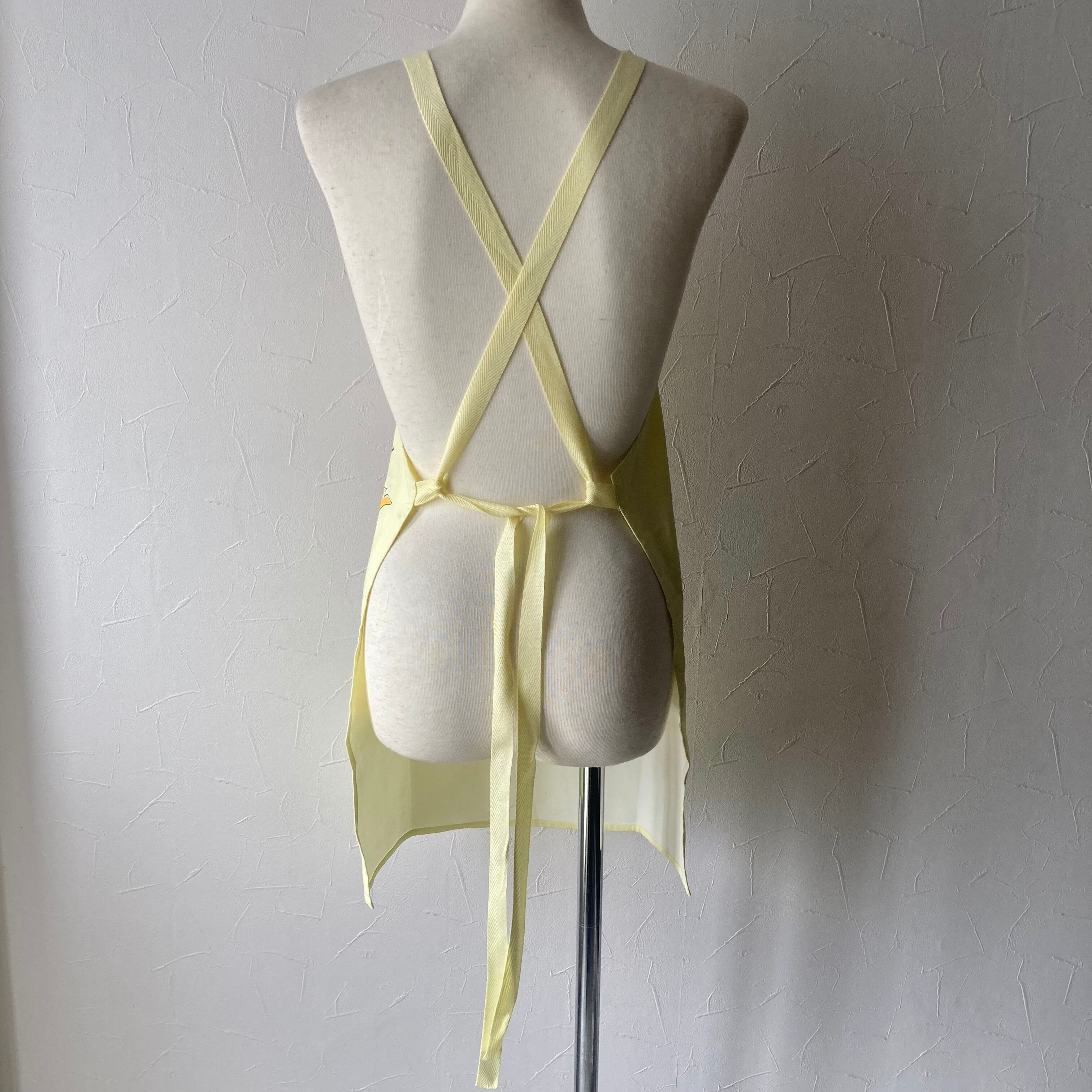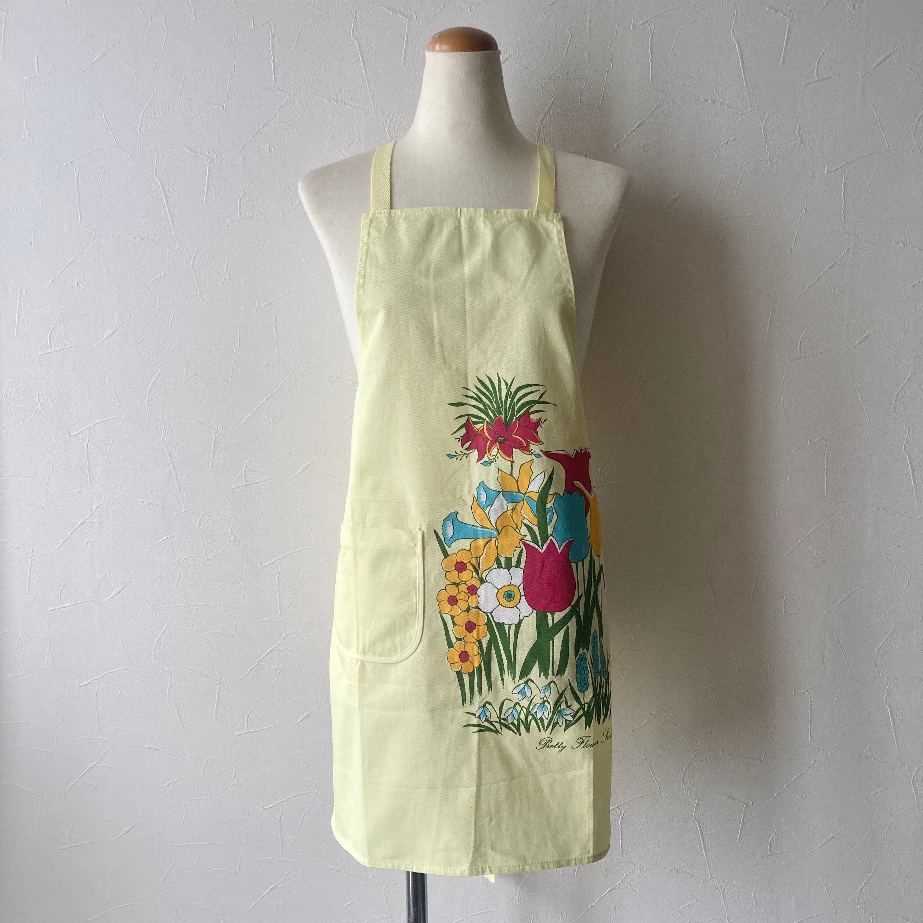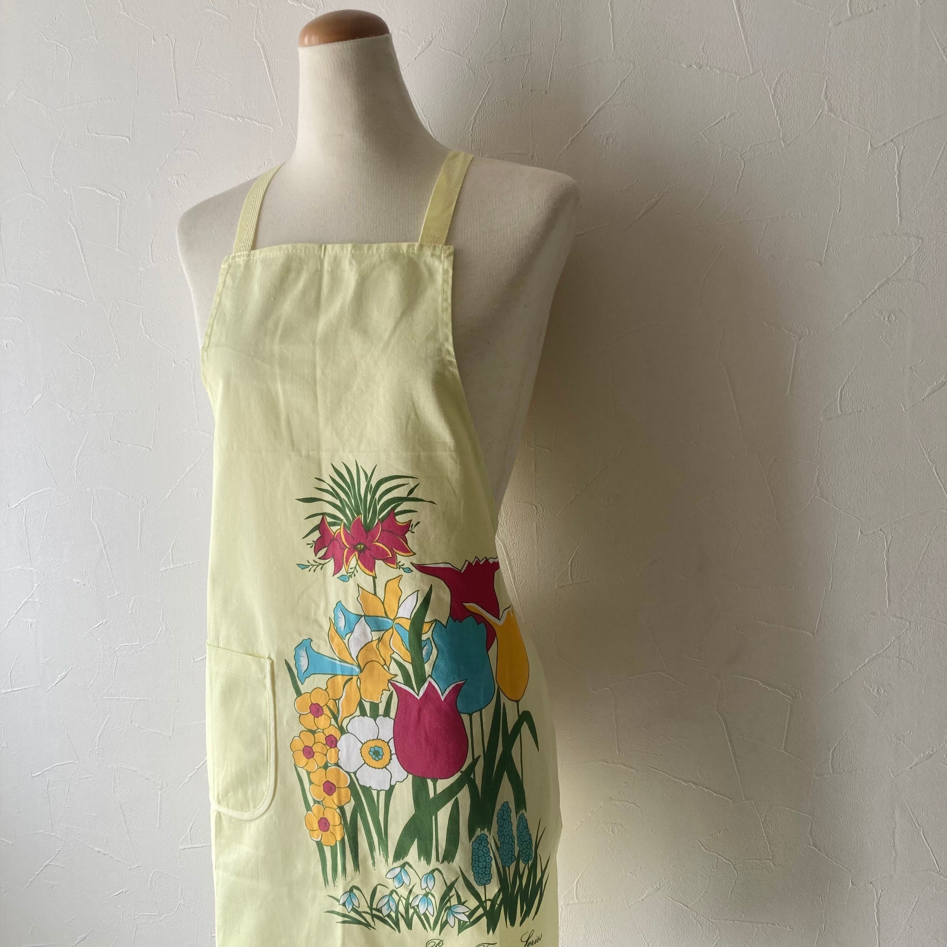 淡い黄色にレトロな花柄がプリントされたエプロン◯