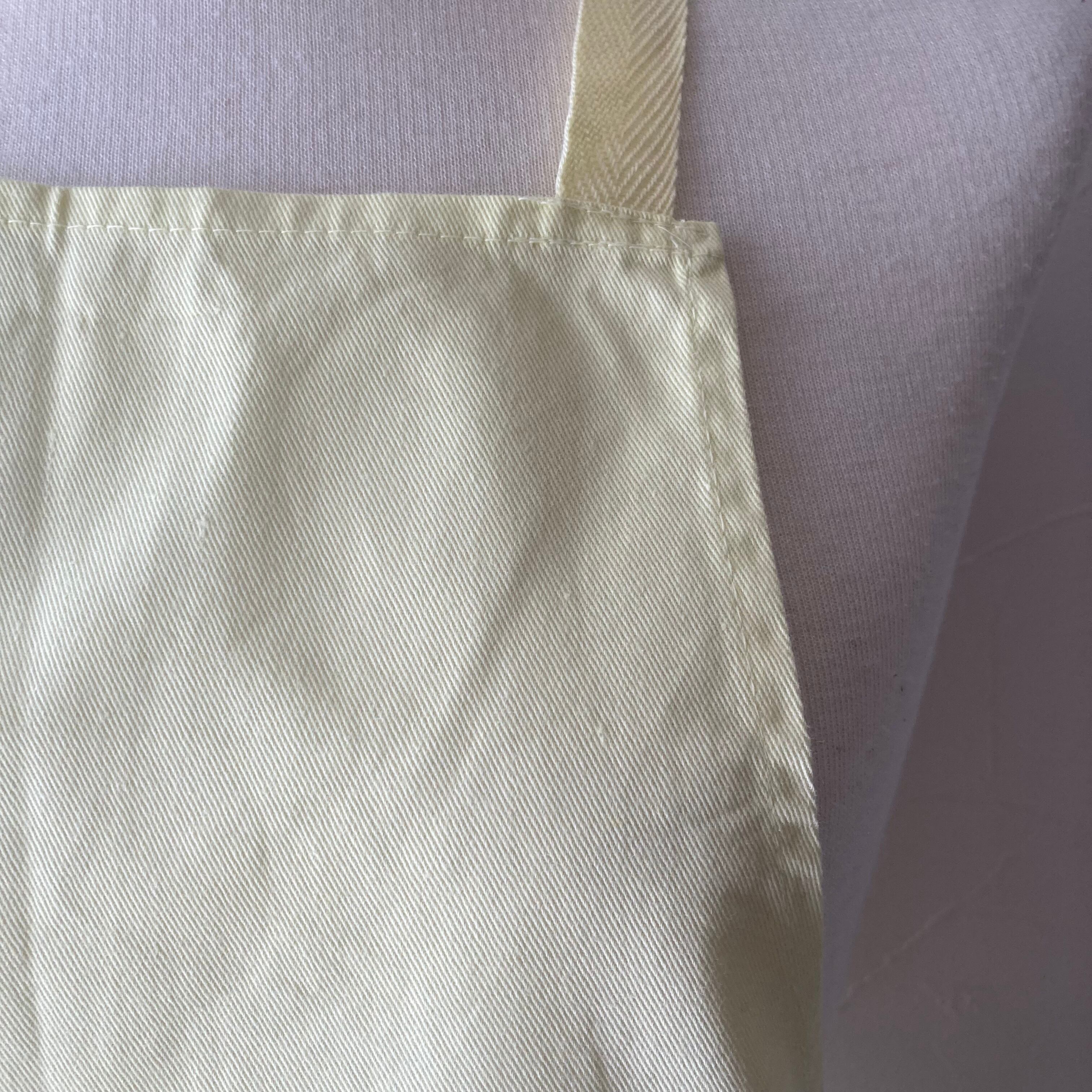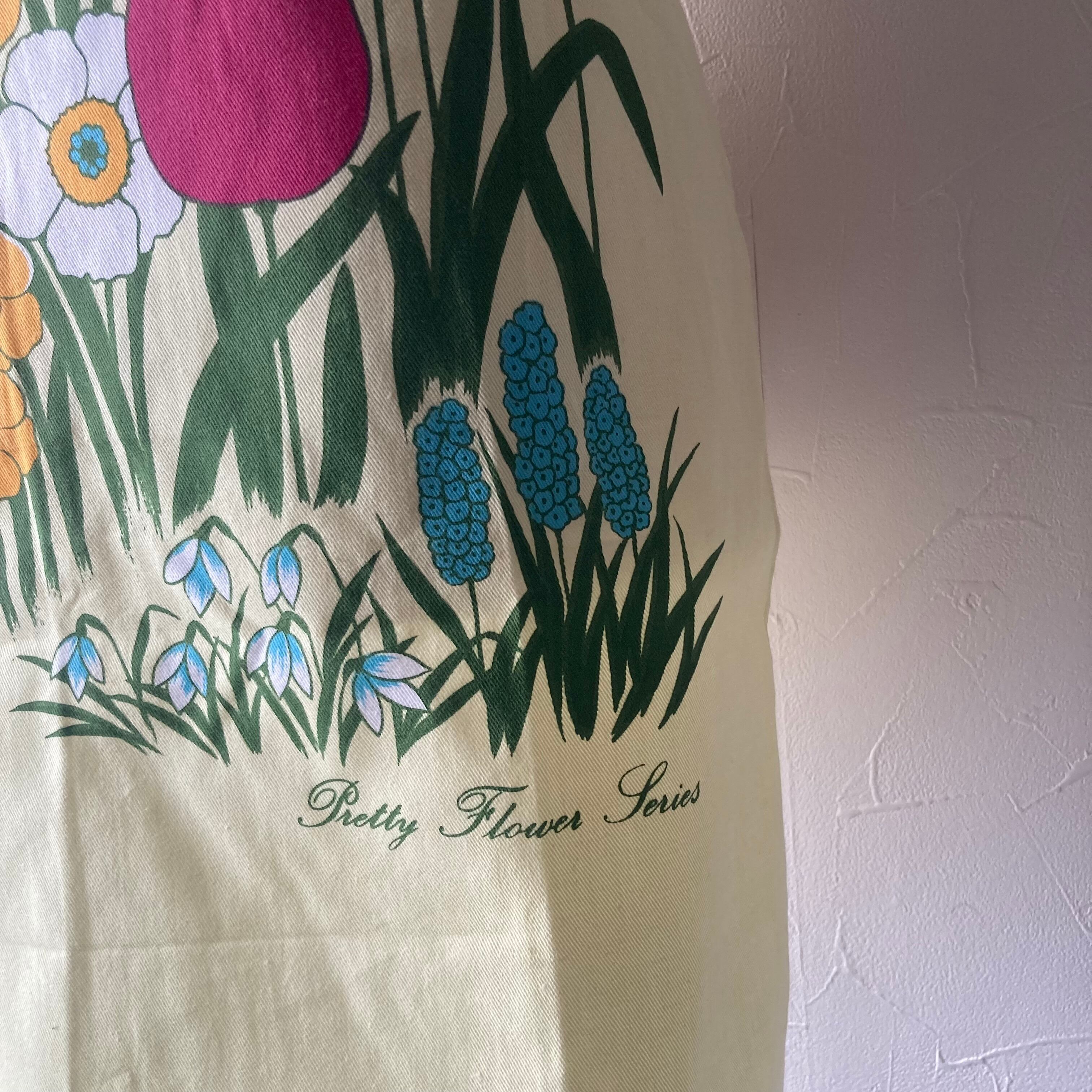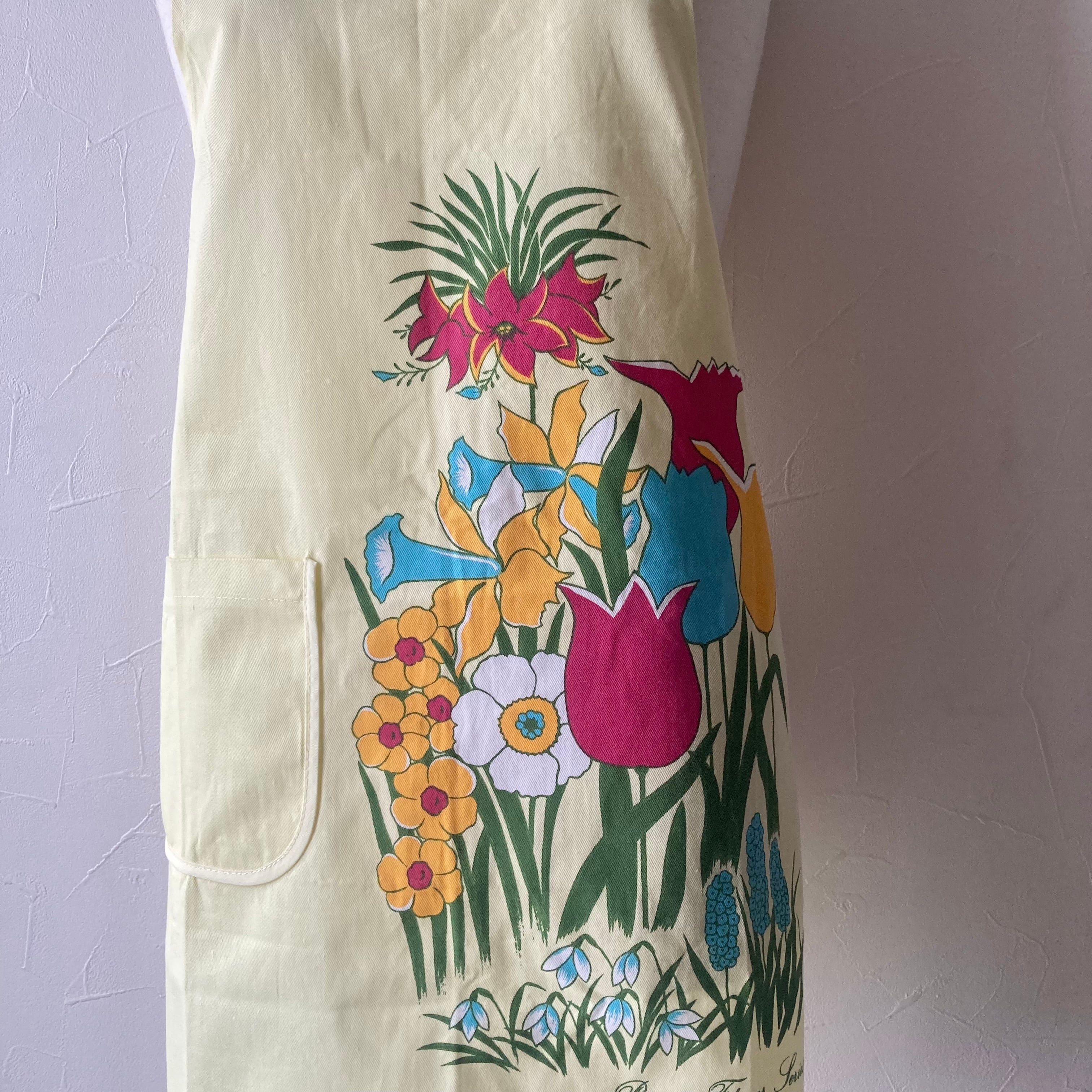 淡い黄色にレトロな花柄がプリントされたエプロン◯
