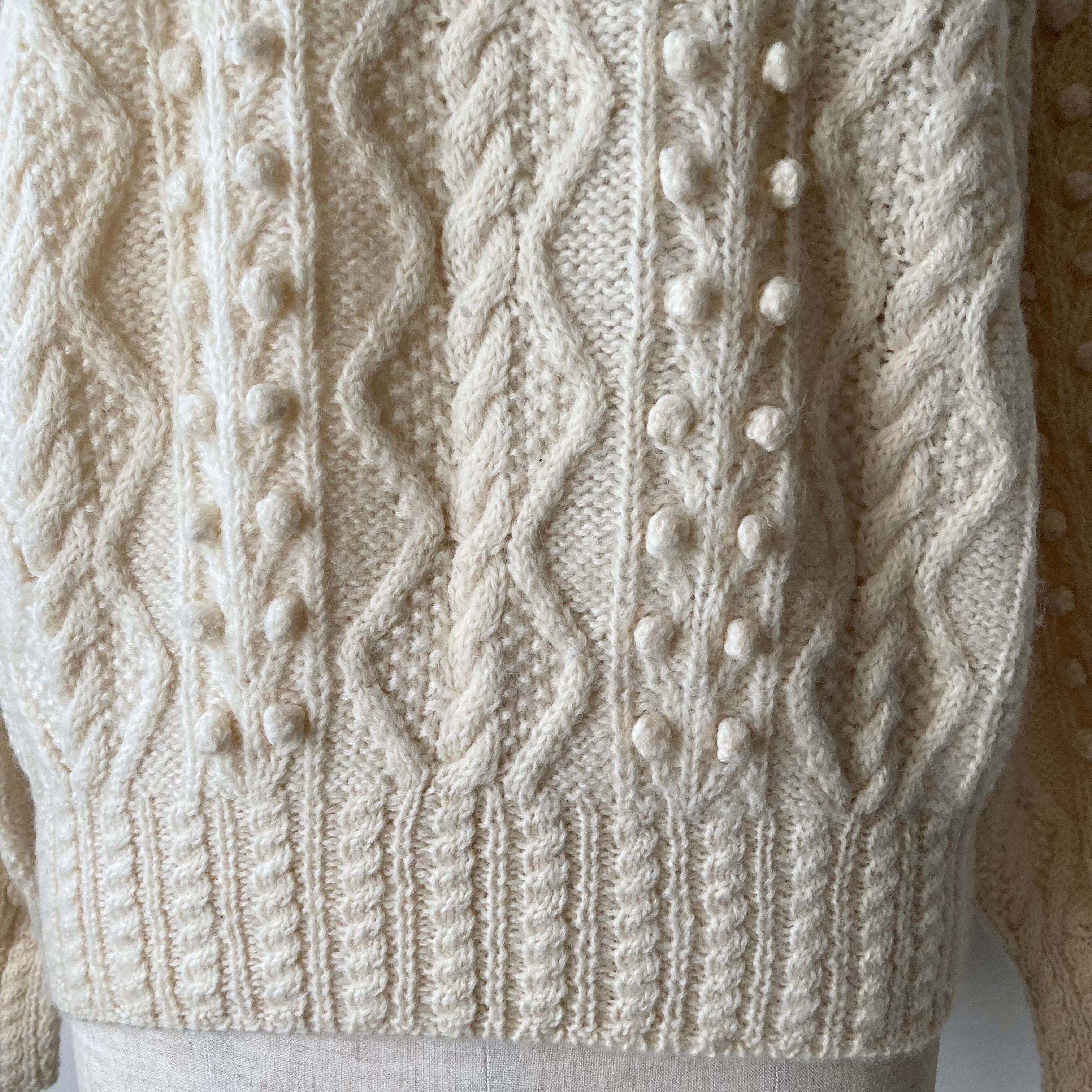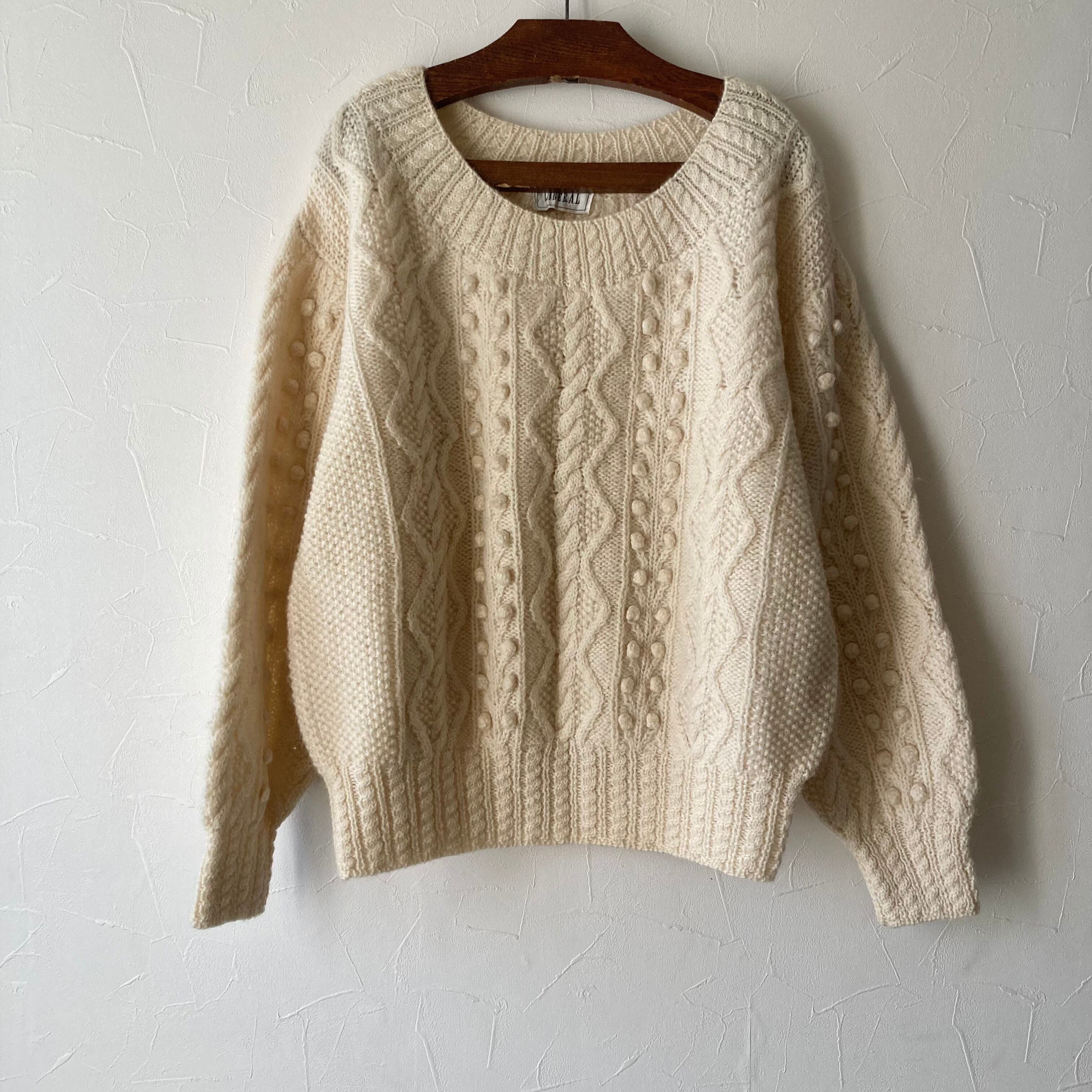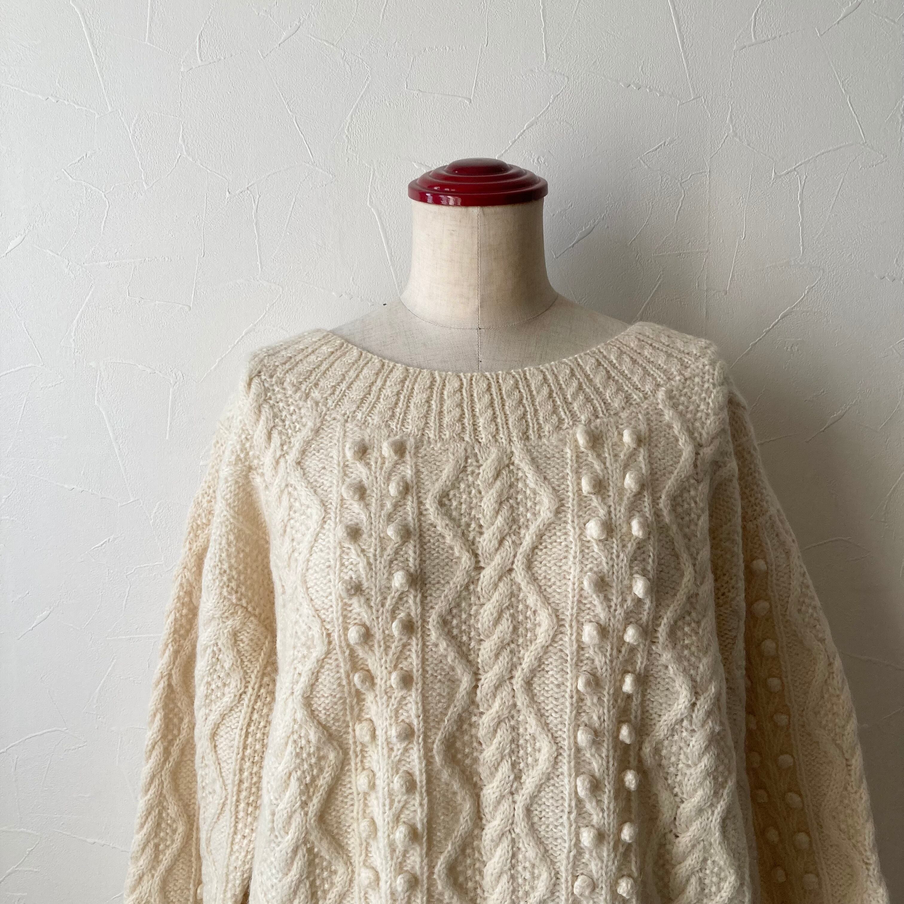 ボンボンとギザギザギザとケーブルのデザインが可愛らしいニットです。