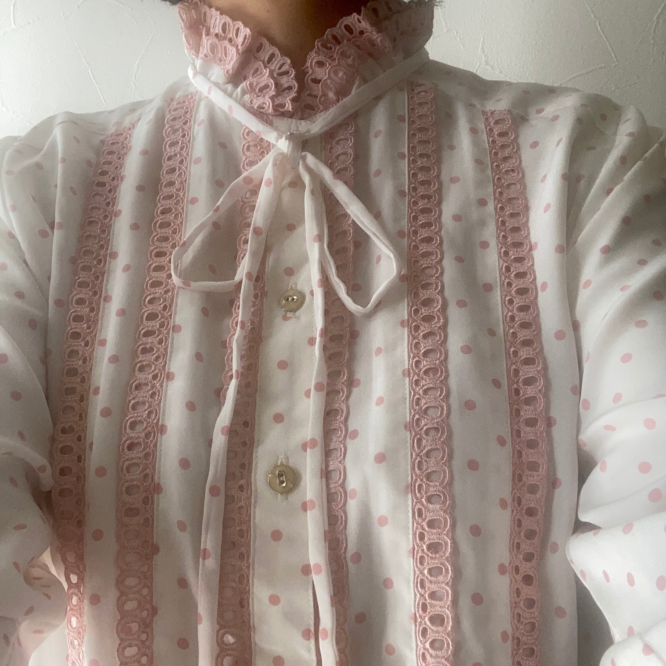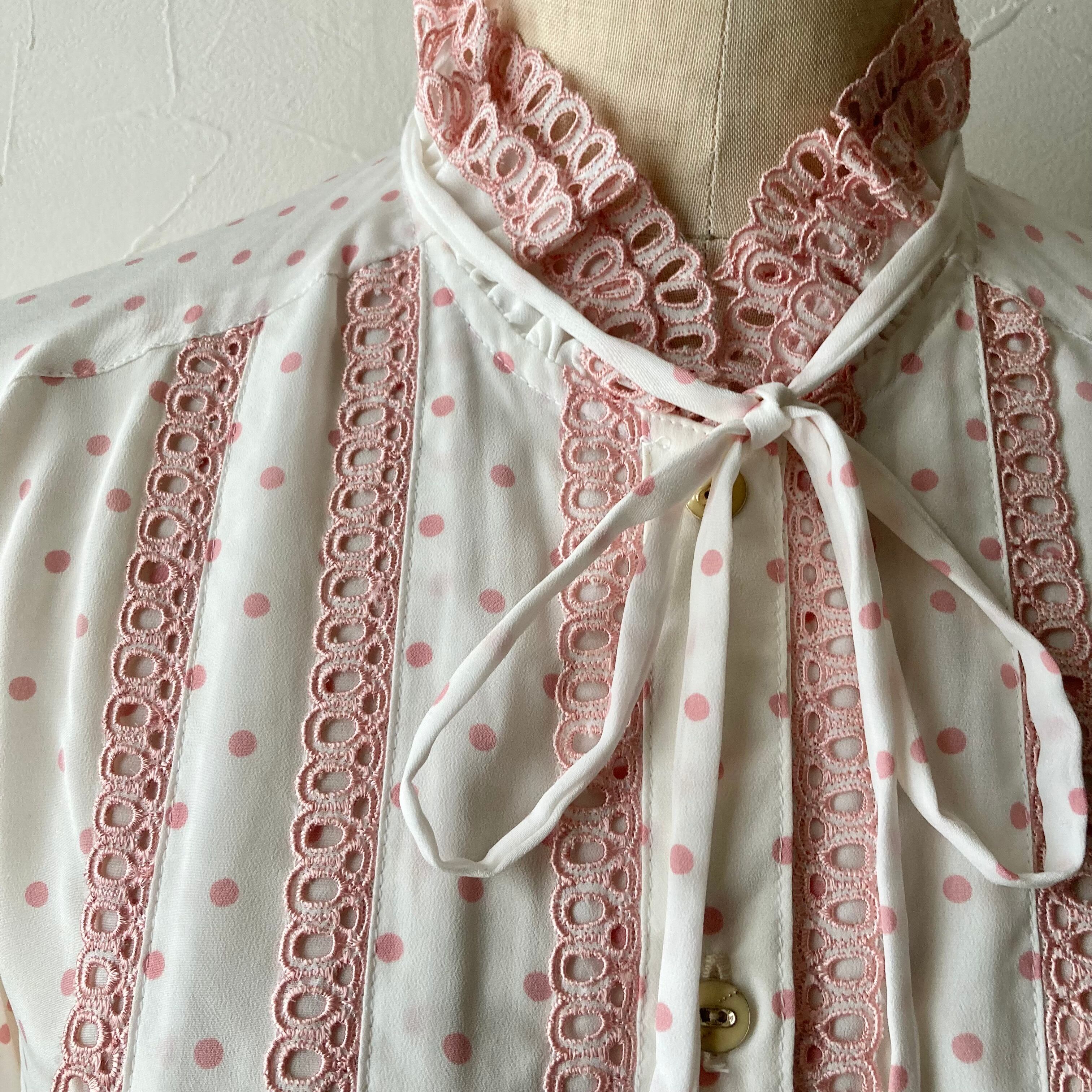 ピンクのドットとピンクのレースが可愛らしいレトロなリボンブラウス◯