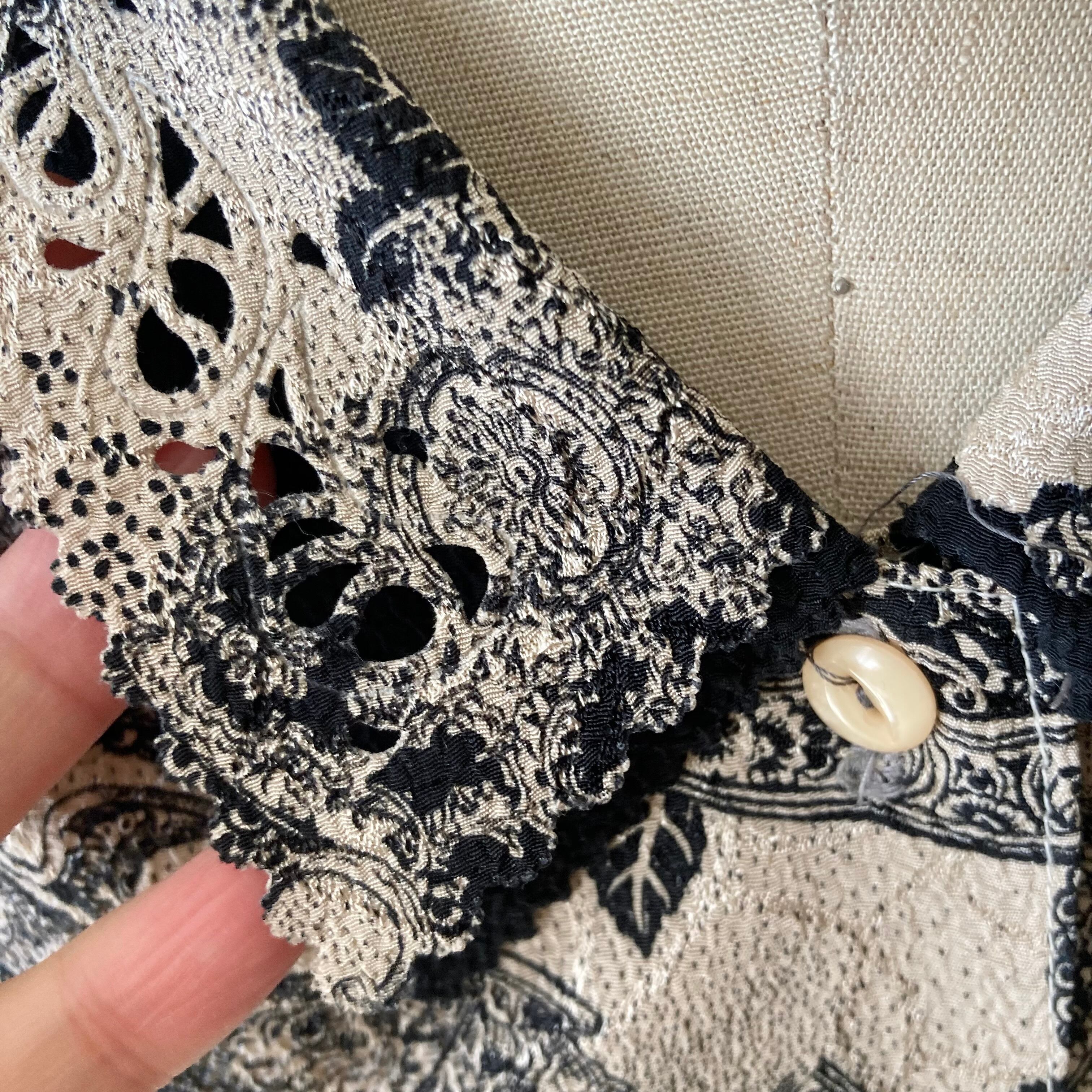 モノトーンなヨーロッパ調の柄が素敵な七分袖のブラウスです。襟は二重で黒色がアクセントに。よく見るとスカラップ、カットワークデザイン。モノトーンコーデも素敵ですし、赤などヴィヴィッドな色との組み合わせも可愛いと思います。