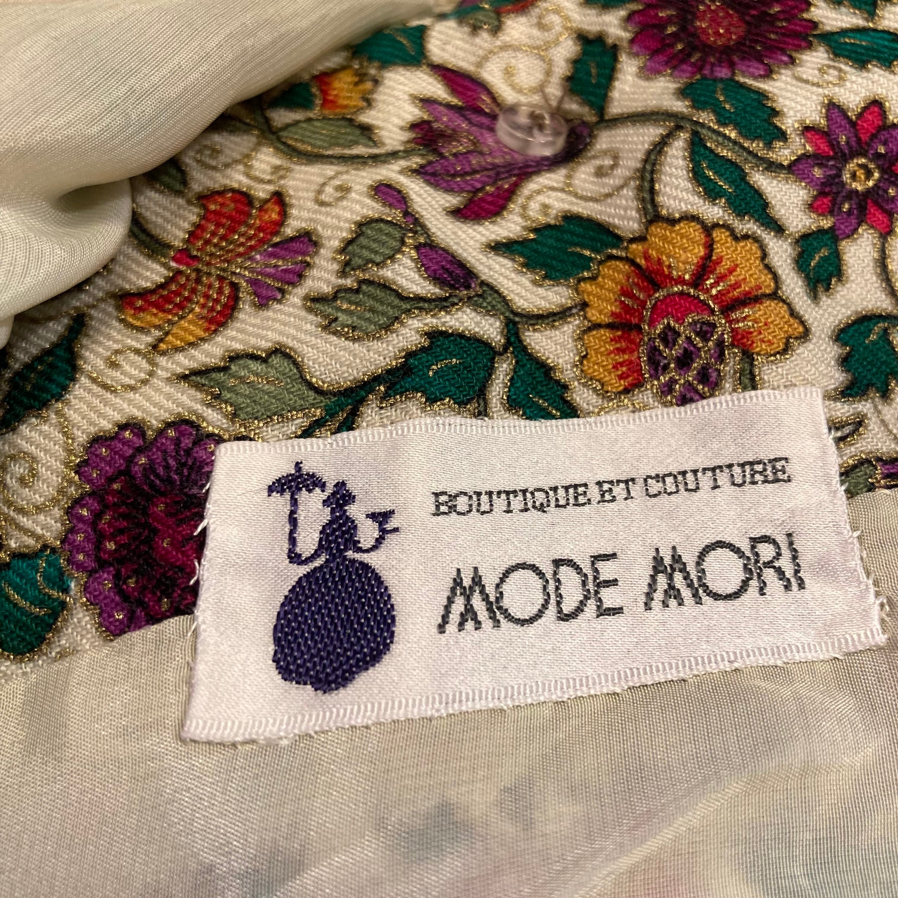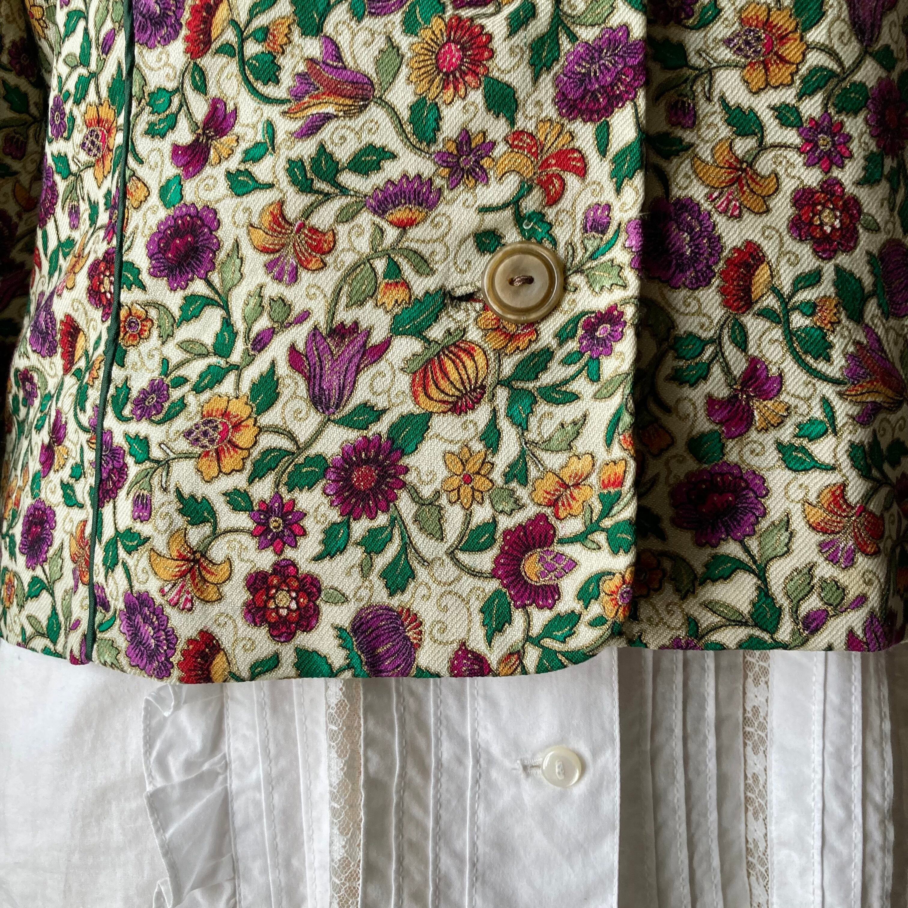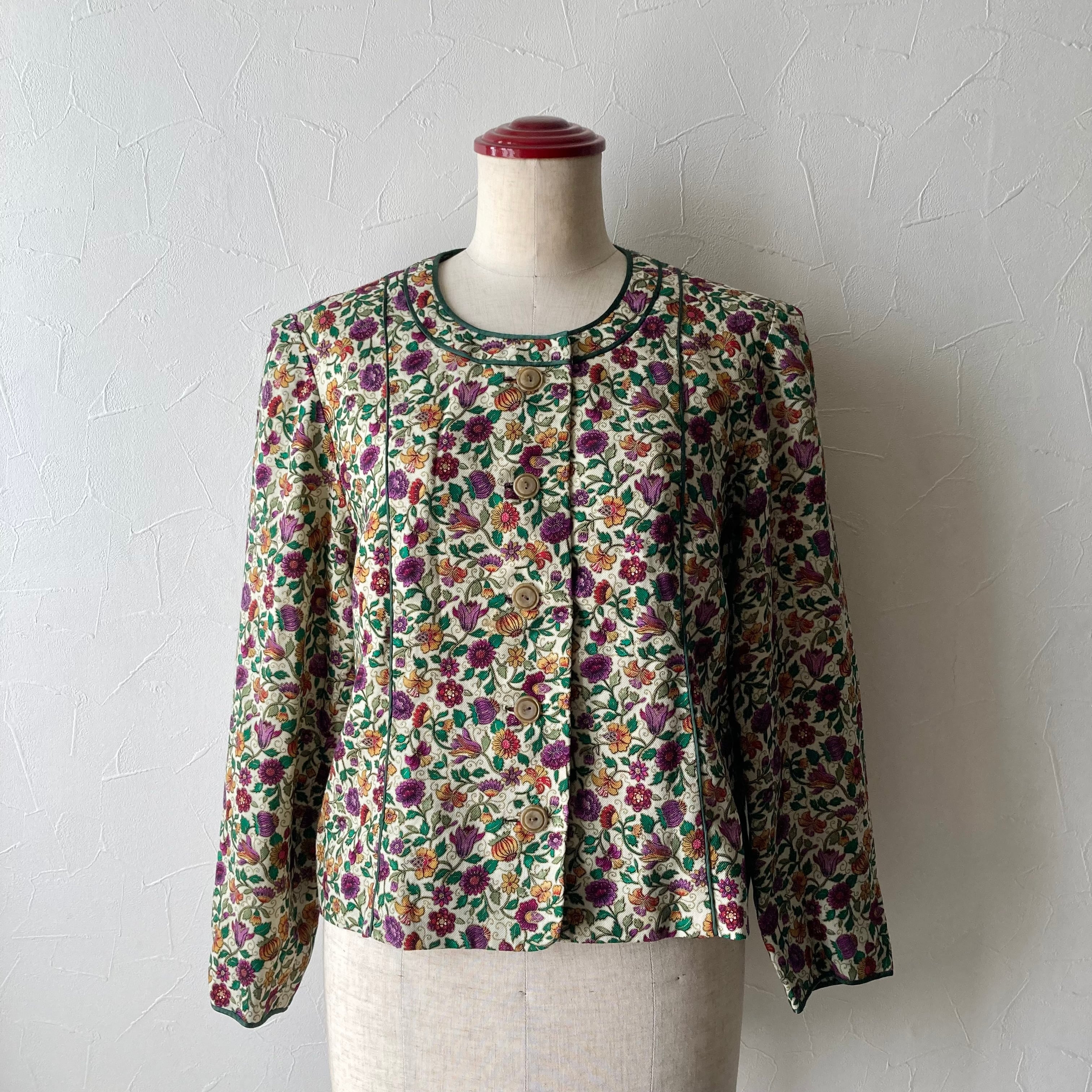 オリエンタルな花柄模様が素敵な薄手のジャケット◯ ノーカラーで襟を出したり雰囲気を変えて楽しめます。色合いも素敵なレトロな一着です。