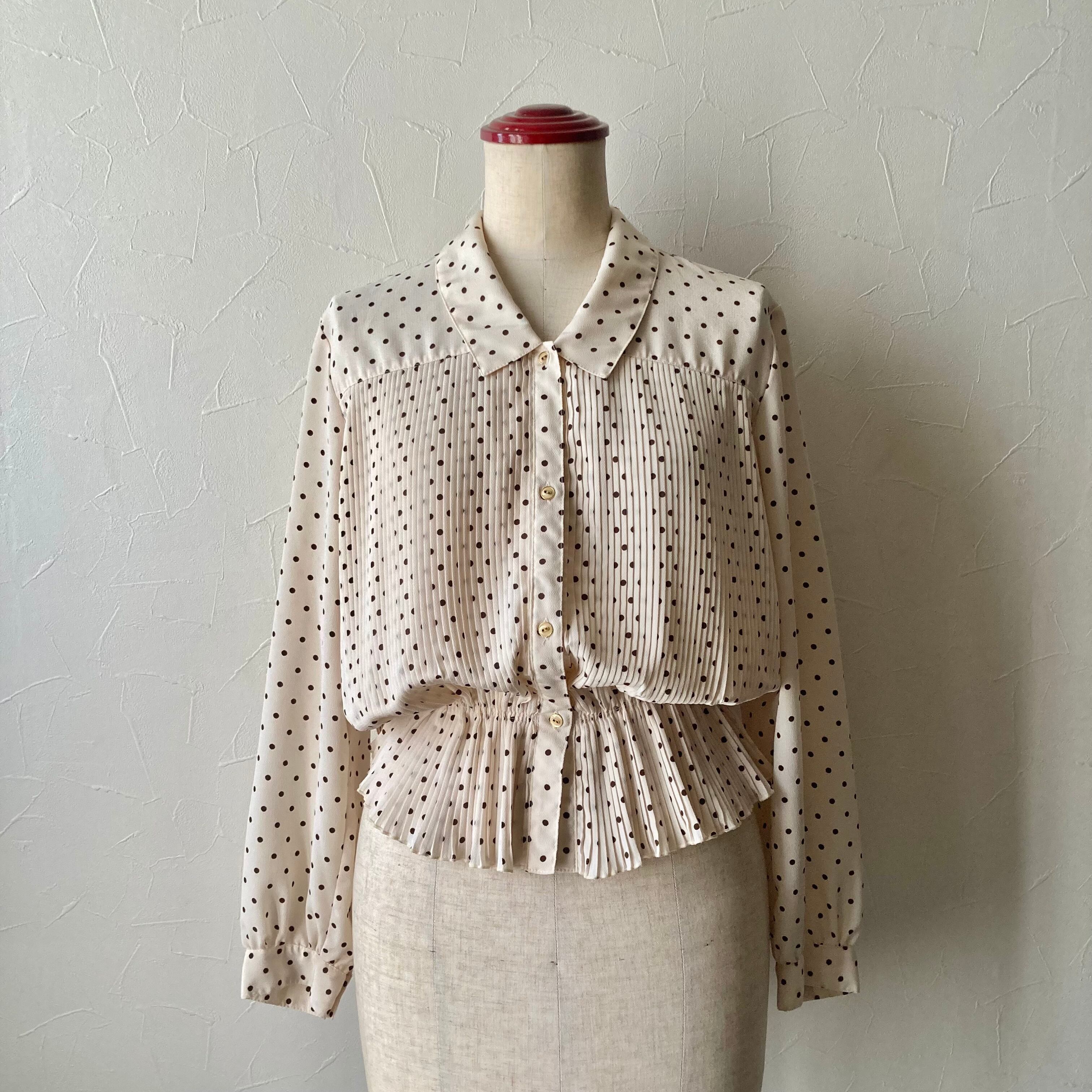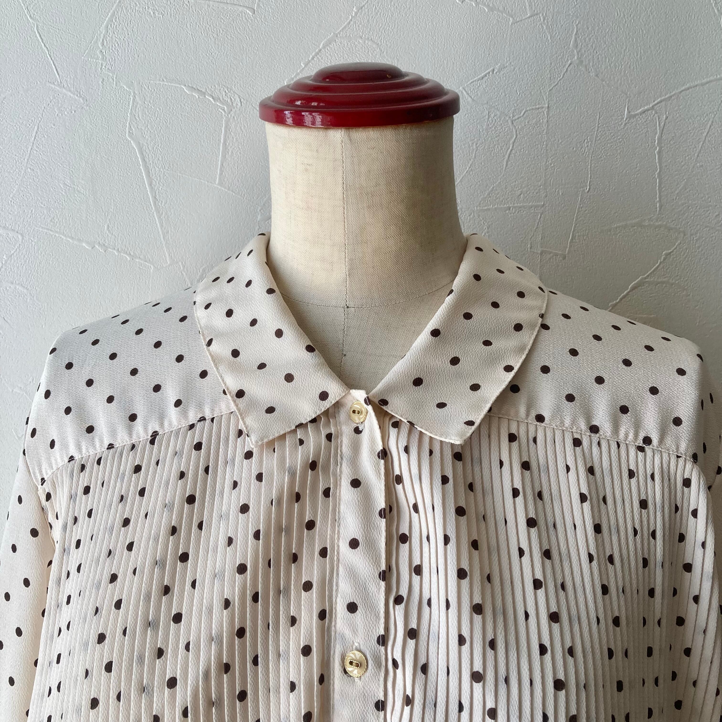 ブラウンのドット柄にプリーツデザインがステキなレトロなブラウス◯