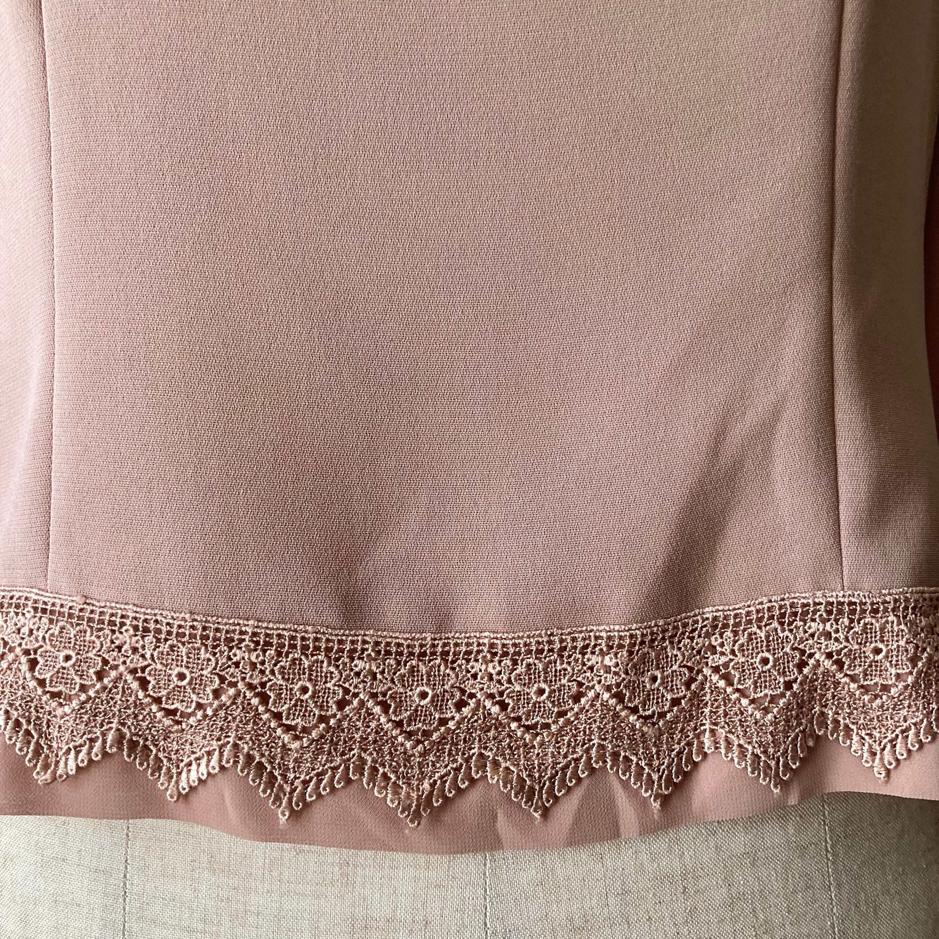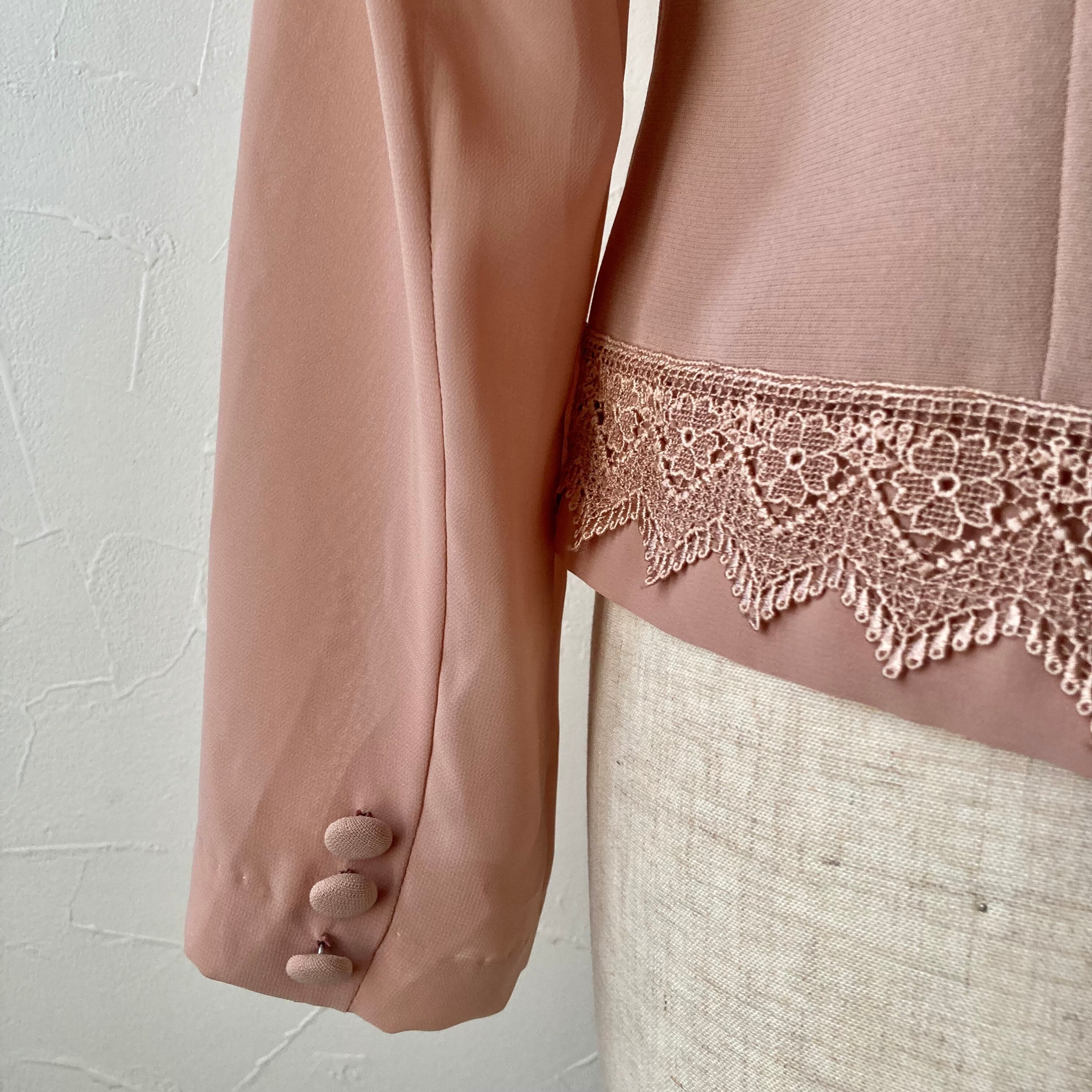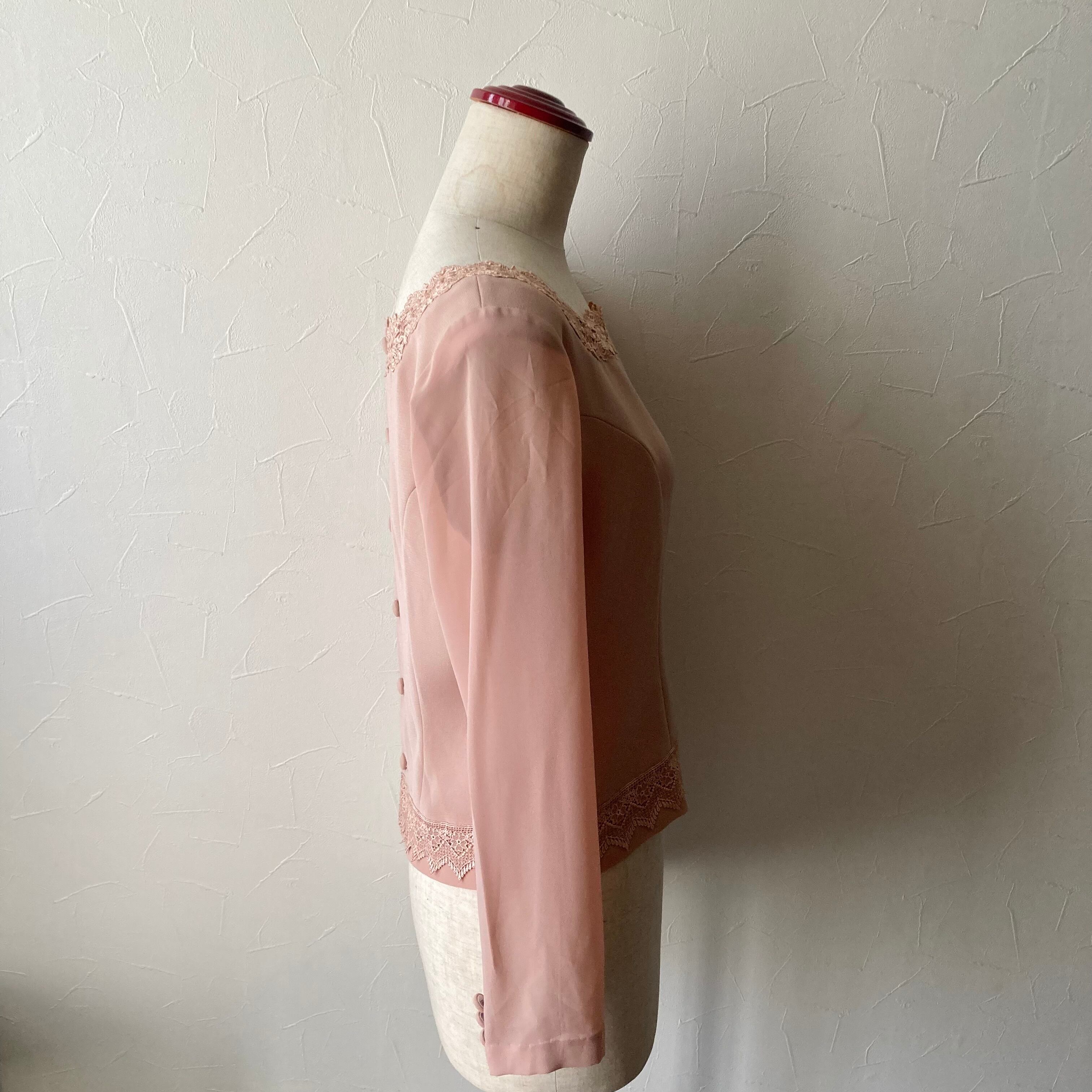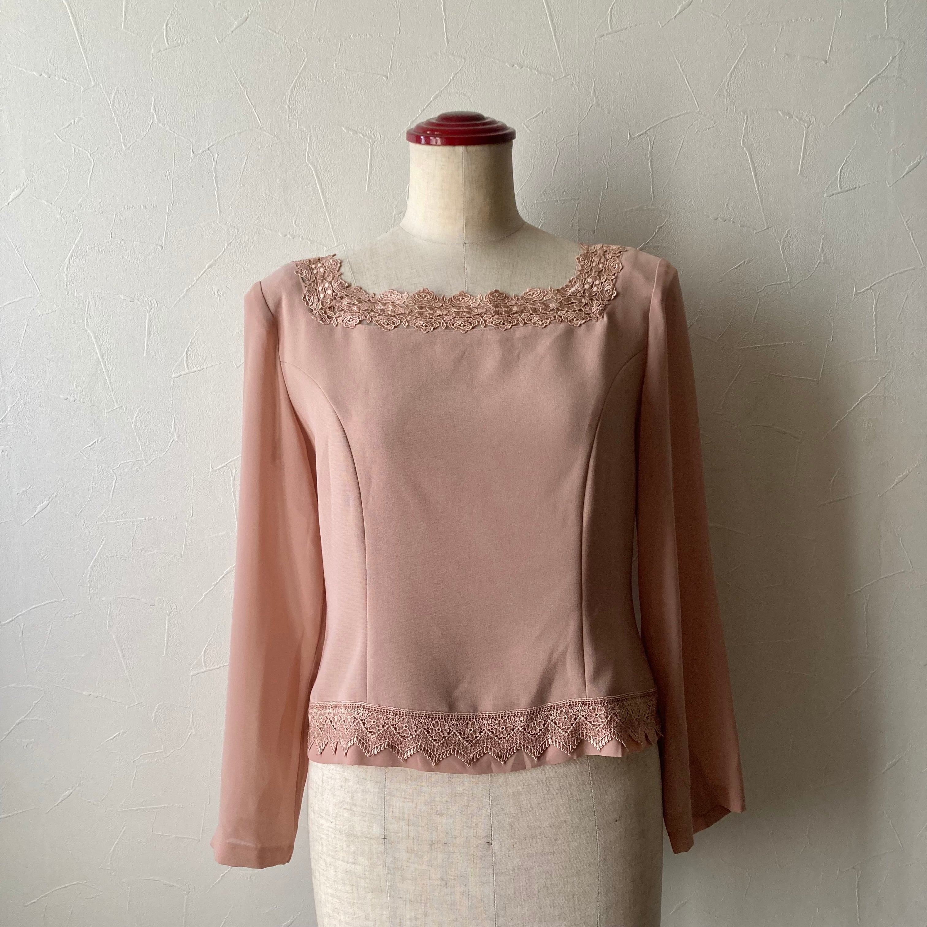 くすんだピンク色のレース装飾の後ろボタンのトップス◯ 袖は透け感がありお洒落なデザイン。スクエア型の首回りもすっきり綺麗なシルエット。形が綺麗なので肩パッドは付けたままにしてあります。古着ならではの色やこだわりのデザインがたまらない一着です。
