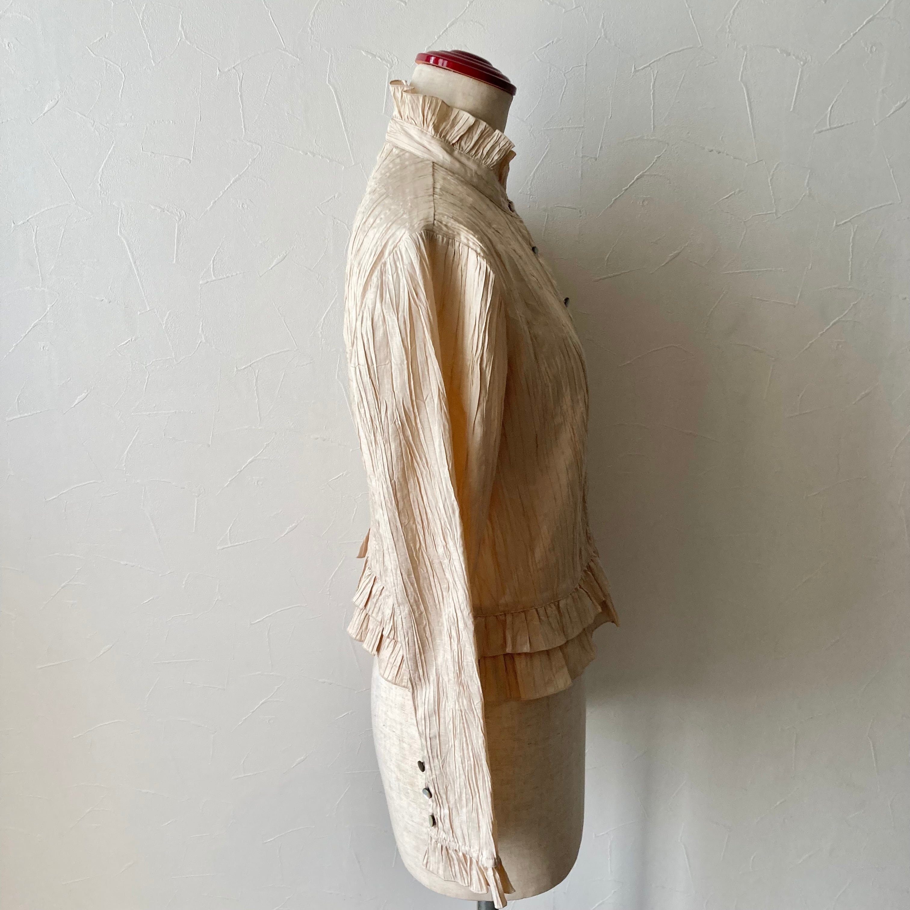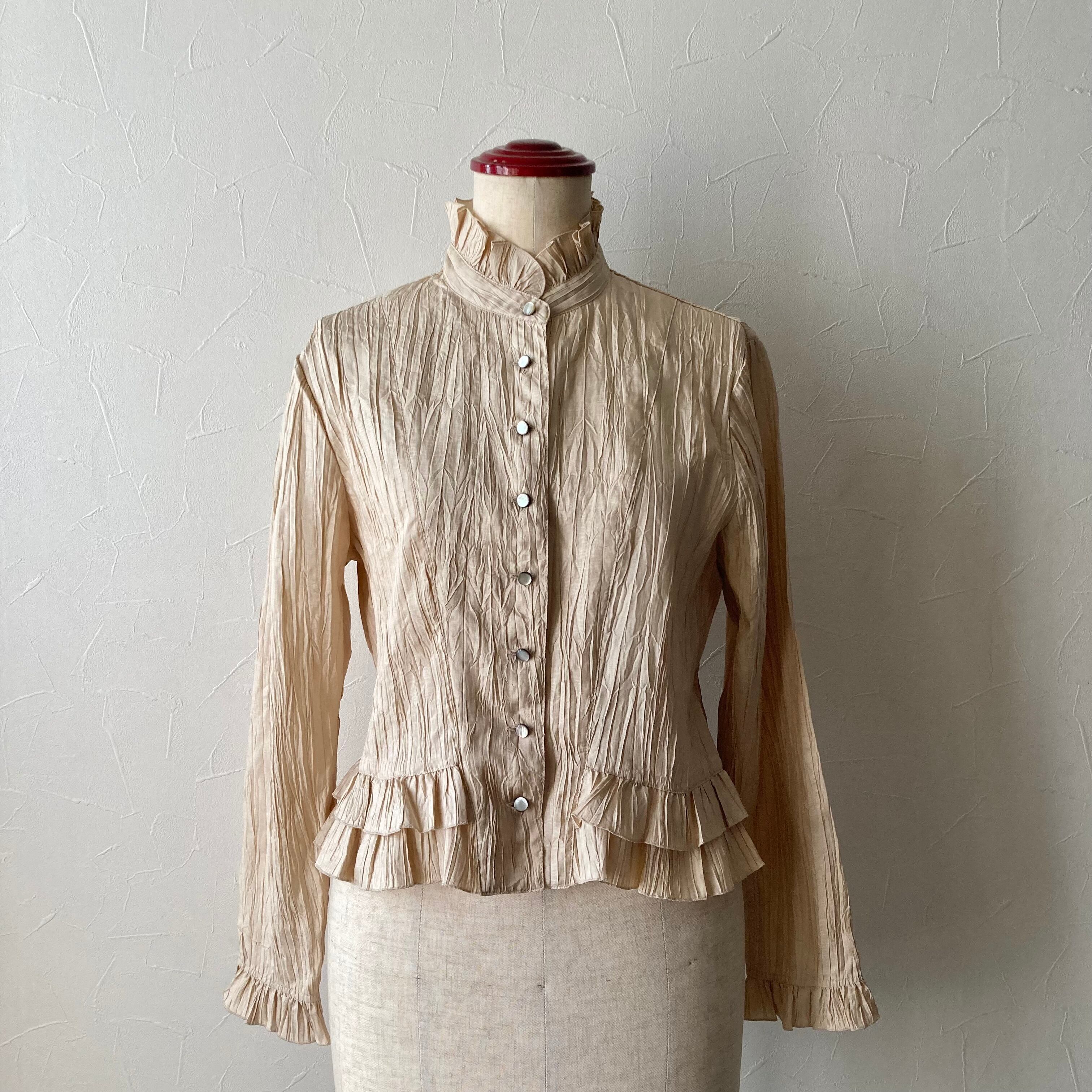 シワ加工された素材とフリルの組み合わせが大人可愛いレトロブラウスです。