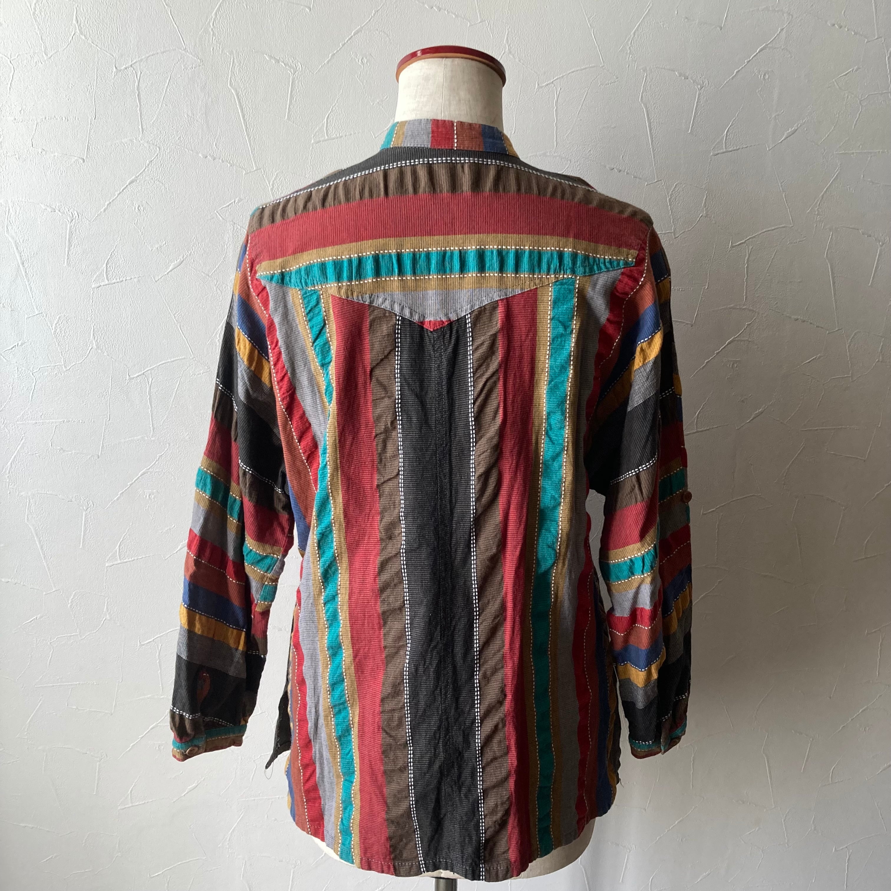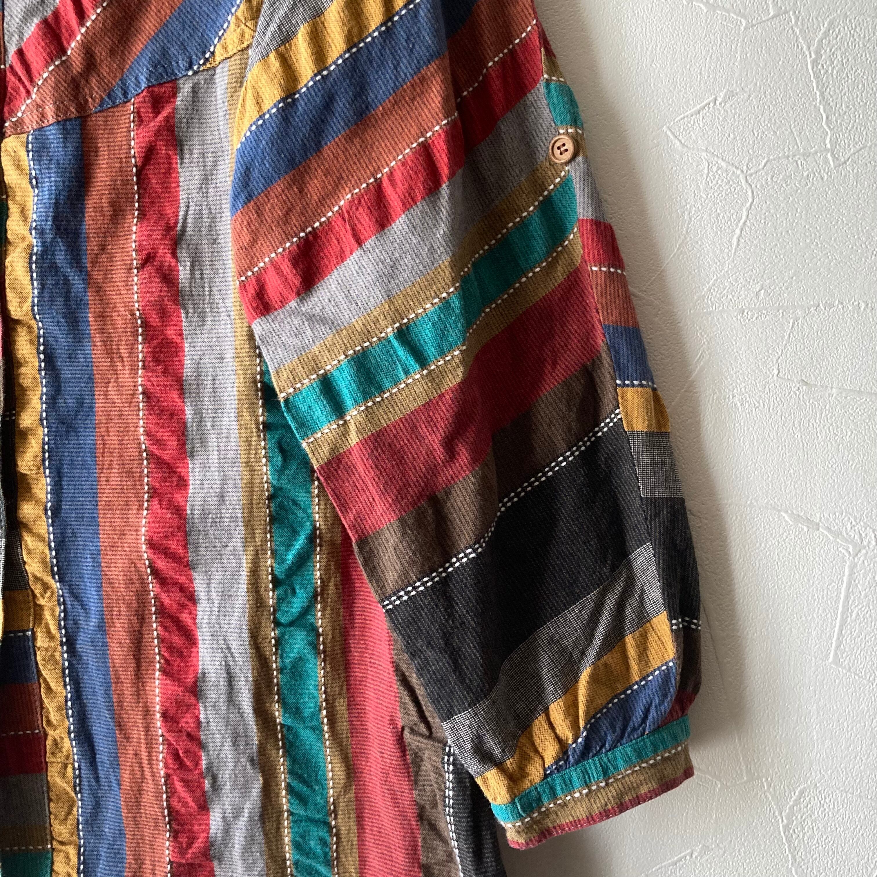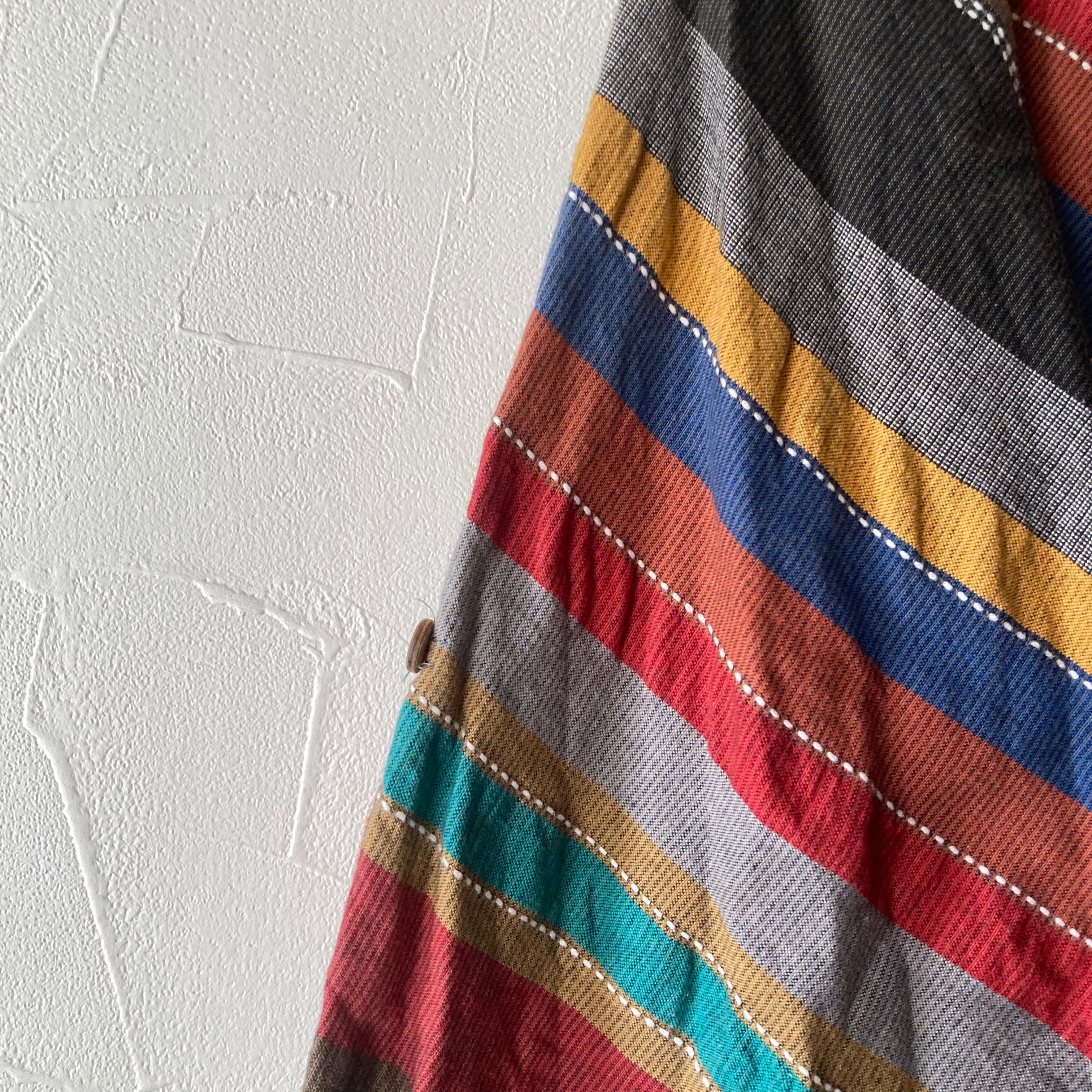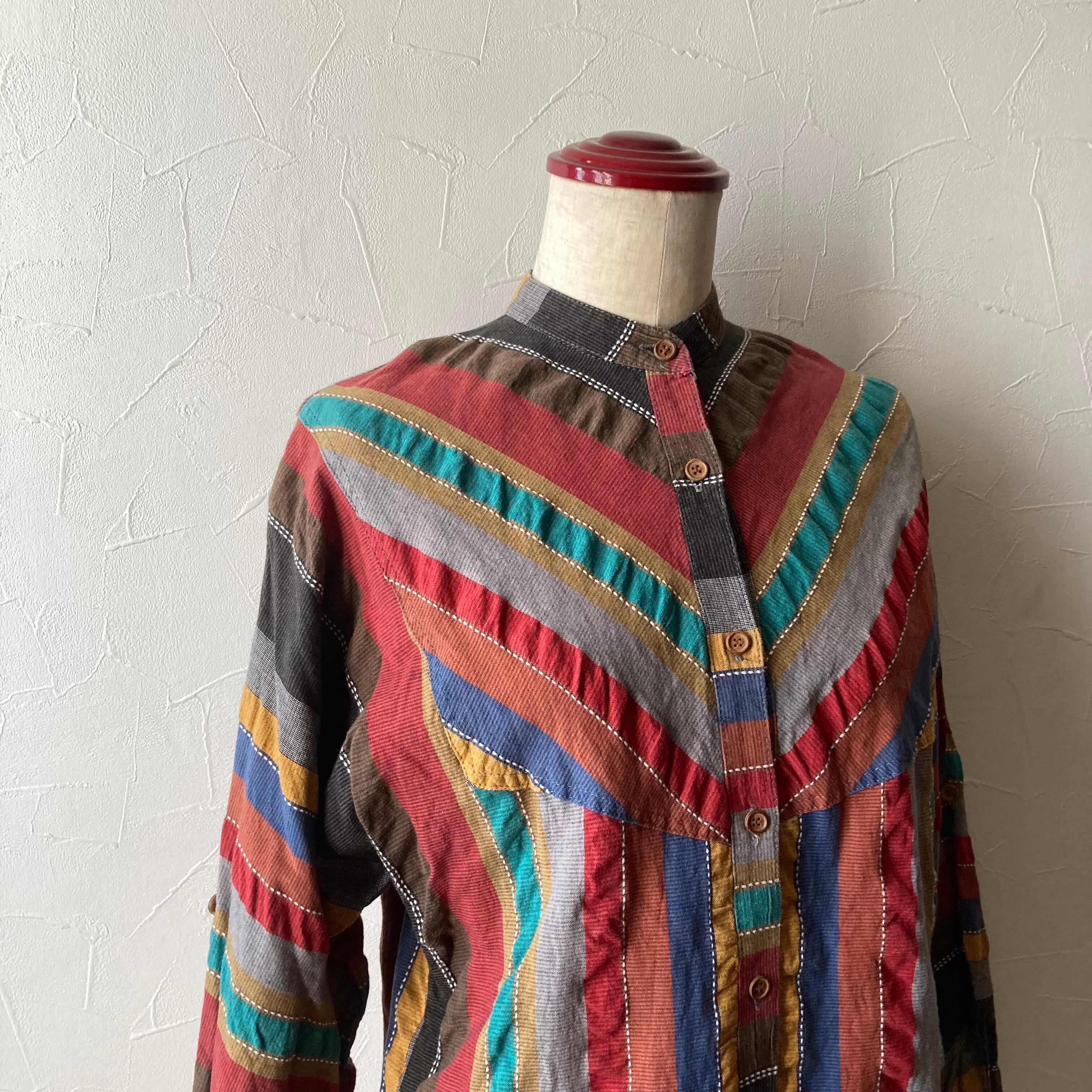 沢山の色を使ったラインがヴィンテージらしい雰囲気のコットンブラウス◯ ドルマンスリーブもレトロなシルエット。木のボタンも可愛いです。