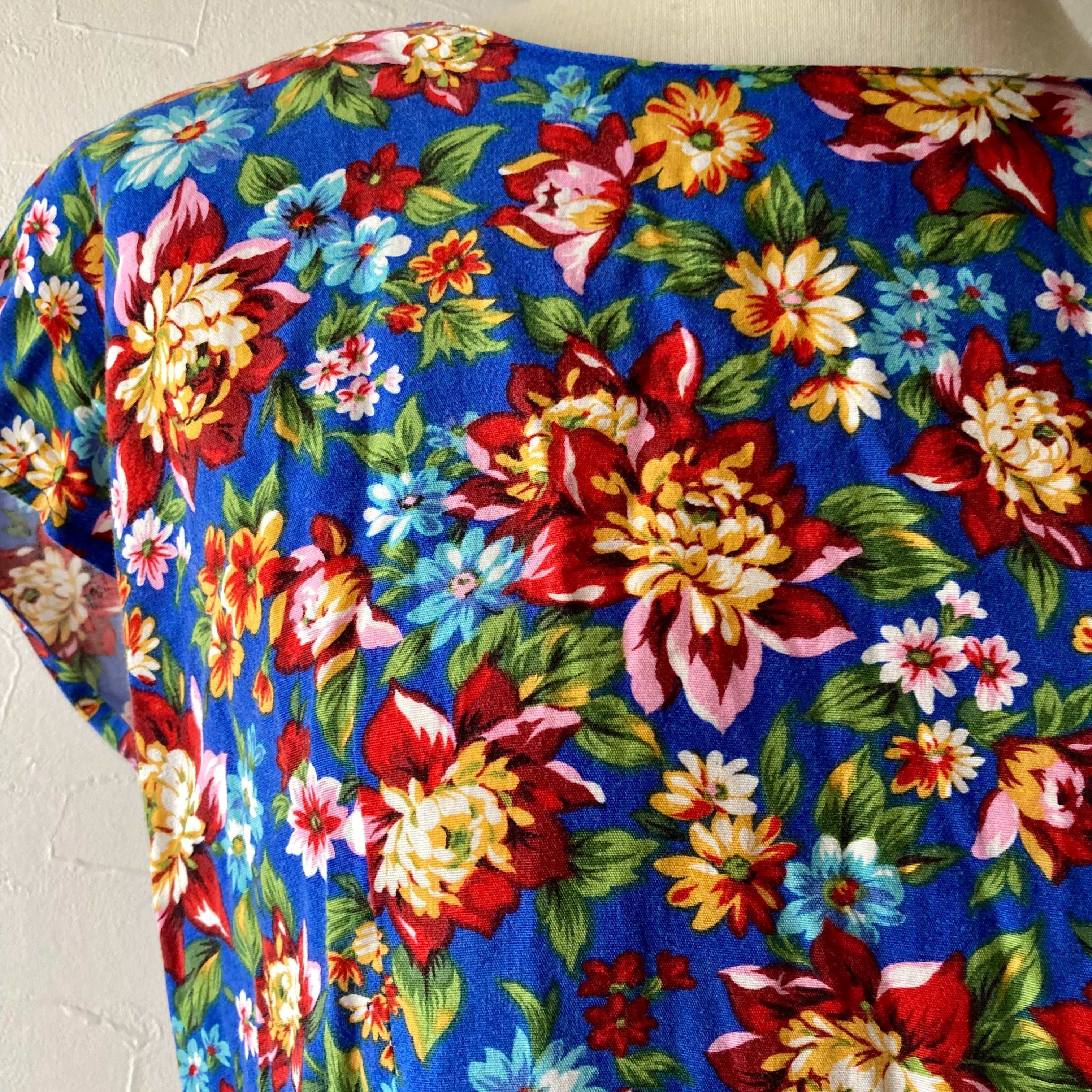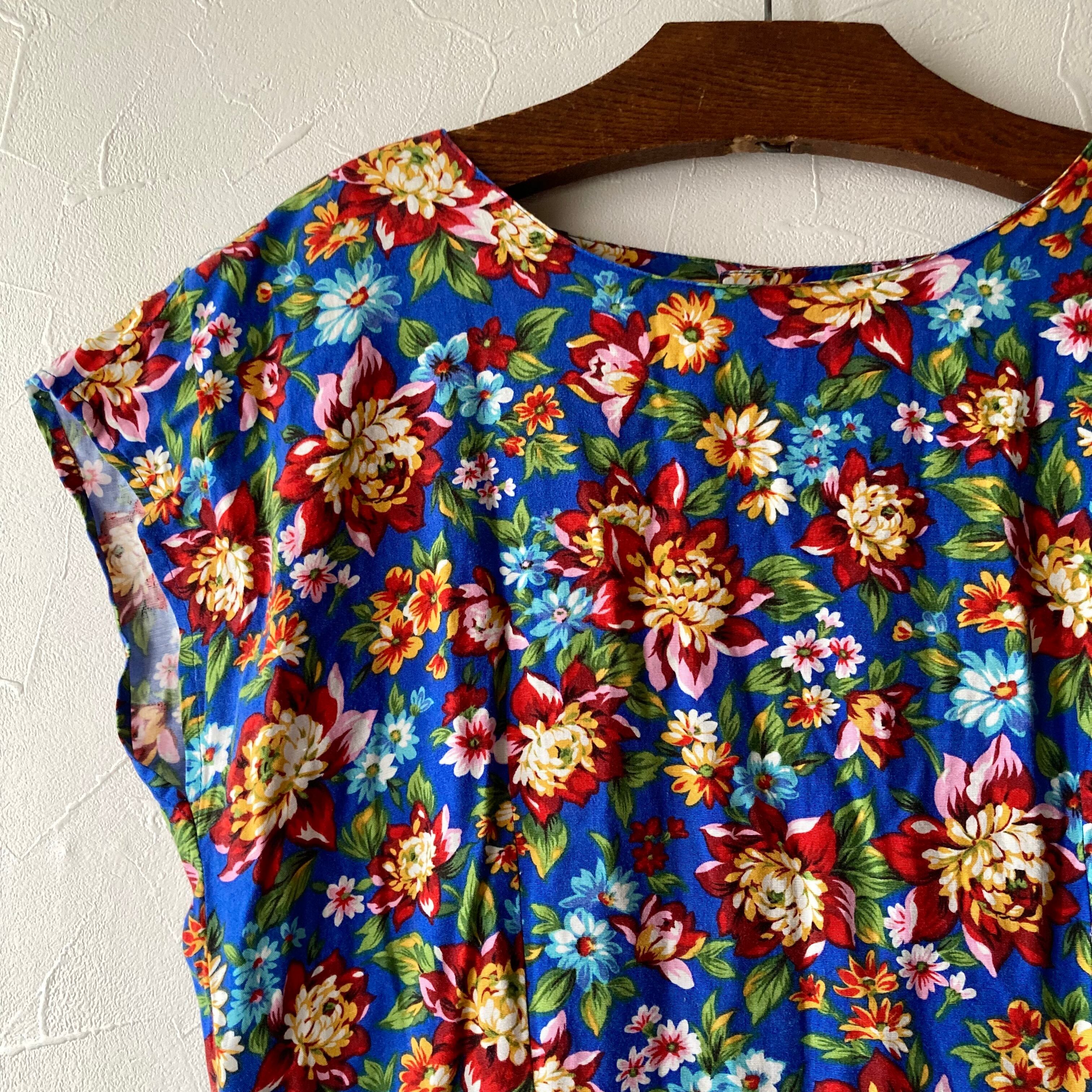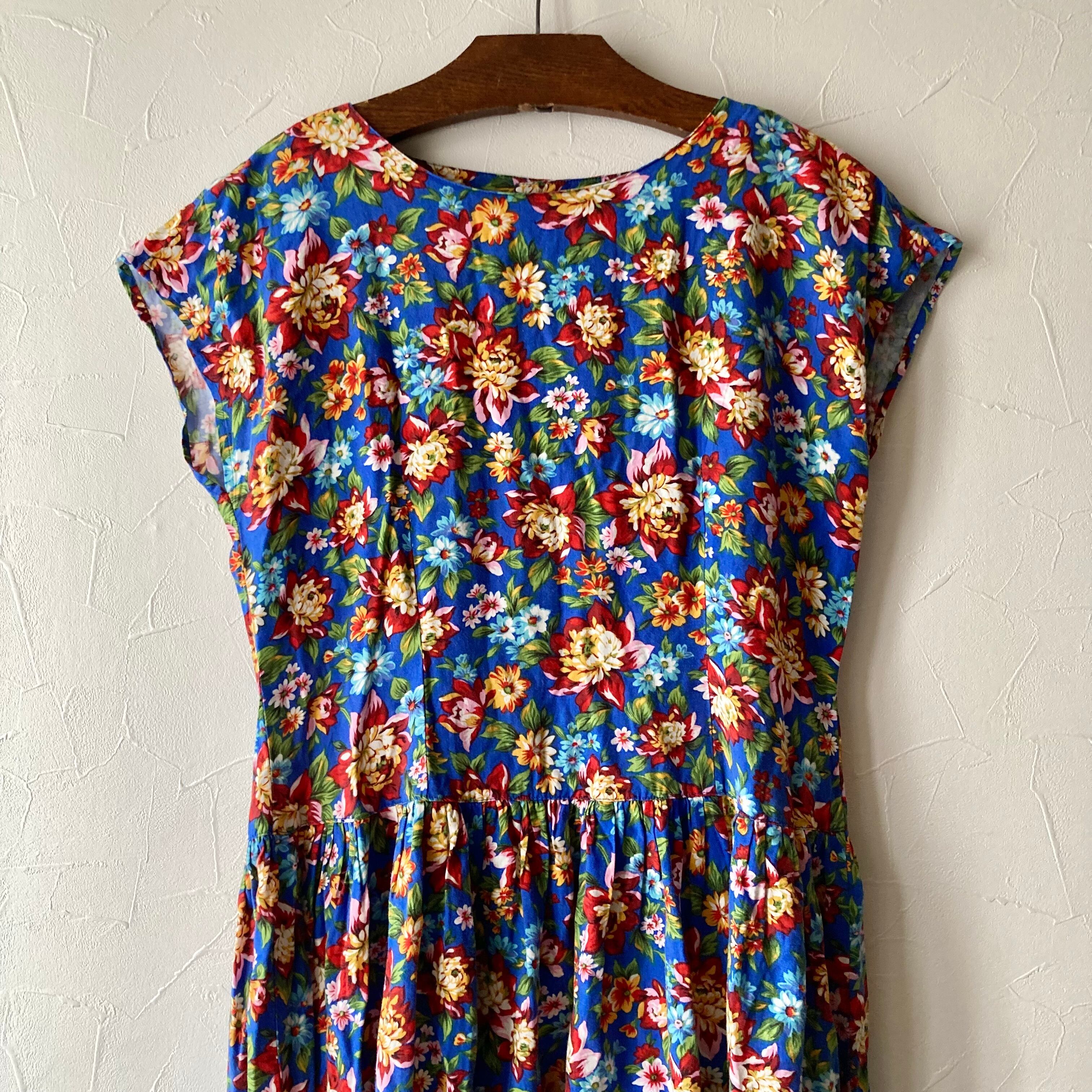 鮮やかな花柄模様の後ろボタンのワンピース◯ フレンチスリーブですっきりとしたシルエット。後ろはリボンを結んで青いボタンも可愛いです。