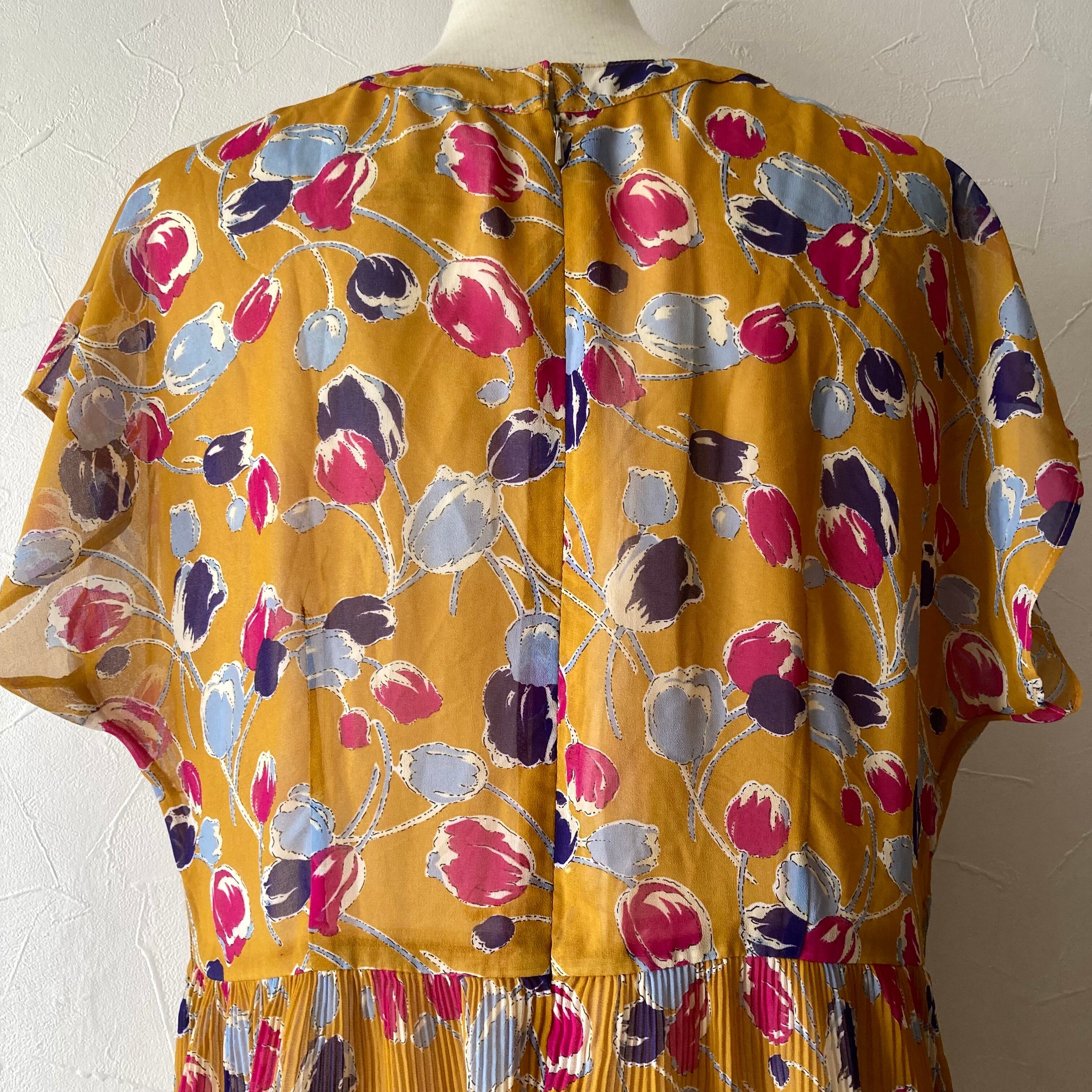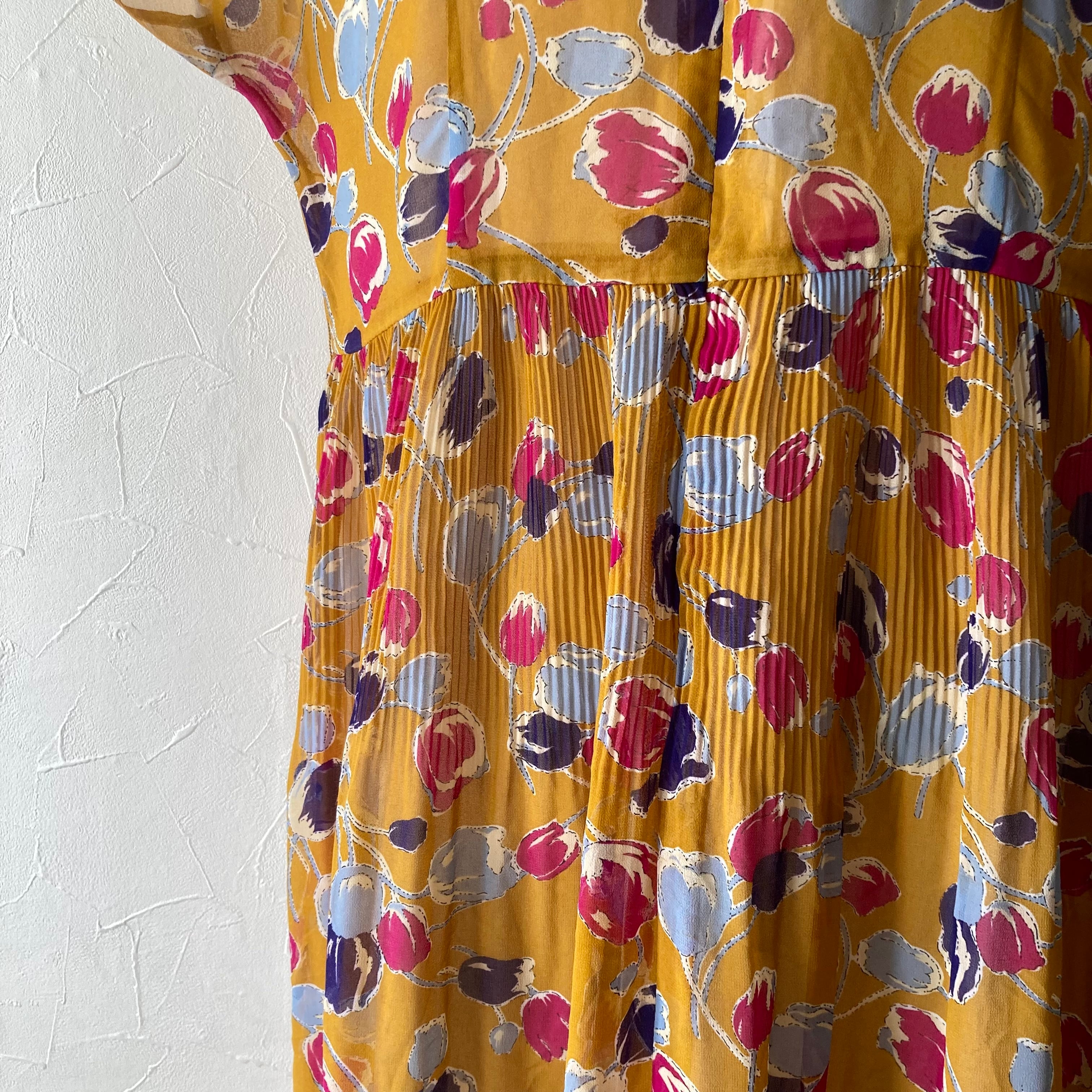 古着らしい色味と花模様がレトロで可愛いワンピースです。フレンチスリーブで綺麗なシルエット、スカート上部はプリーツデザインでふわりと可愛いです。