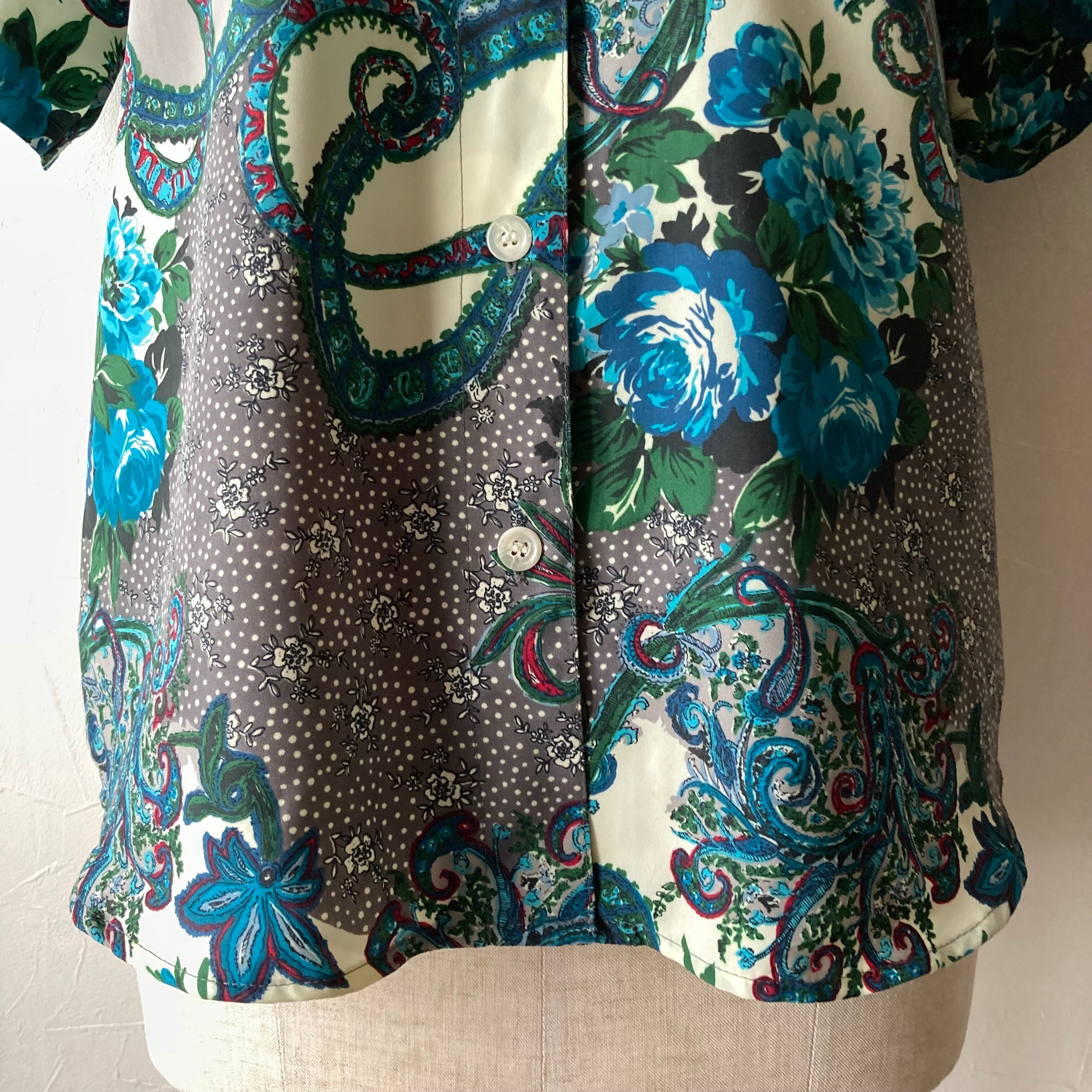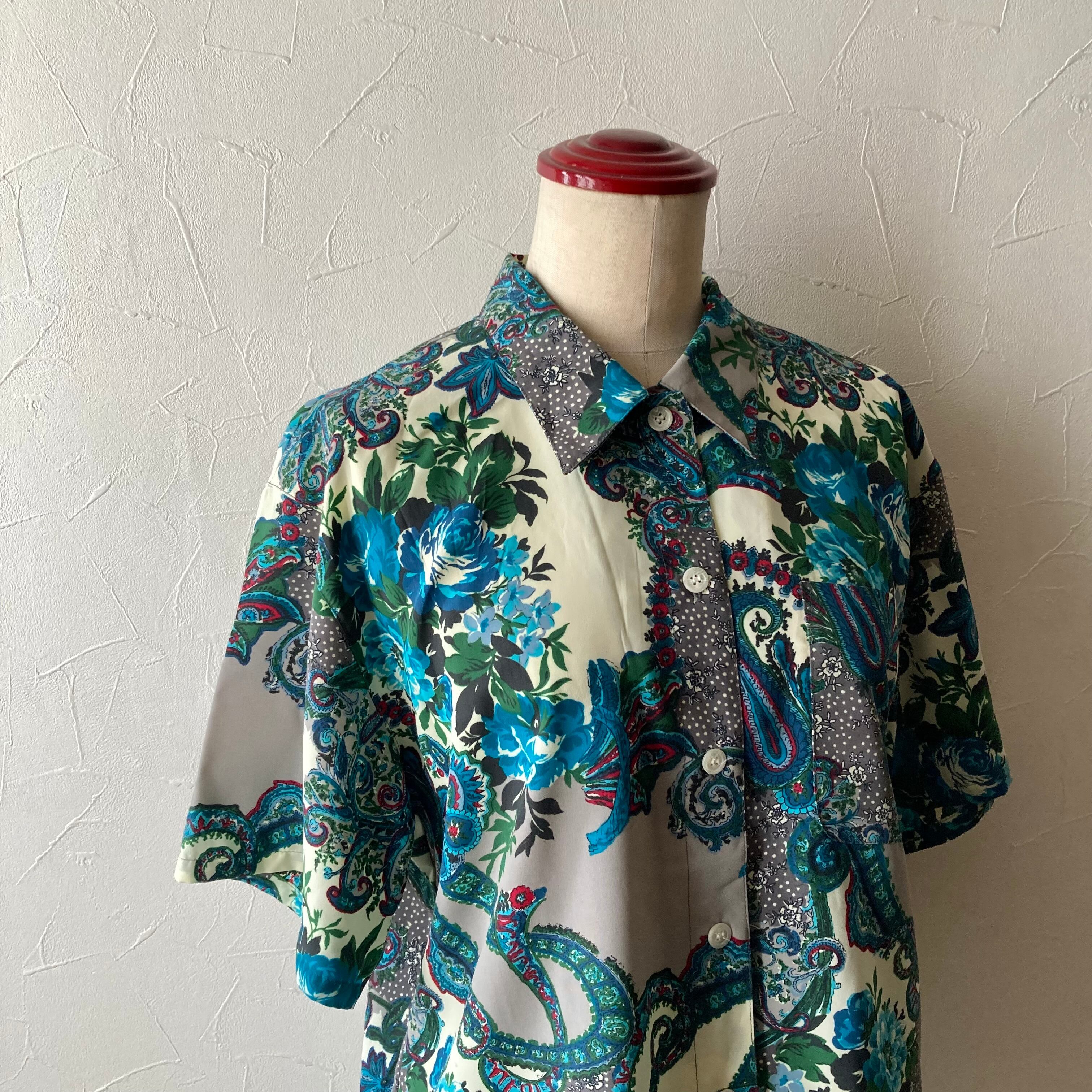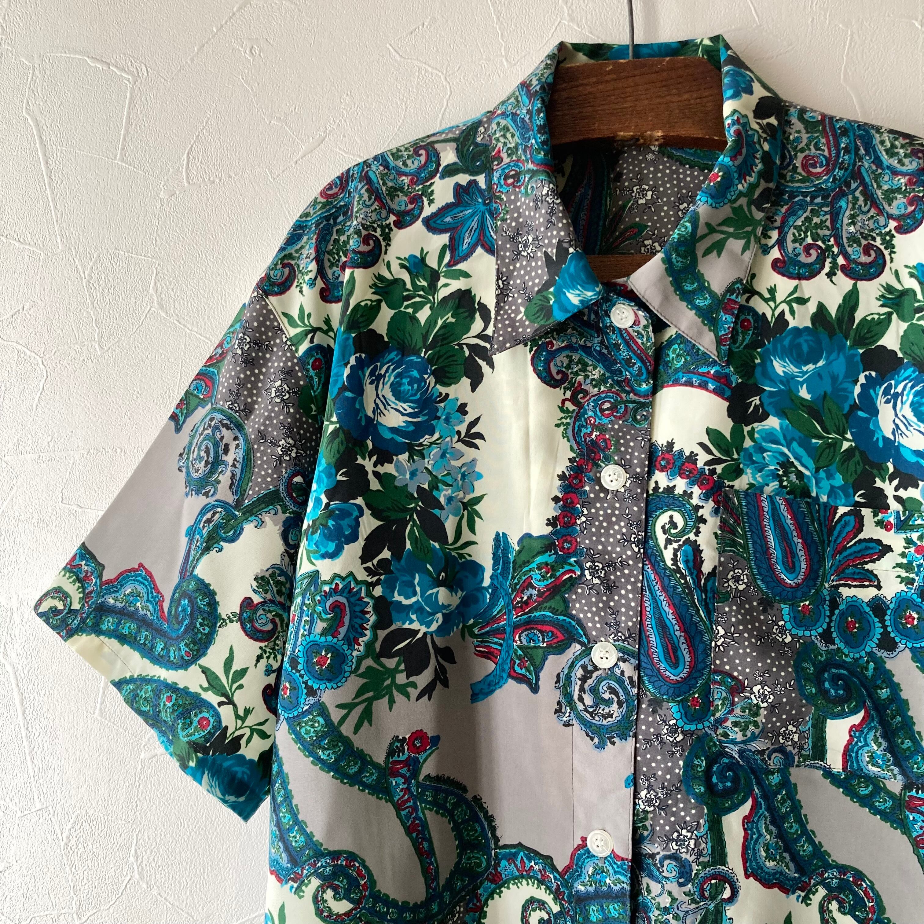ブルーの花柄とペイズリー柄が素敵なシャツです◯少しゆったりめが着やすく古着らしい柄が個性的で夏にぴったりな色味もよいです。