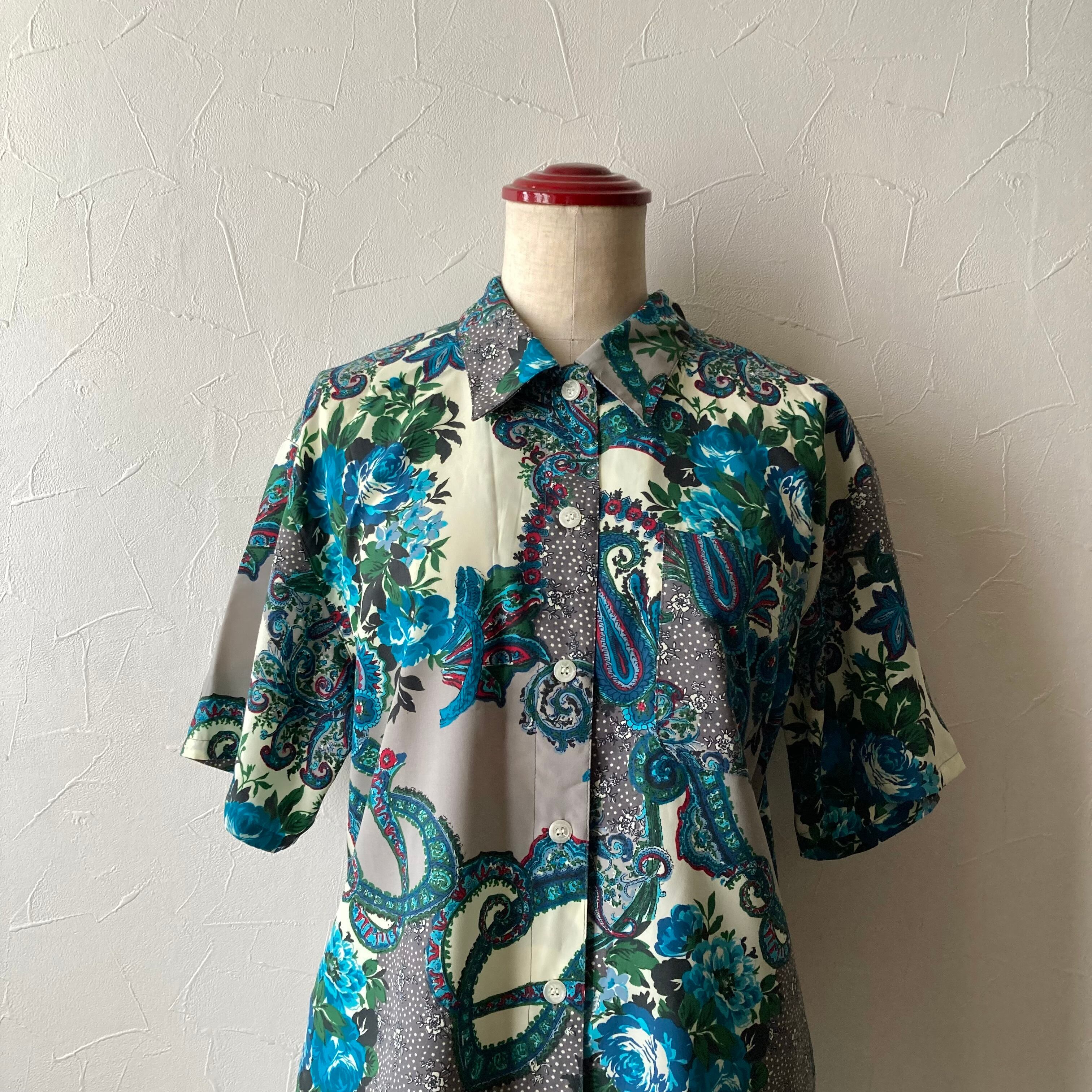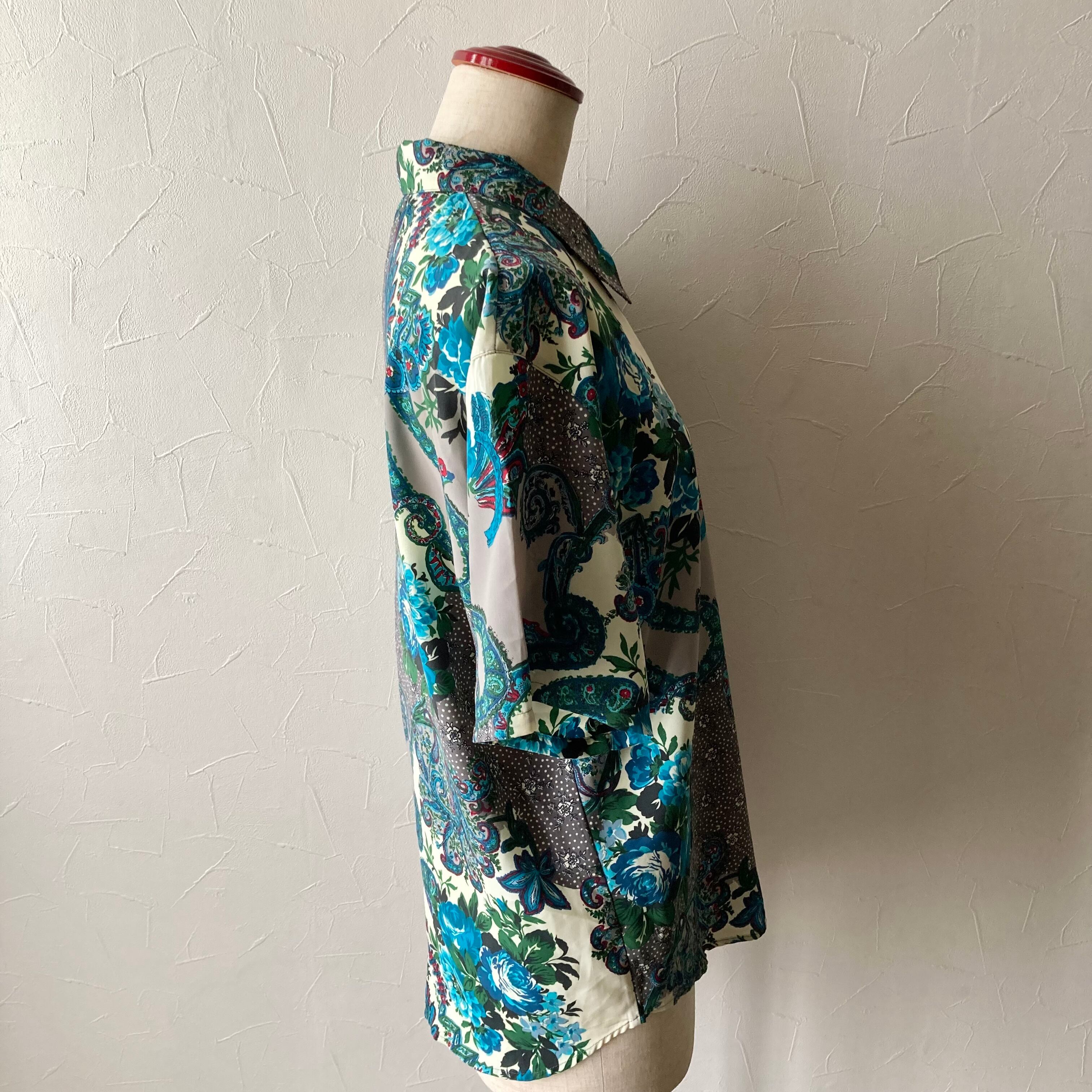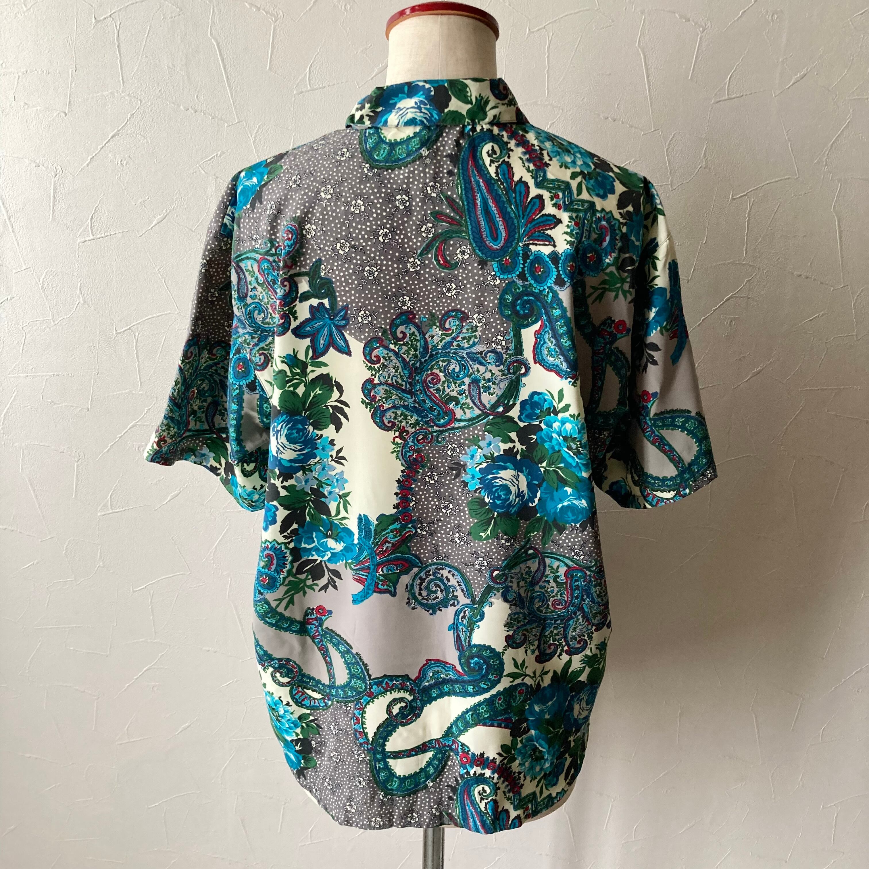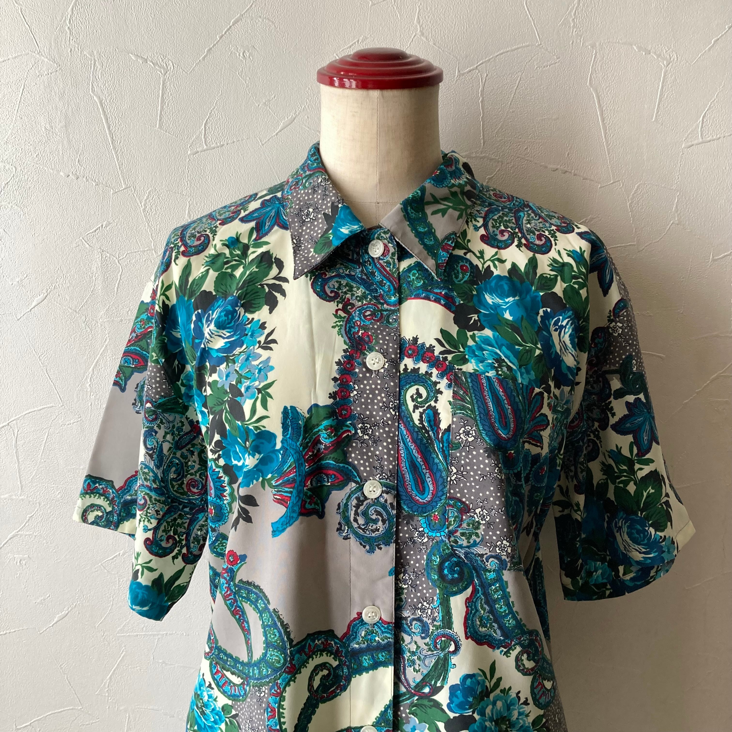 ブルーの花柄とペイズリー柄が素敵なシャツです◯少しゆったりめが着やすく古着らしい柄が個性的で夏にぴったりな色味もよいです。