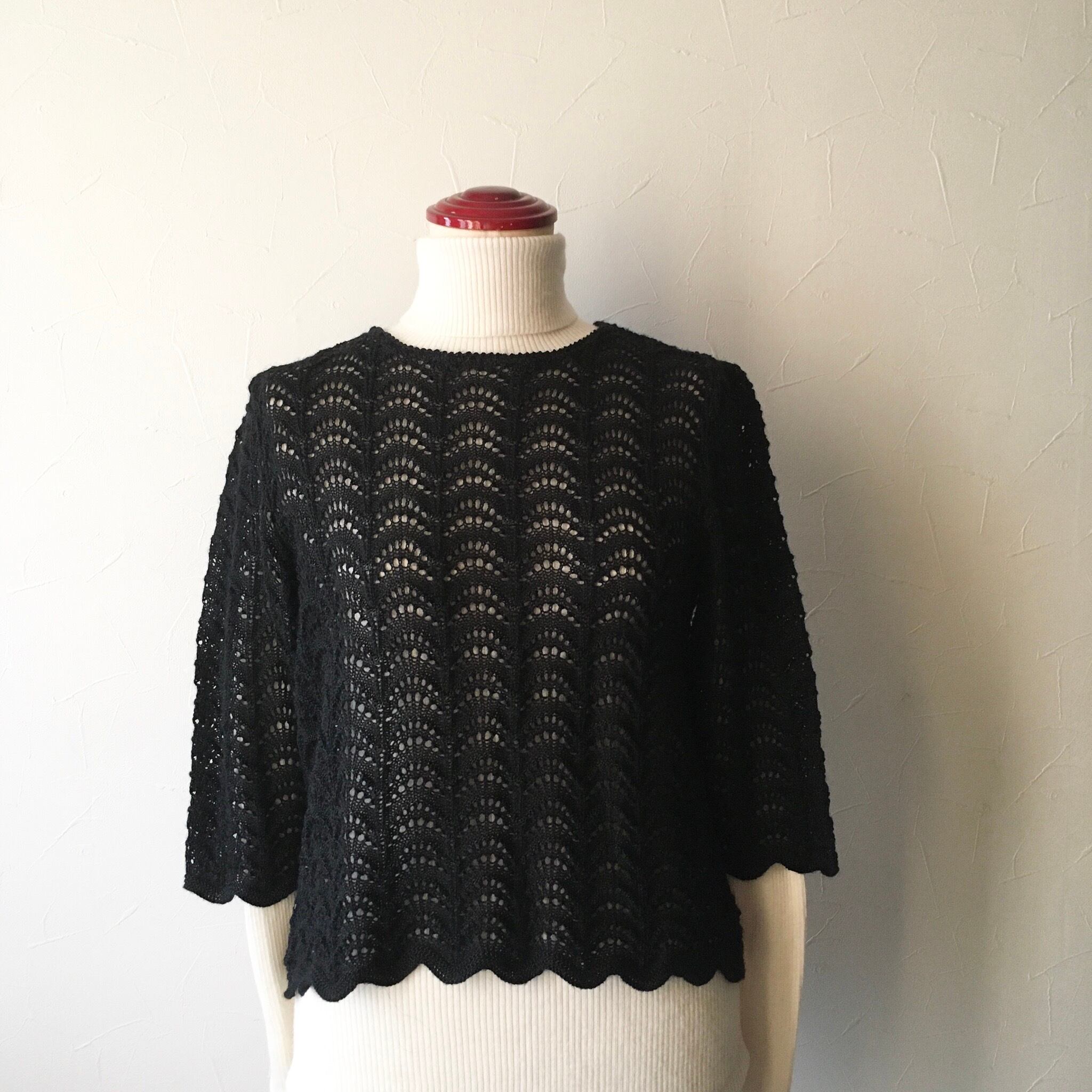 裾のスカラップなど可愛らしく編まれた七分袖のニットトップスです。