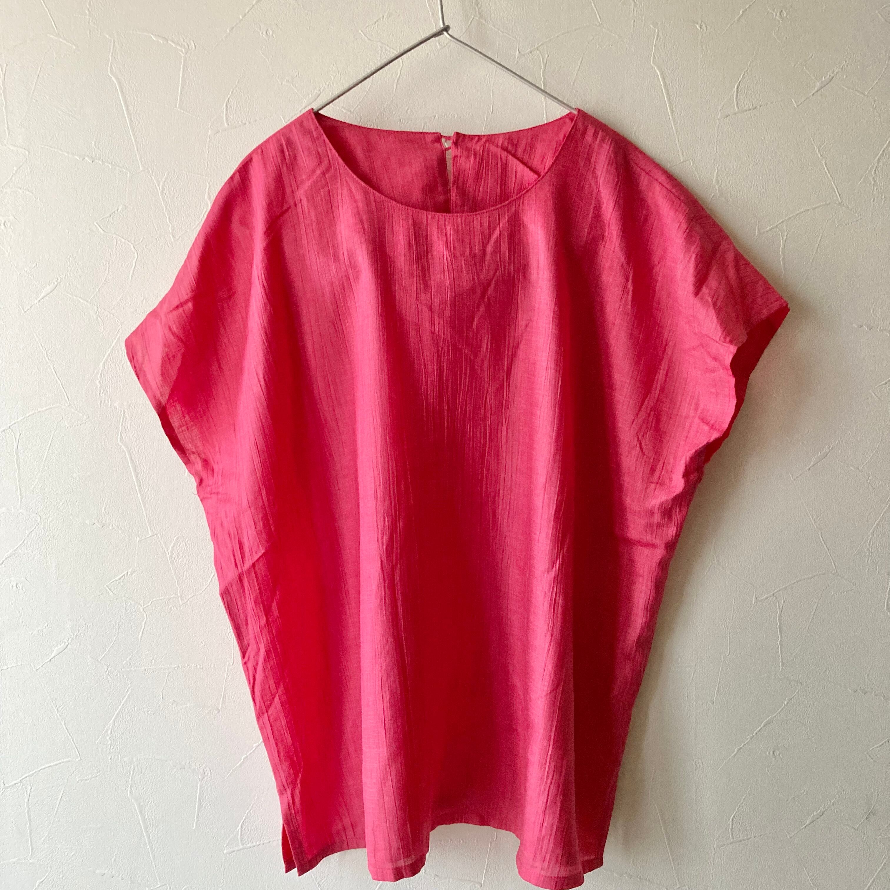 ヴィヴィットなピンクが目を惹くシワ加工されたフレンチスリーブトップスです◯