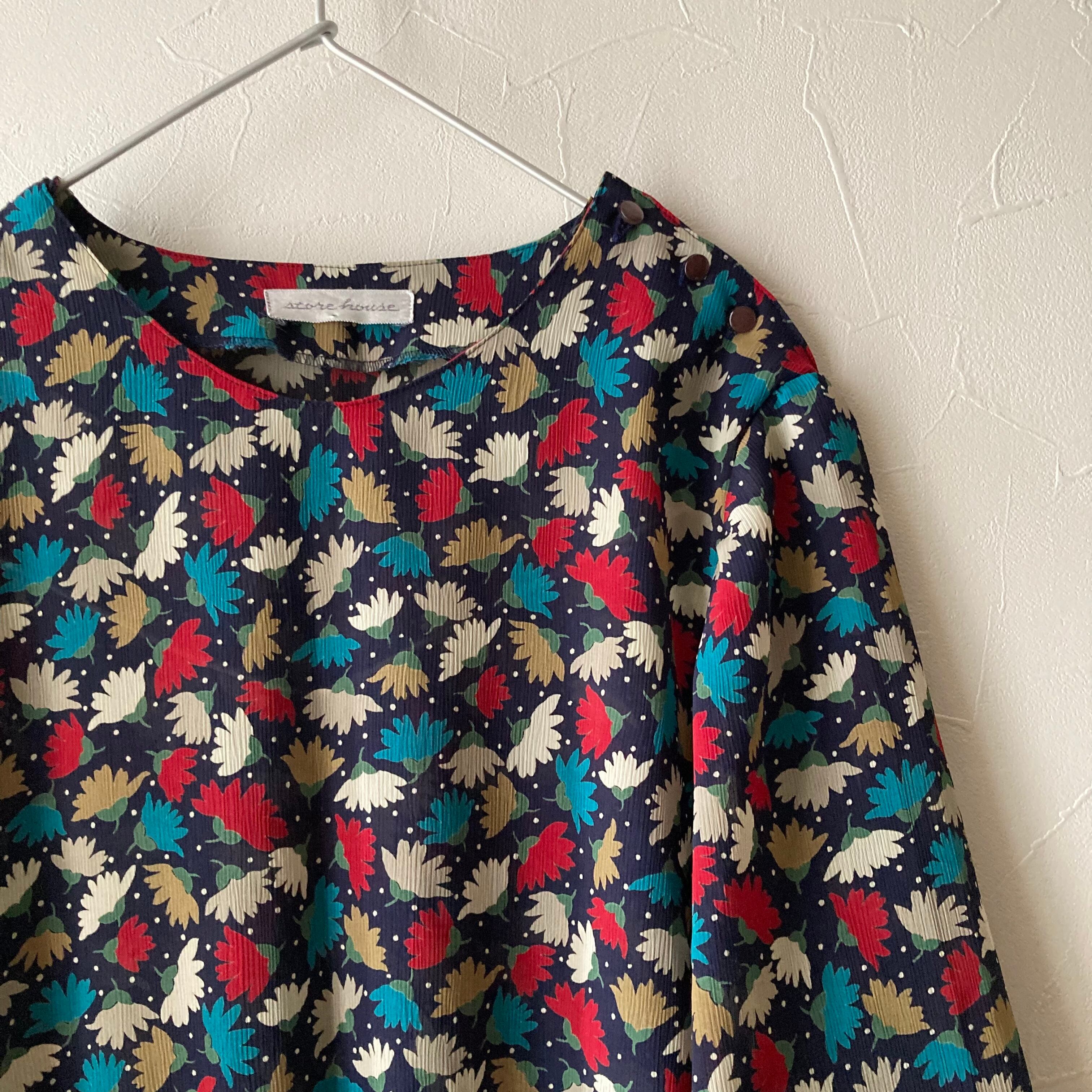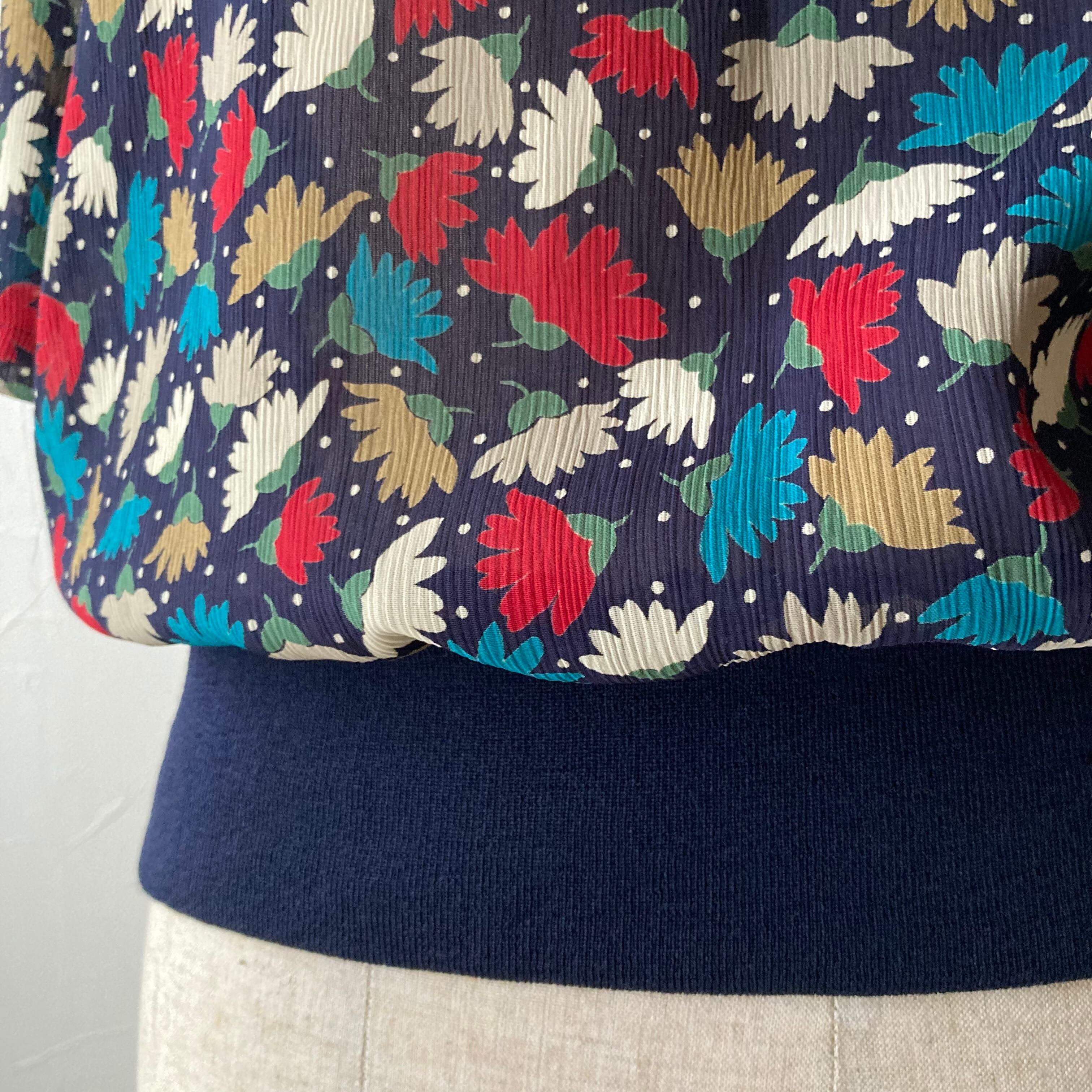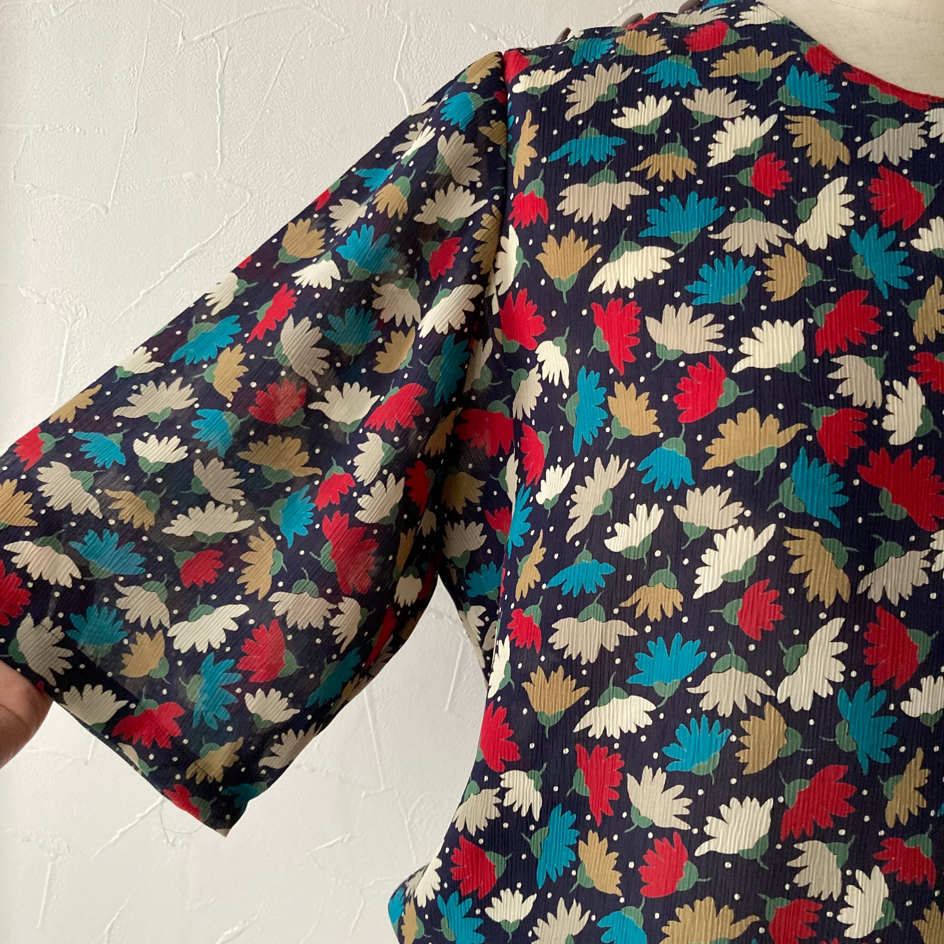 ネイビー花柄×ドットトップス 昭和レトロ 古着 used vintage