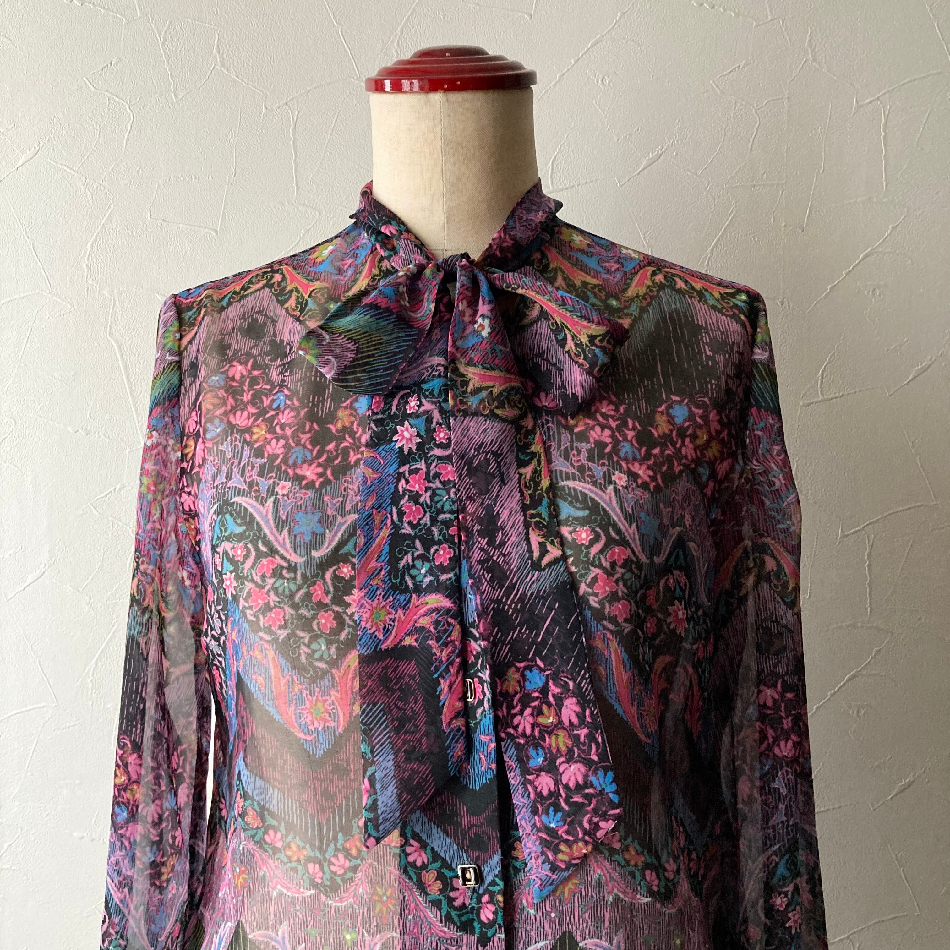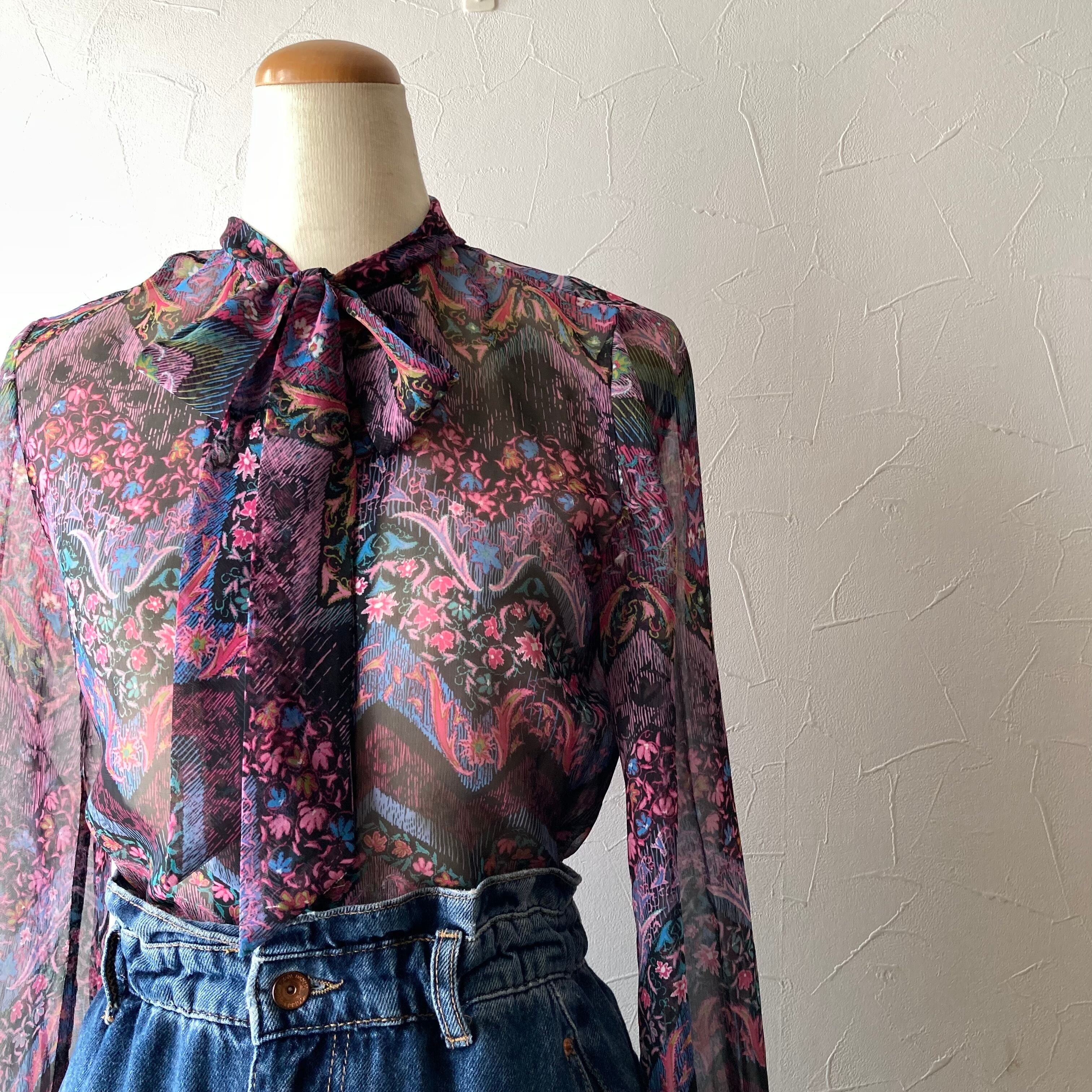 ボタニカル柄リボンシアーブラウス 昭和レトロ 古着 used vintage