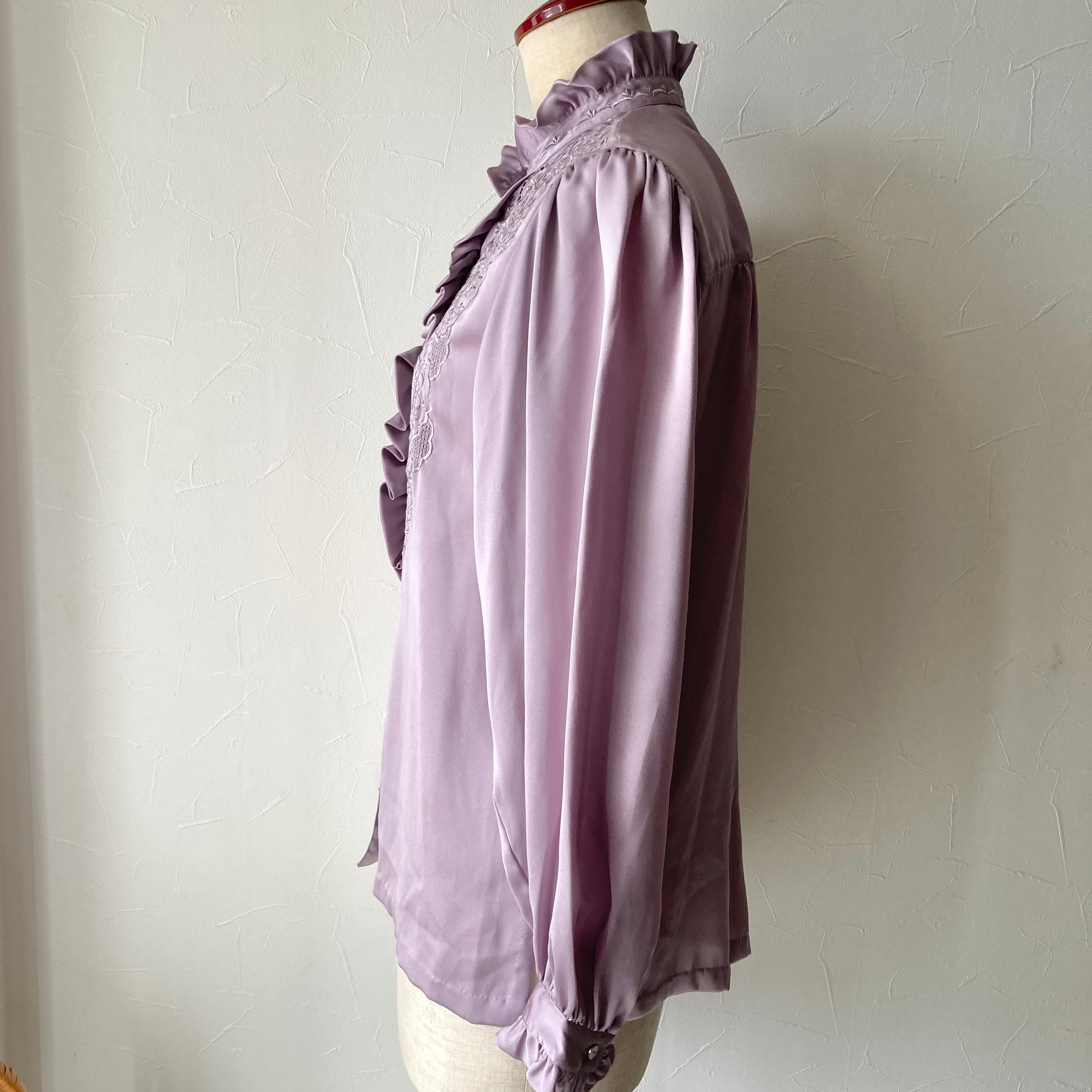 くすみラベンダー刺繍フリルブラウス 昭和レトロ 古着 used vintage