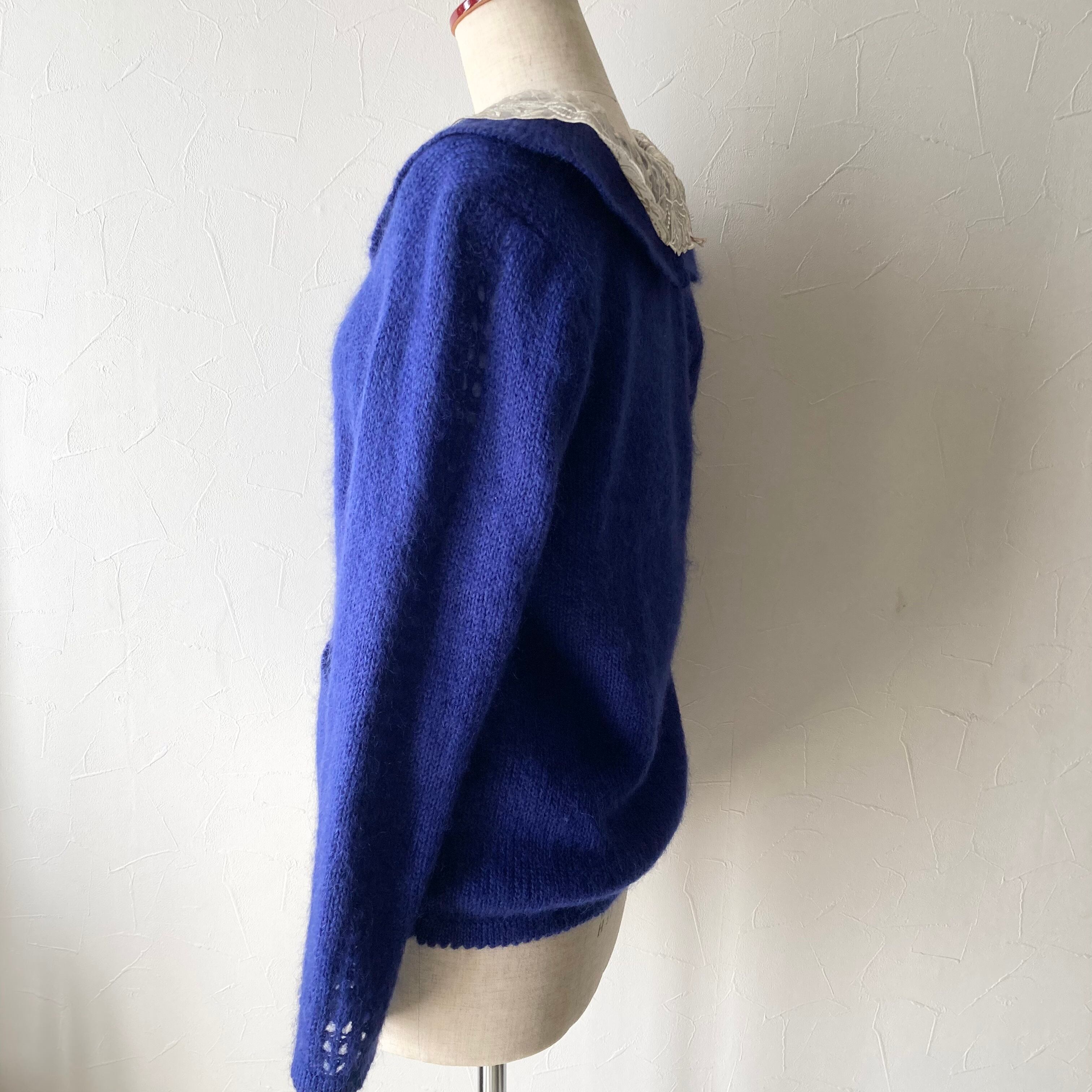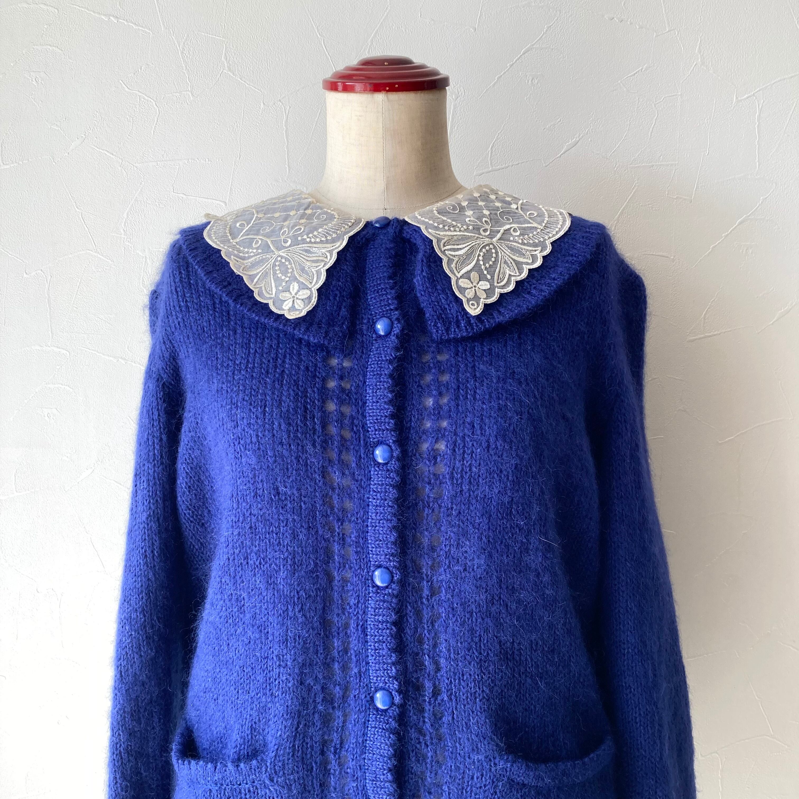 可愛らしい青色にレース付きの襟がチャームポイントのレトロなニットカーディガンです◯