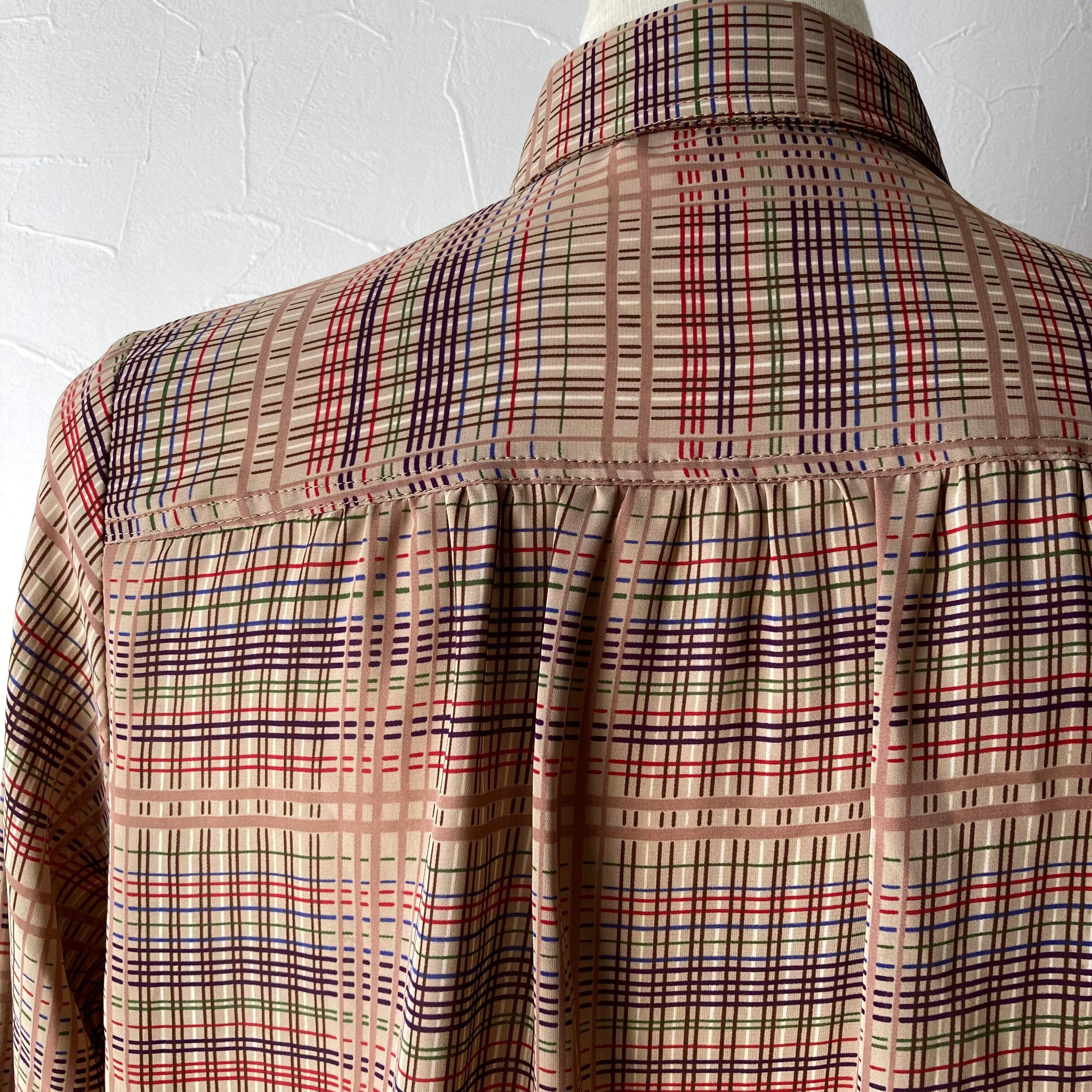 ベージュ色に、数種類の色のラインがチェックに合わさった色合いが素敵で、シンプルながらに魅力的なレトロブラウスです◯
