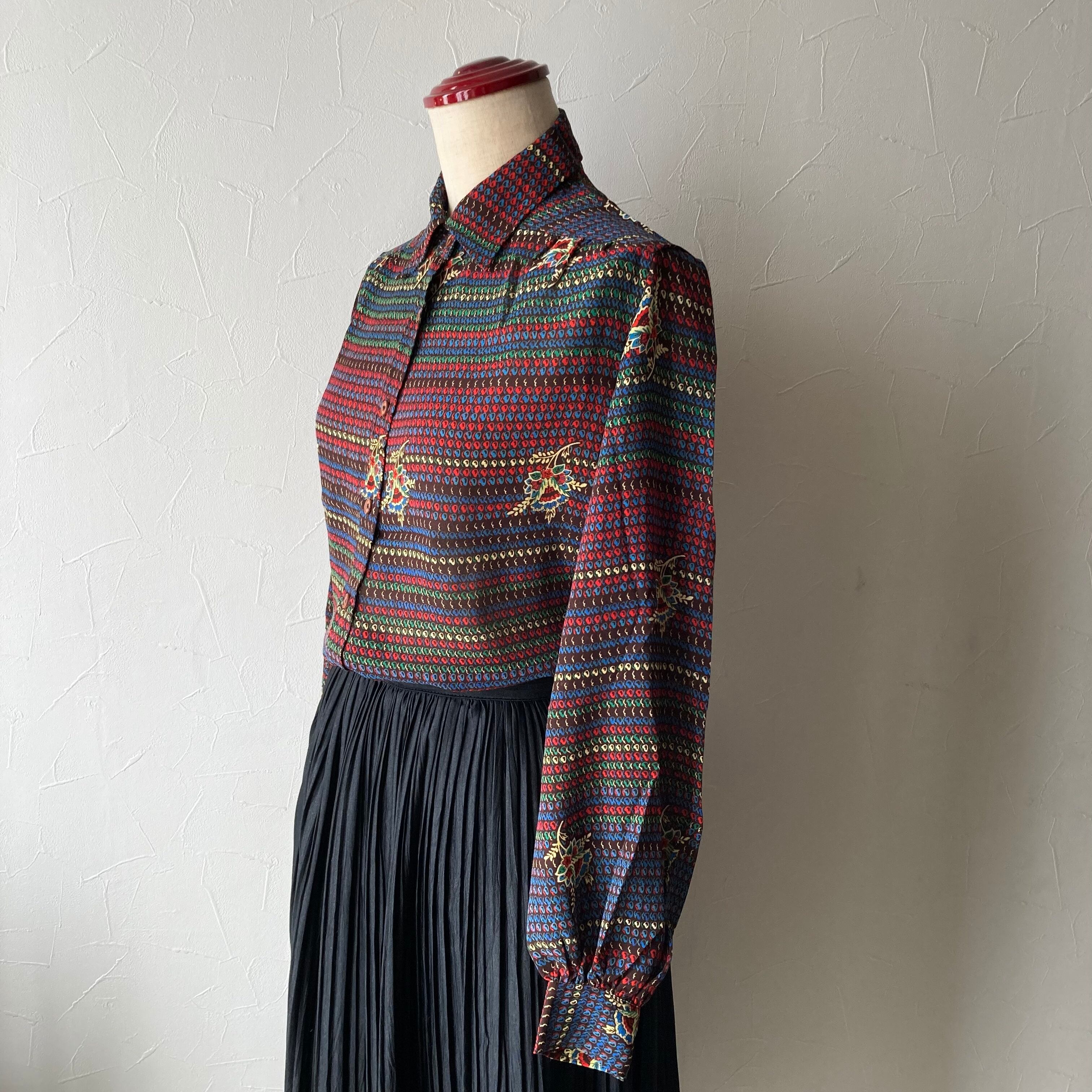 グラデーションのように綺麗な色合いにレトロな花のイラストが可愛らしいブラウスです◯