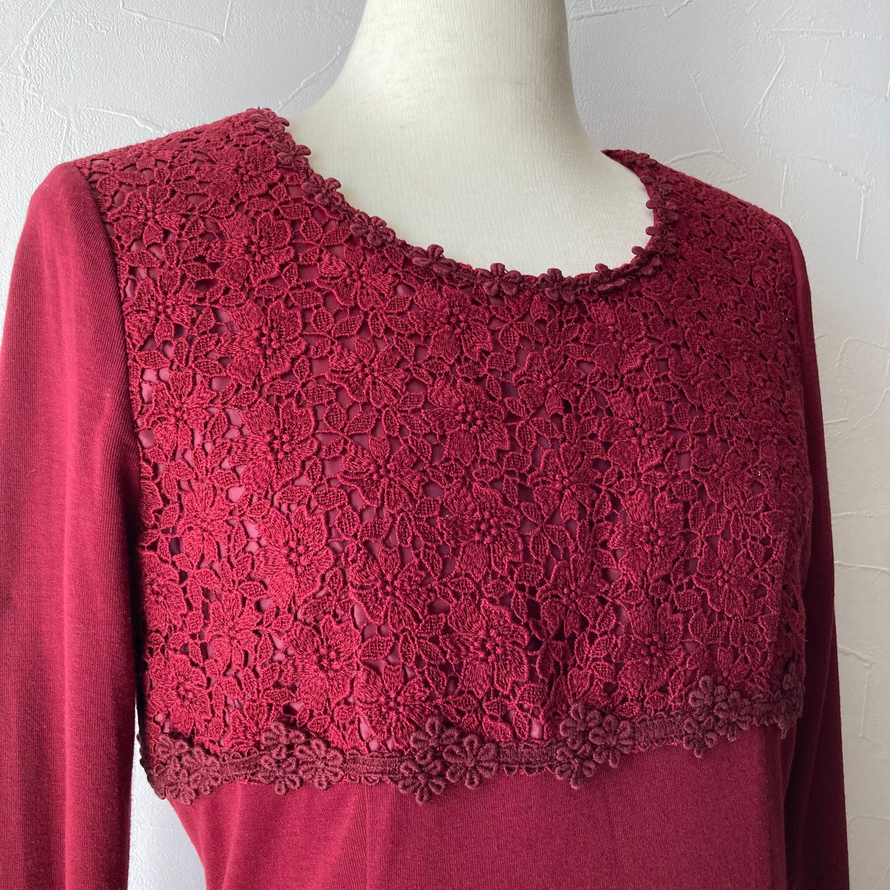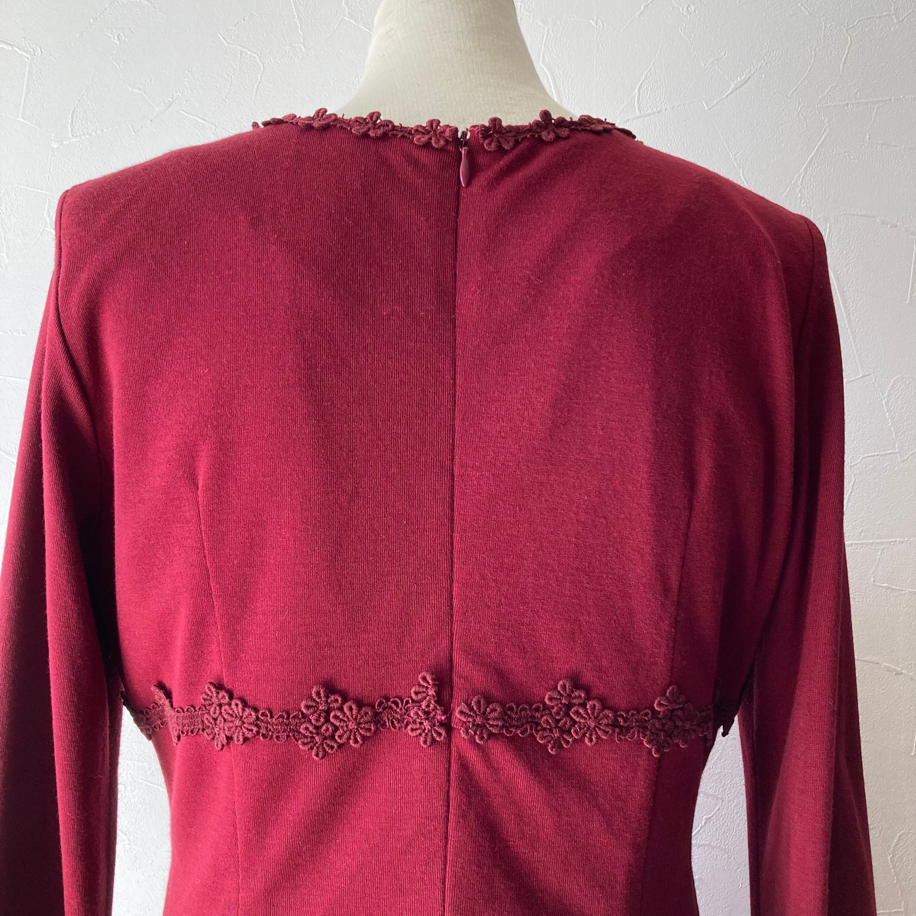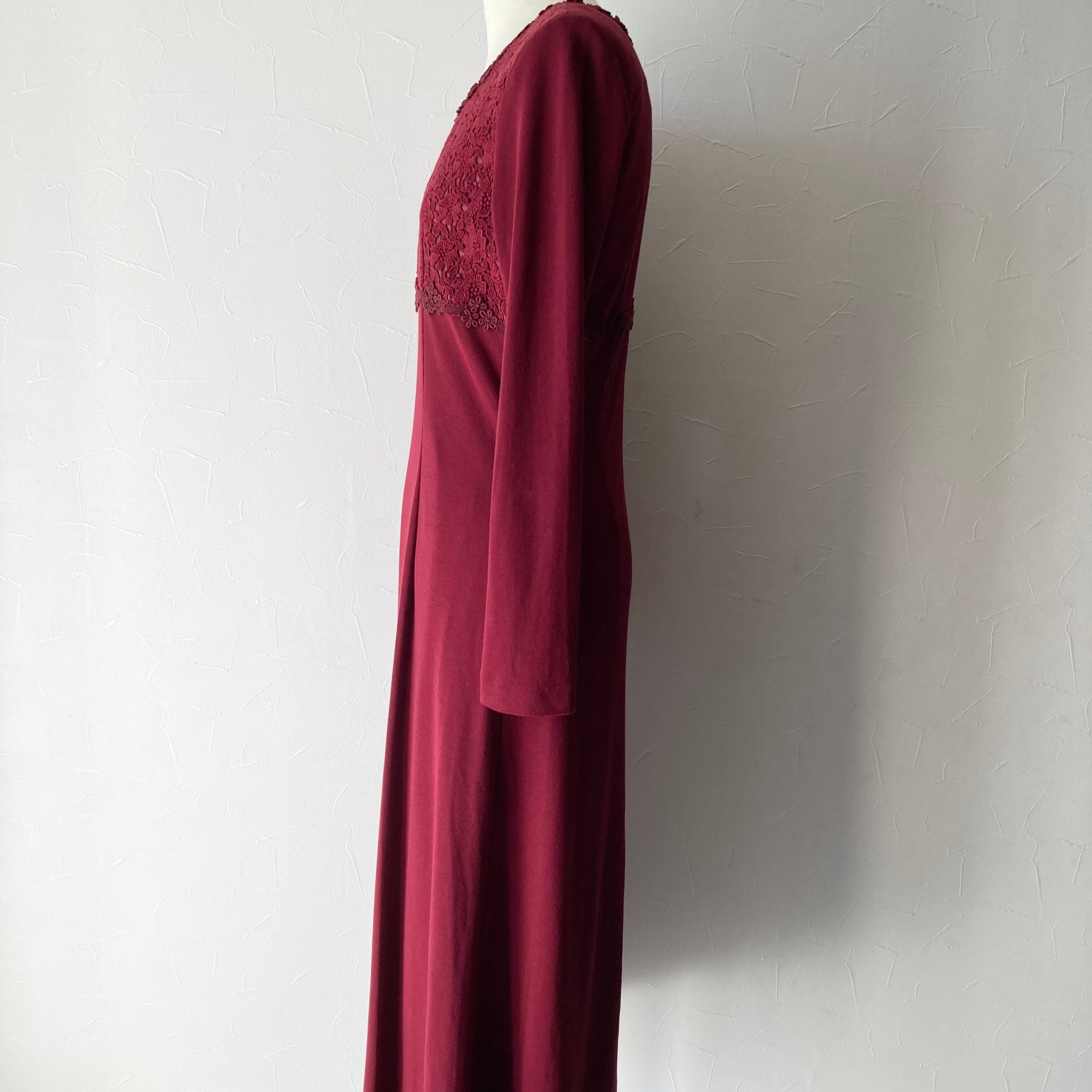 えんじ色花刺繍セミロングワンピース 昭和レトロ 古着 used