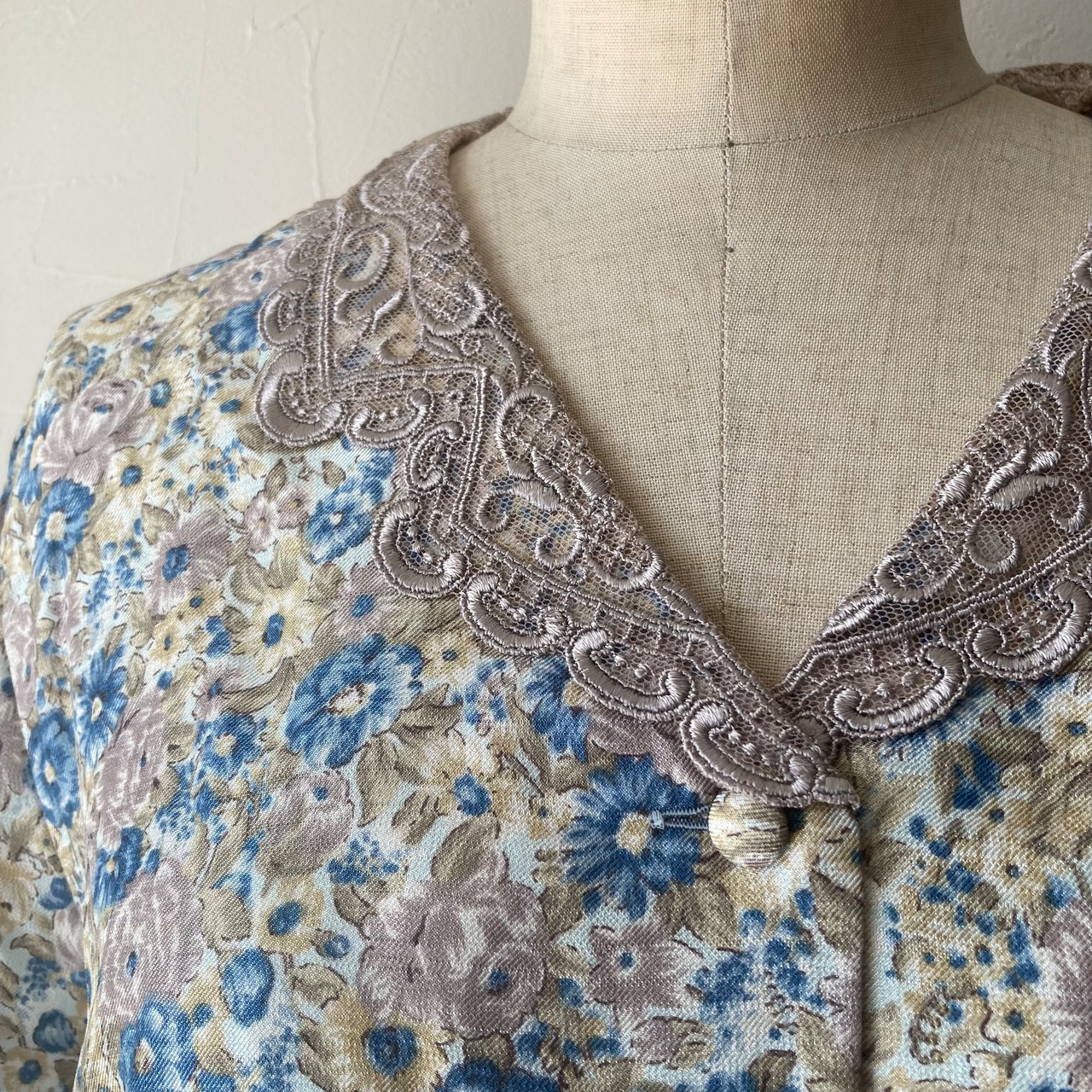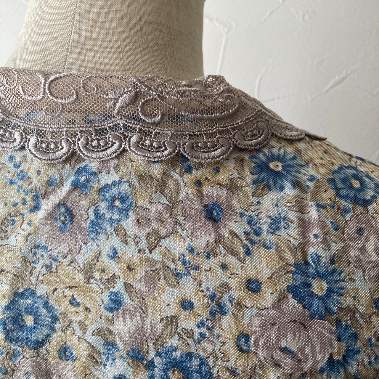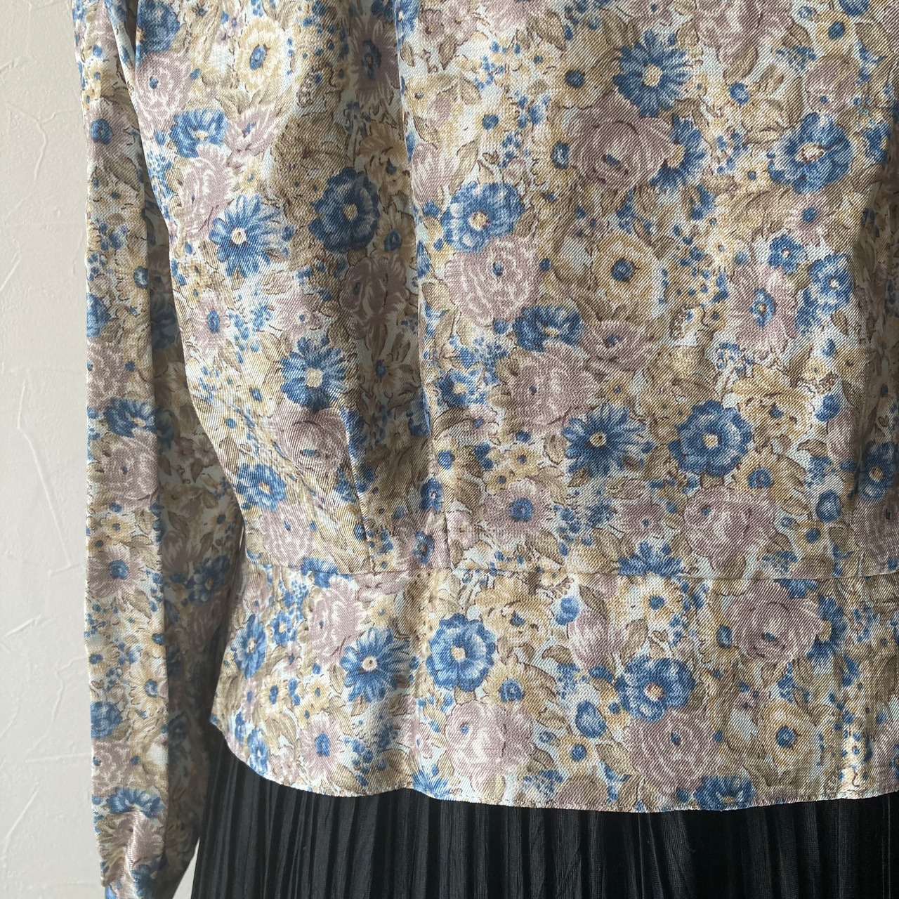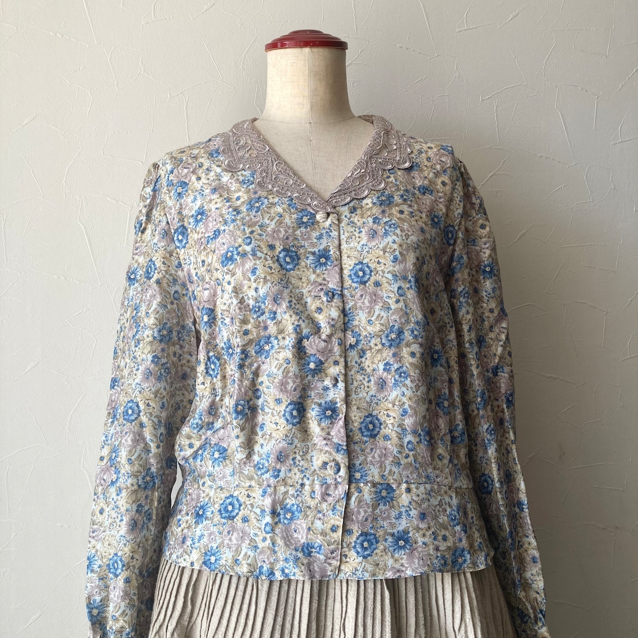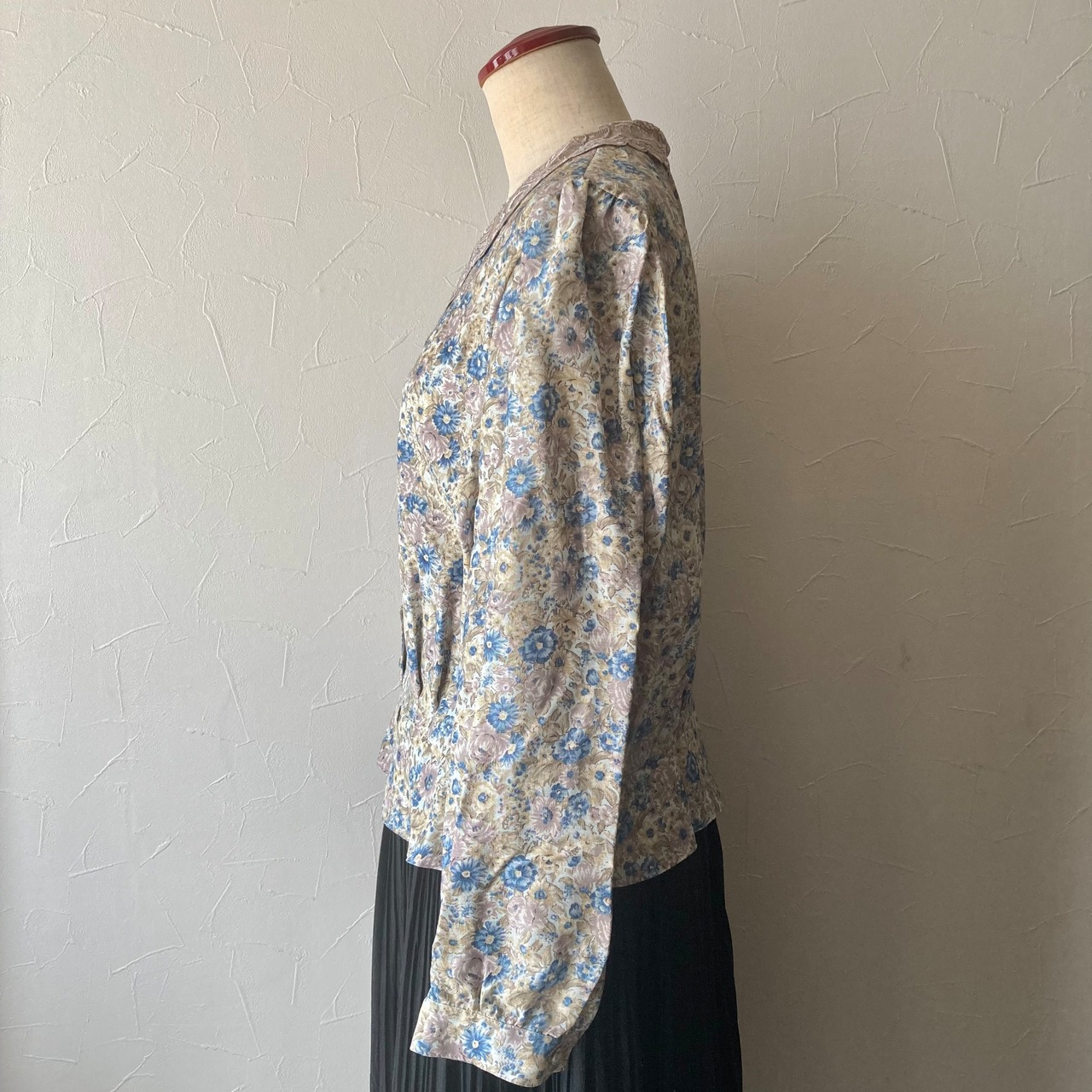 ベージュのレトロな襟に淡い色合いの花柄が可愛らしいブラウスです◯