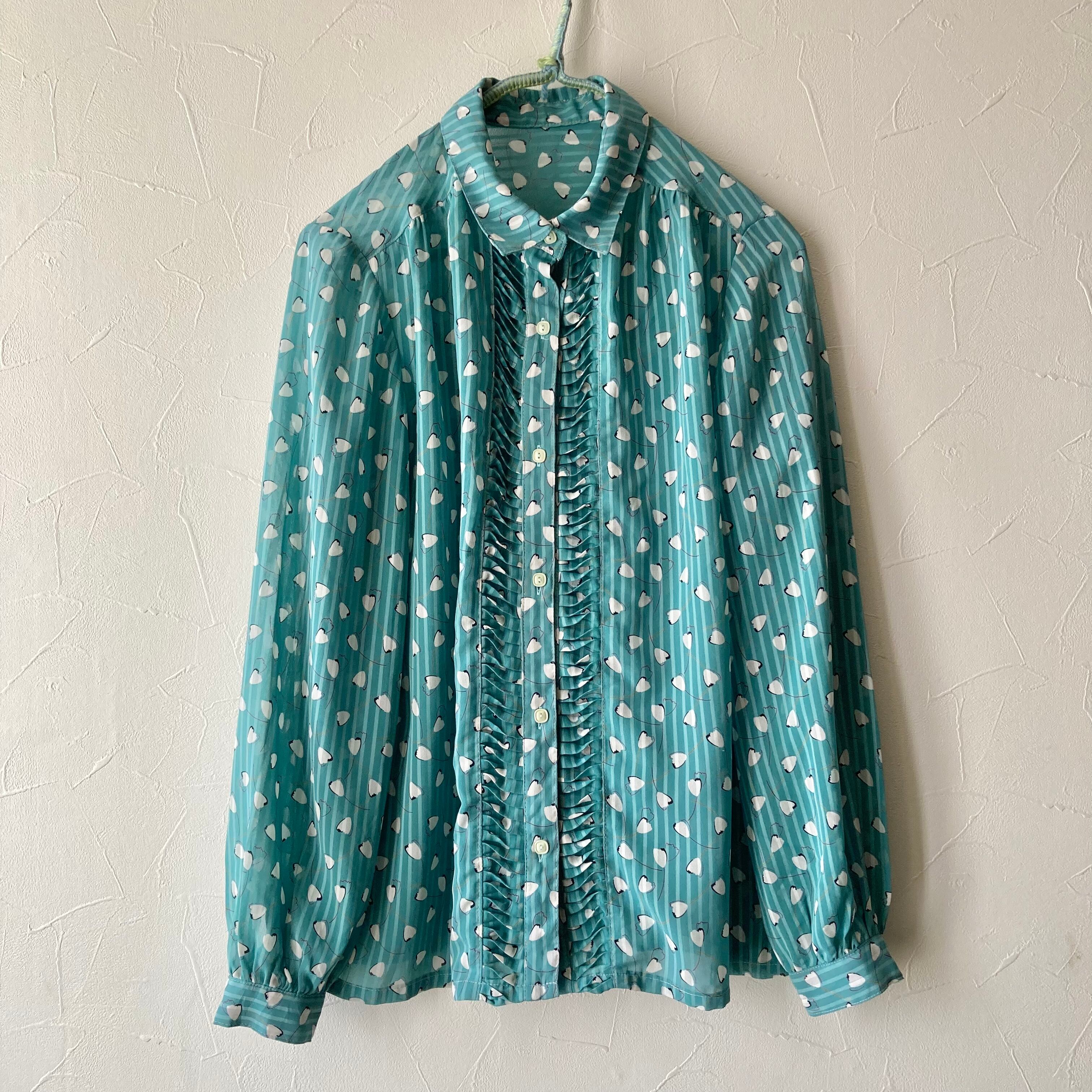 水色の花模様デザインブラウス 昭和レトロ 古着 used vintage