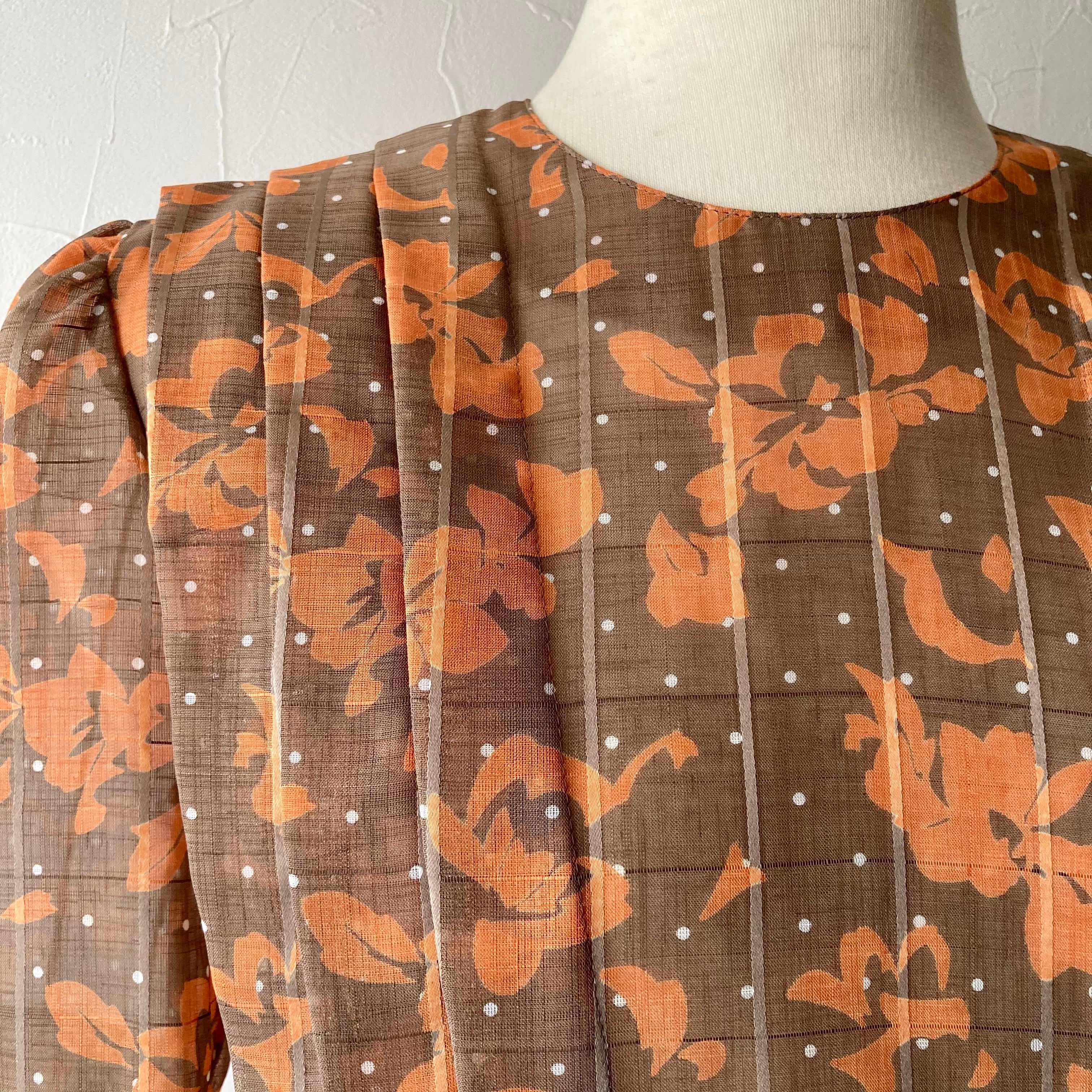 ライトブラウンにオレンジの花びらが舞っているようなプリントに白いドット柄がレトロなワンピースです◯